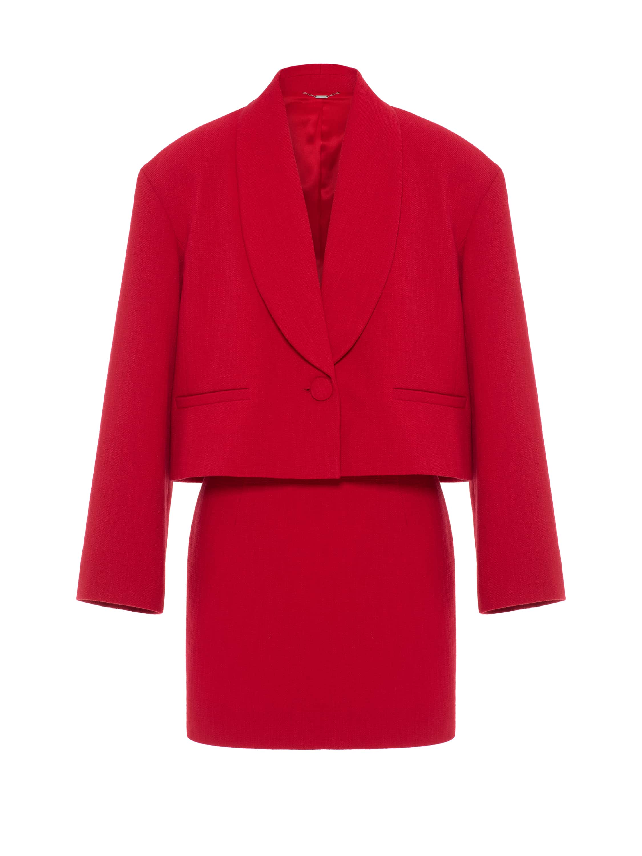 A bright red two-piece suit consists of a cropped single-breasted jacket with a shawl collar and a mini skirt. The set from the new collection can become a spectacular everyday option that will allow you to advantageously showcase your figure.