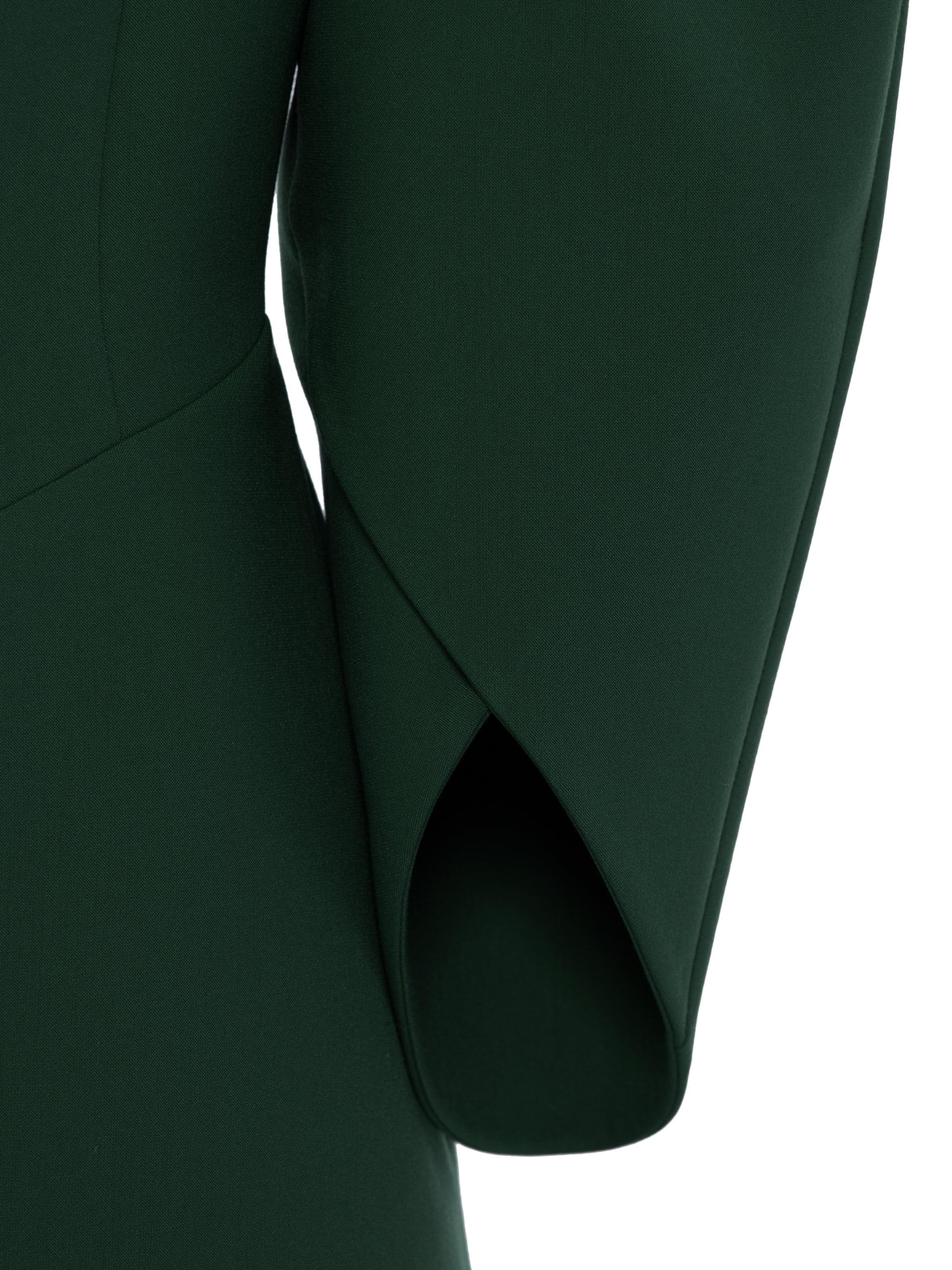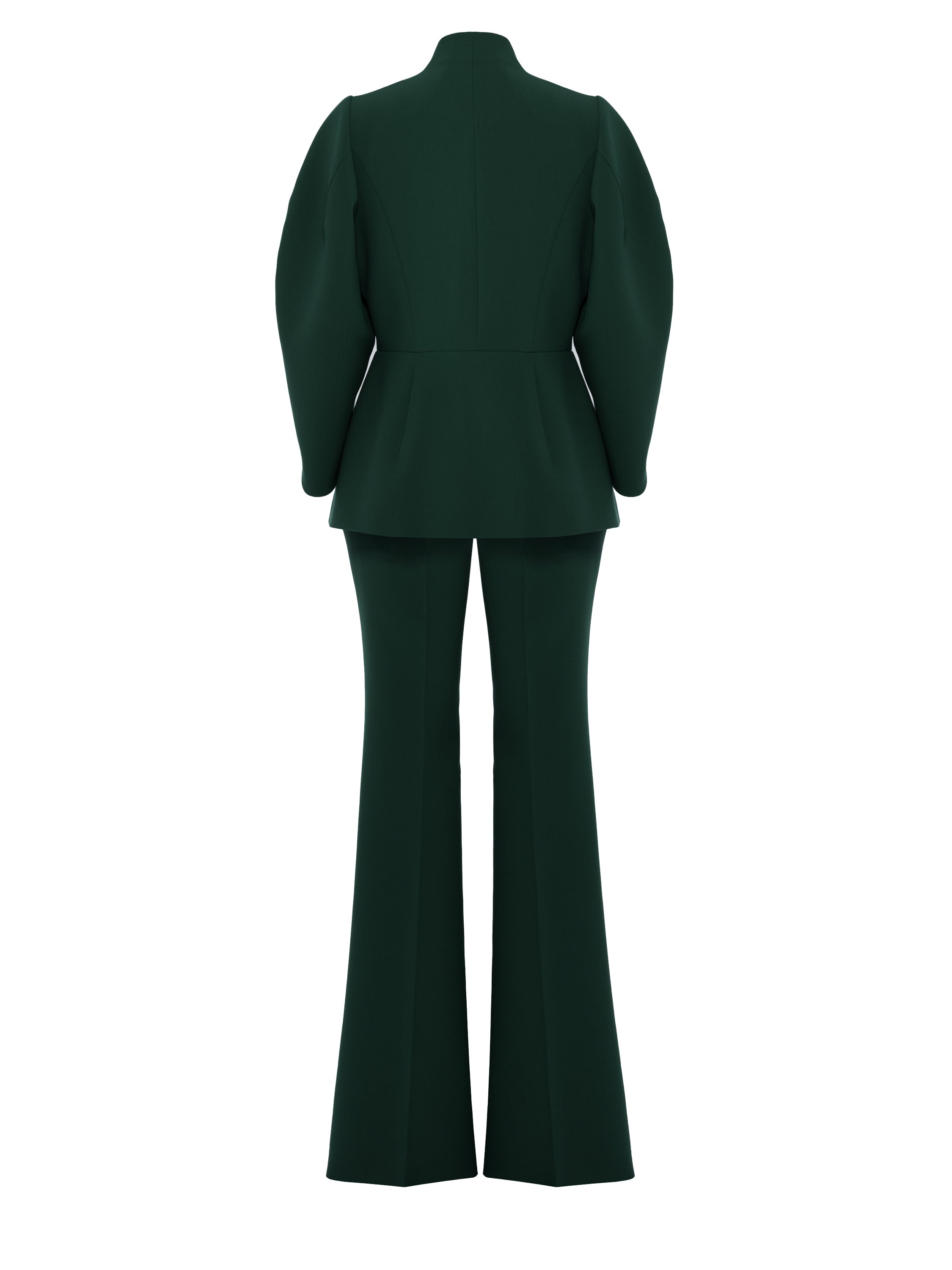 The green two-piece suit consists of a single-breasted jacket and flared, crease-pressed trousers. The fitted jacket is complemented by voluminous sleeves and shaped seams. The evening set in oriental style looks original and allows you to show the maximum femininity. Dense cotton blend was used for the piece.
