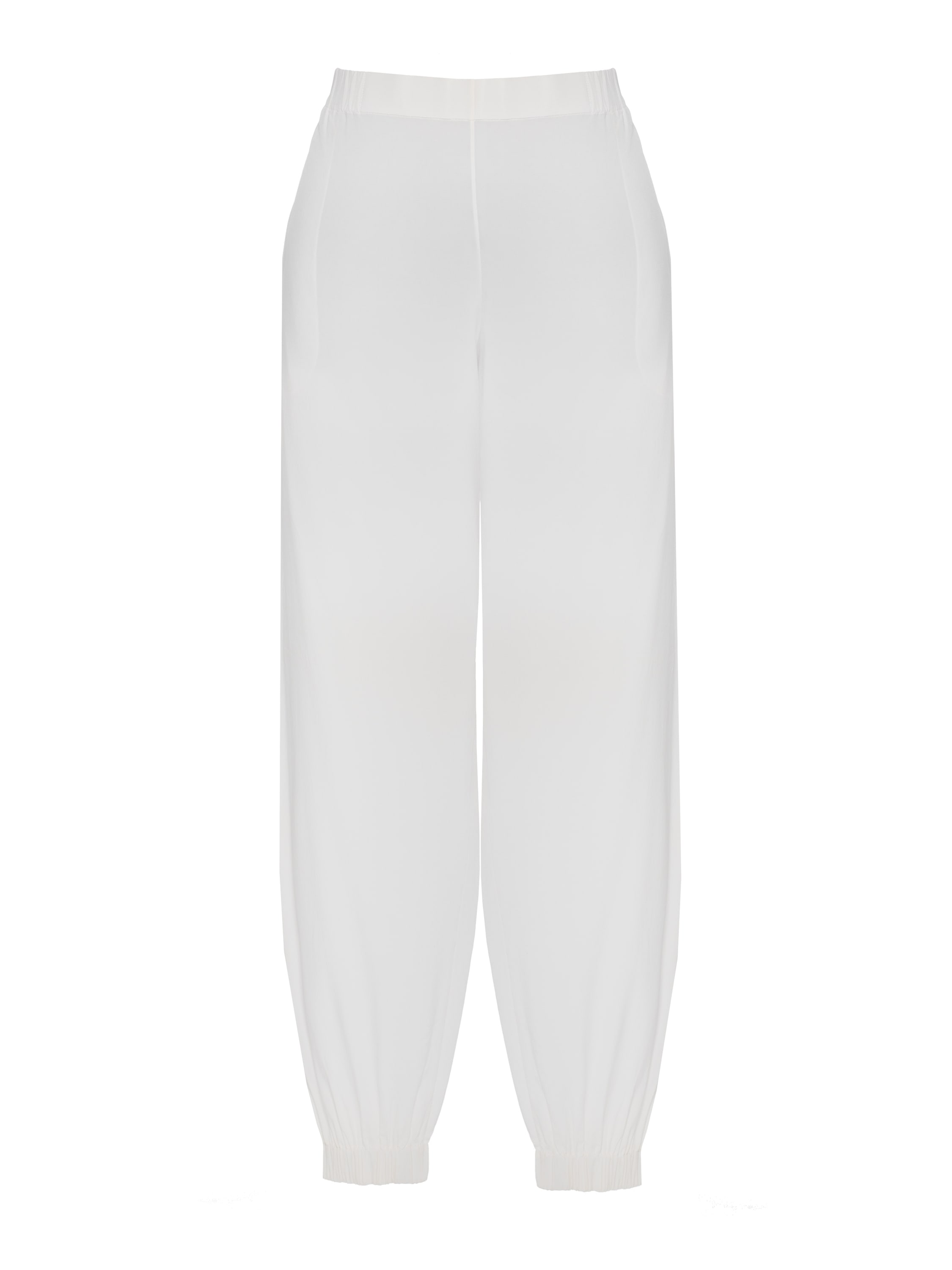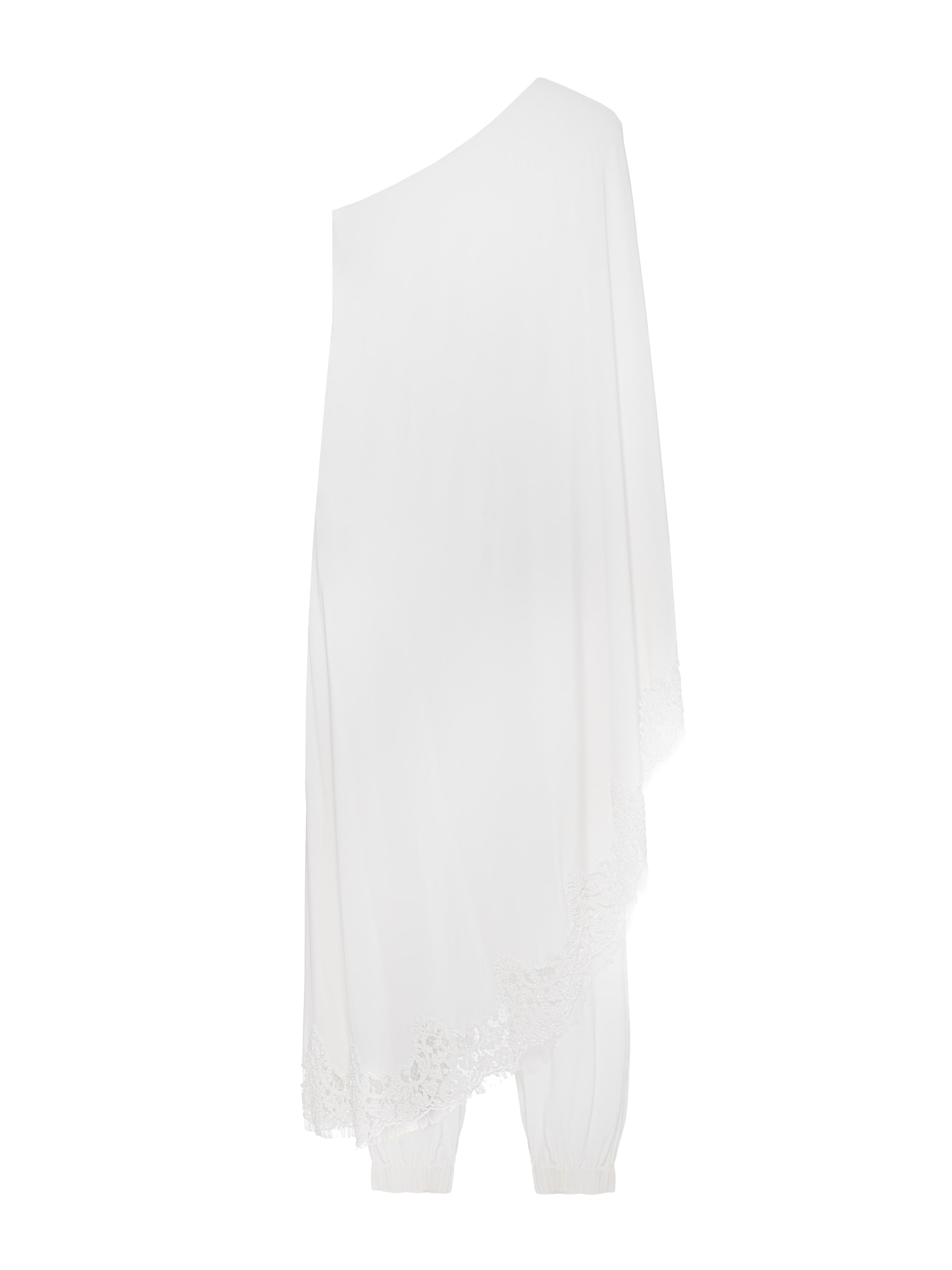 For the set of a one‑shoulder tunic and joggers, white silk fabric was used. The asymmetric cut is accentuated with delicate lace and bead embroidery.