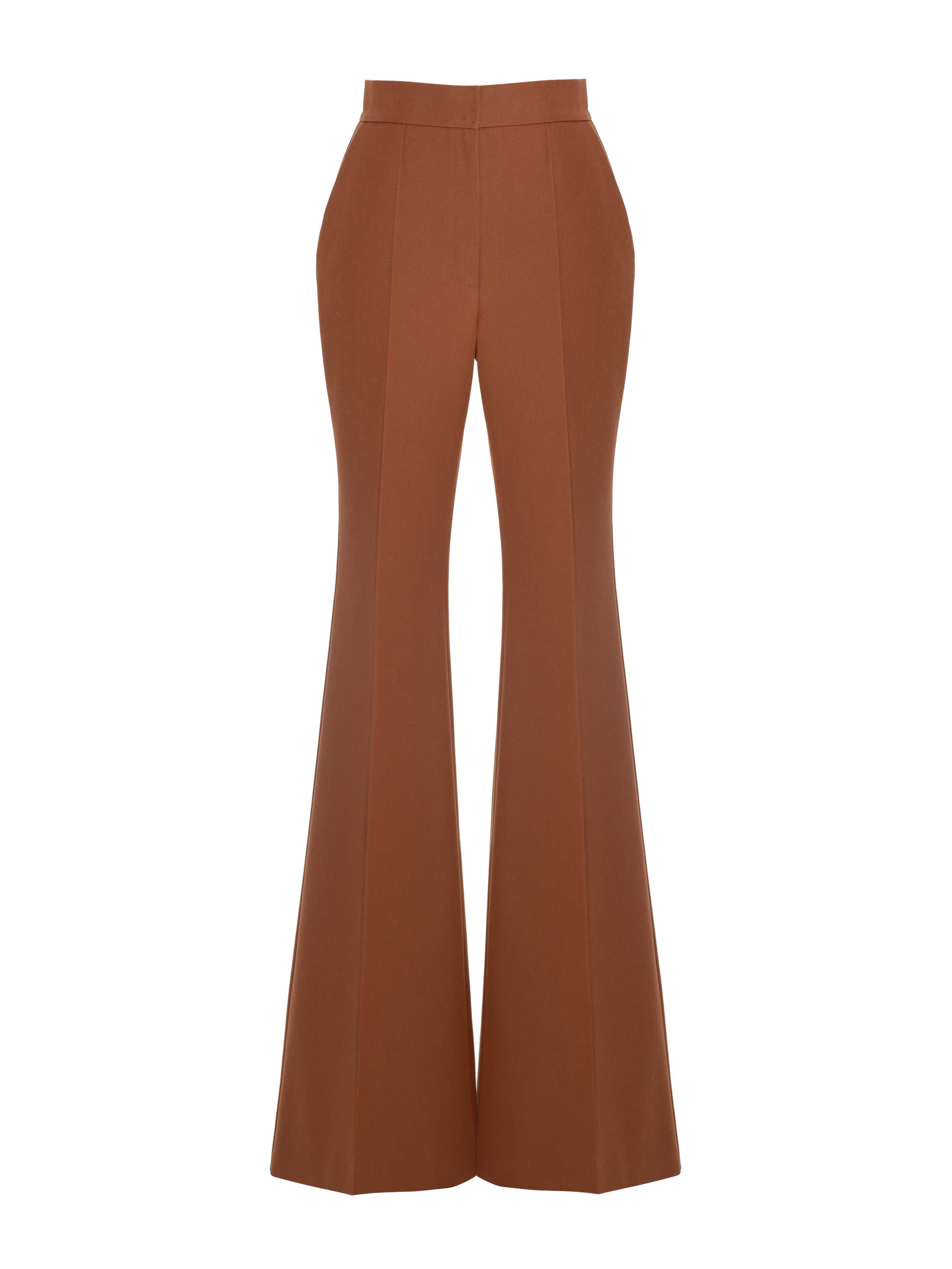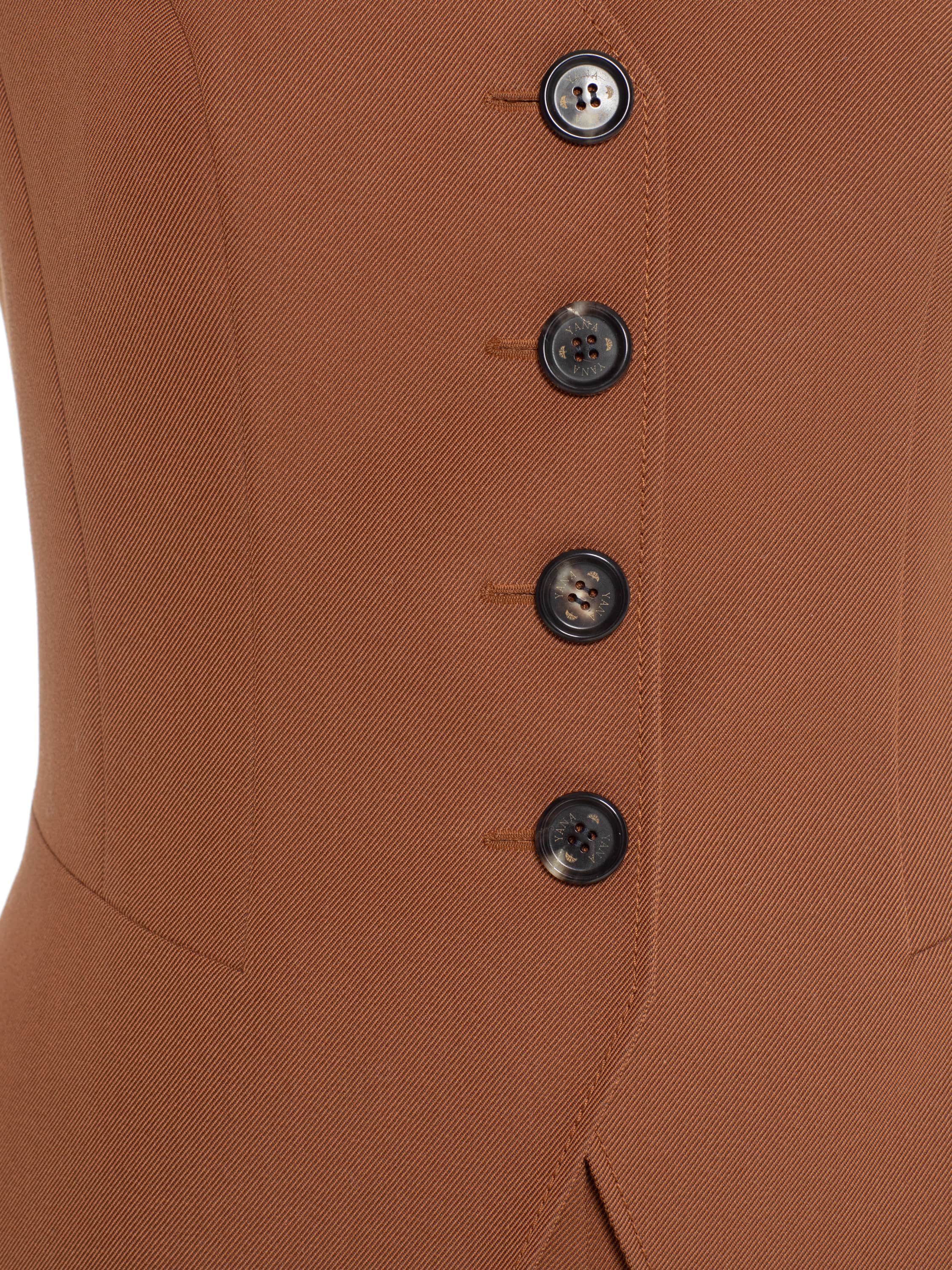 The brown three-piece suit consists of a fitted jacket with shaped lapels, a waistcoat and flared trousers. The monochrome set will help create a trendy business-style look.