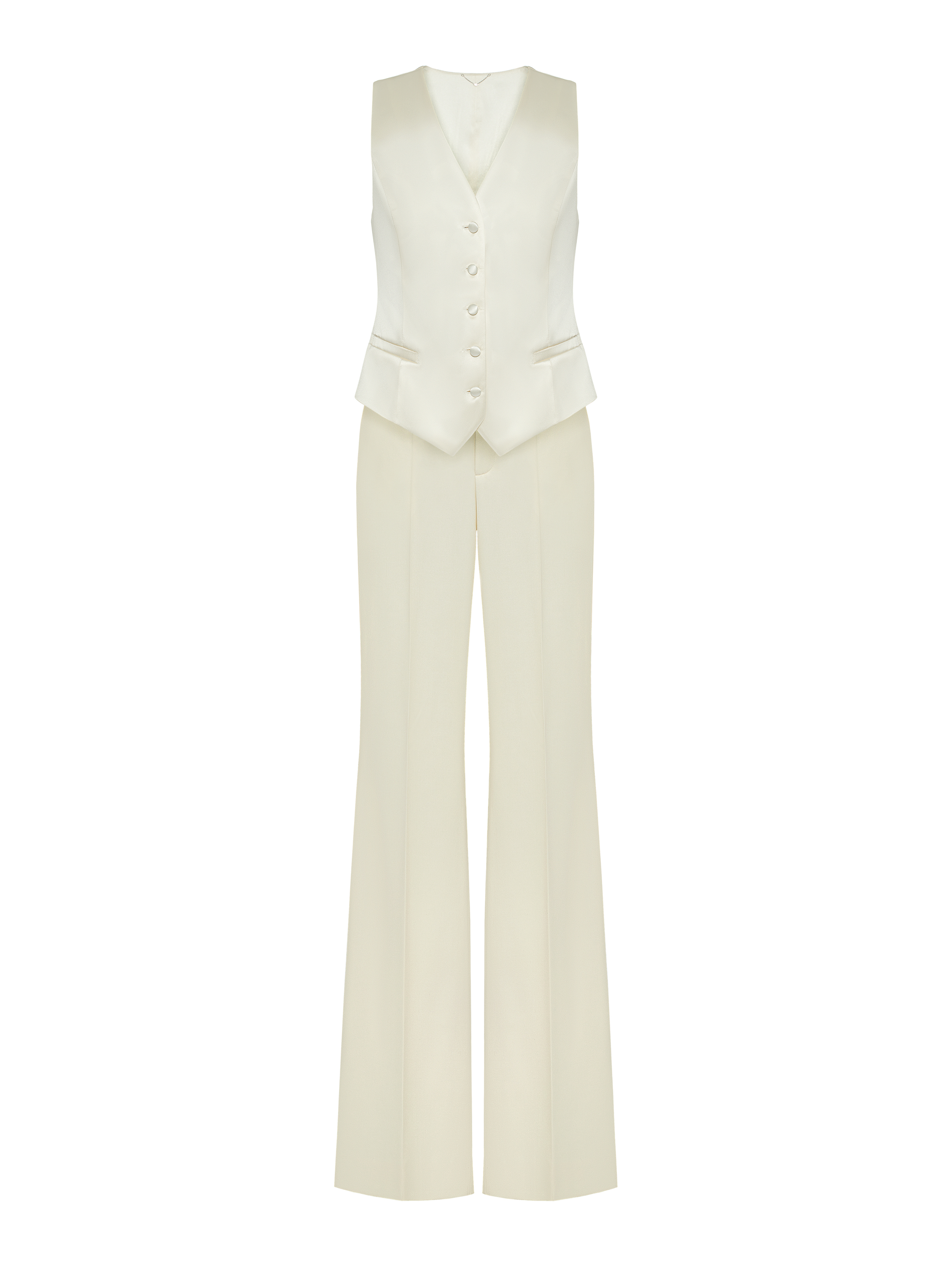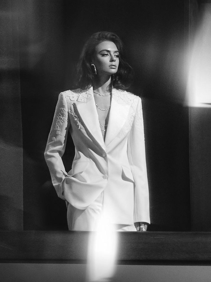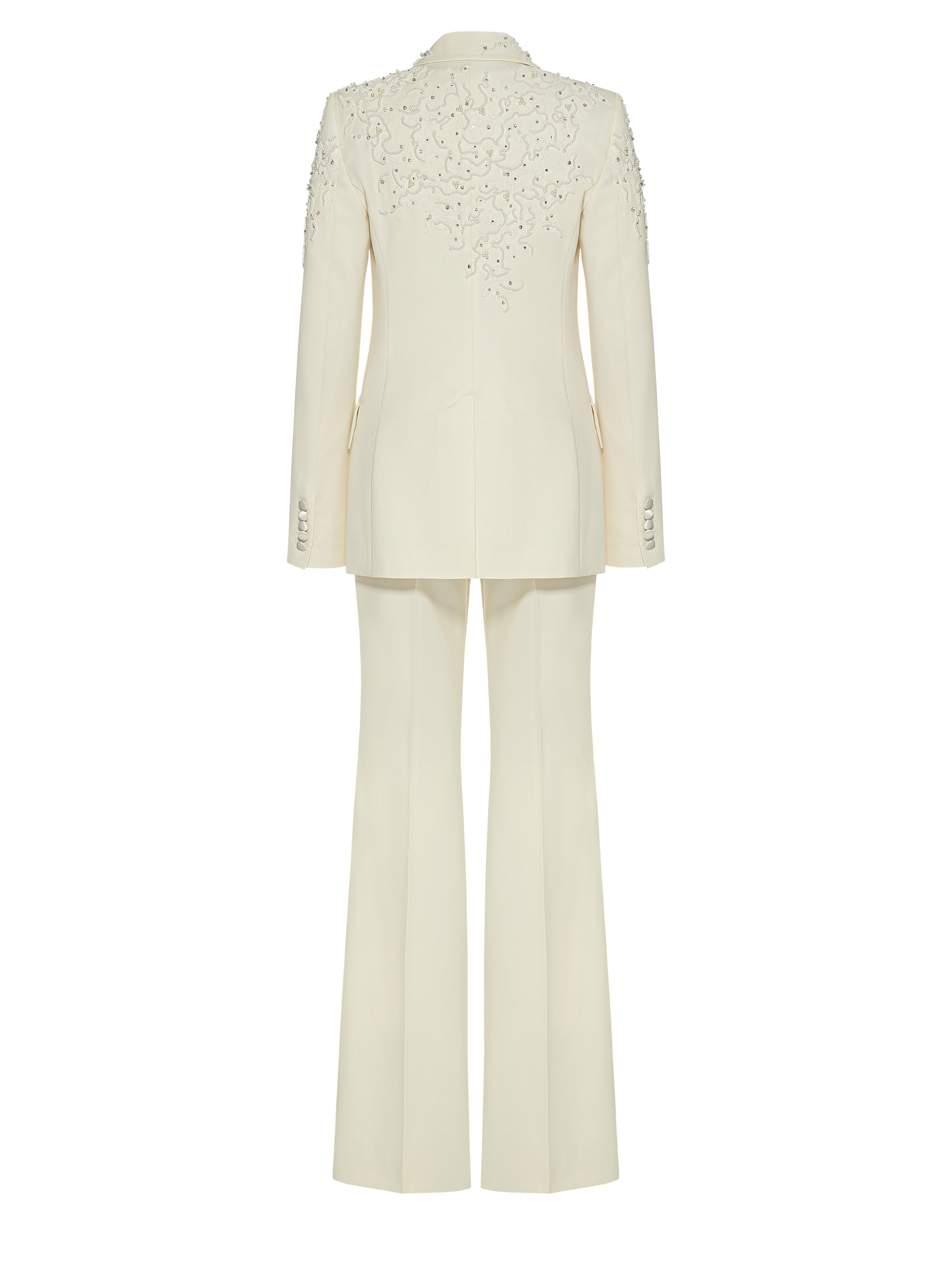 An unconventional approach to the wedding tradition — a three-piece trouser suit, hand-embroidered with lace flowers, pearls and Swarovski crystals.