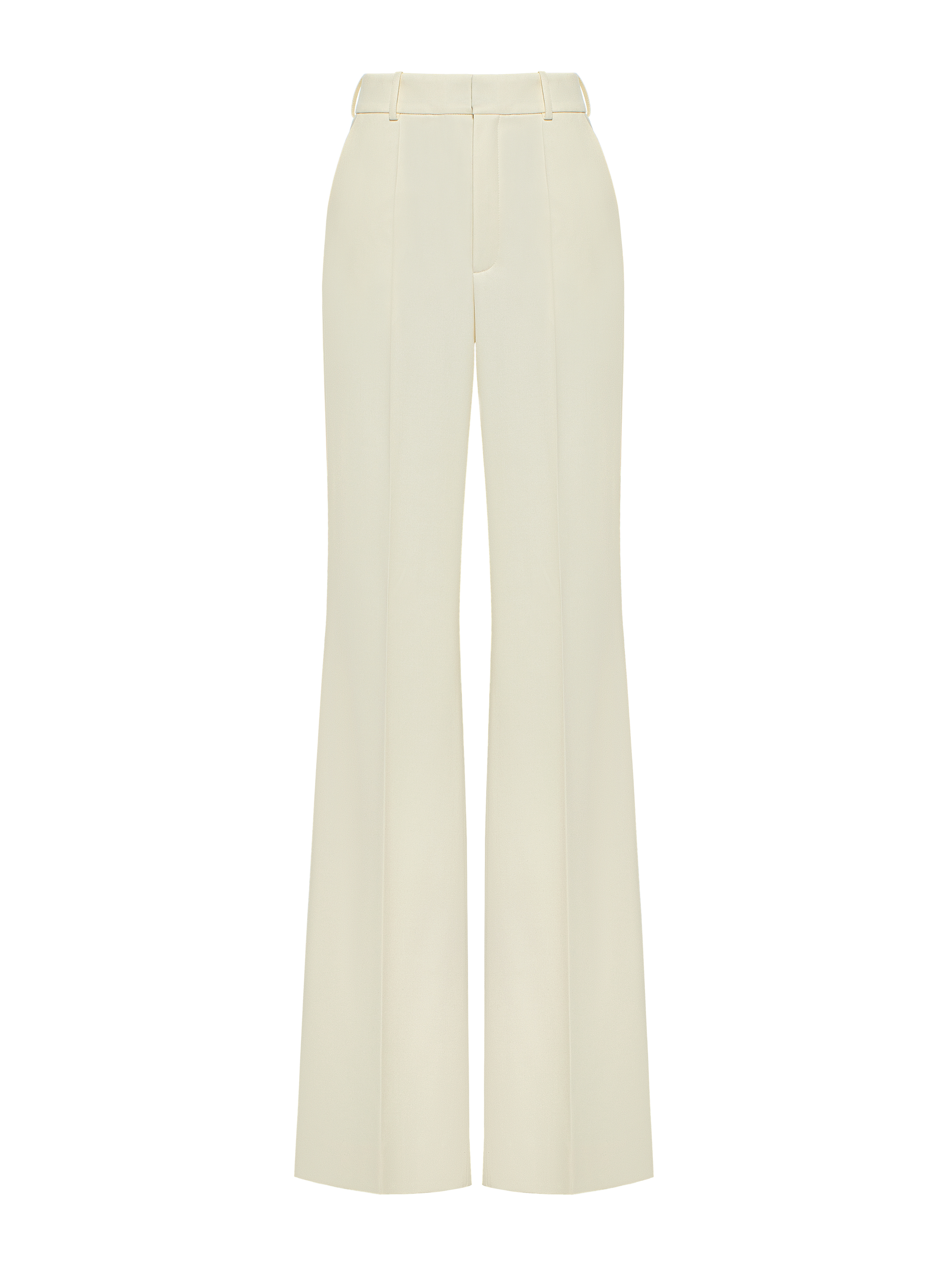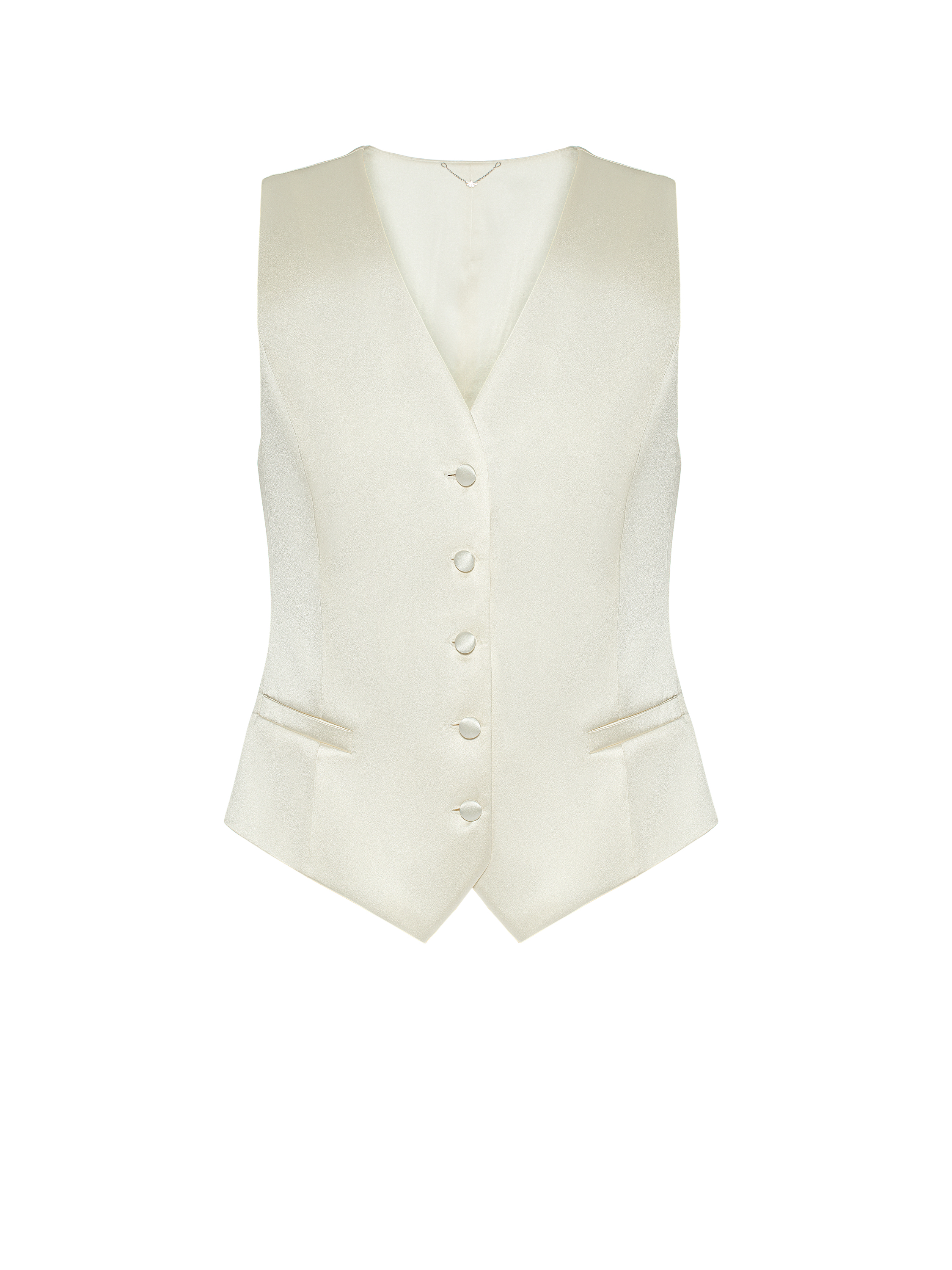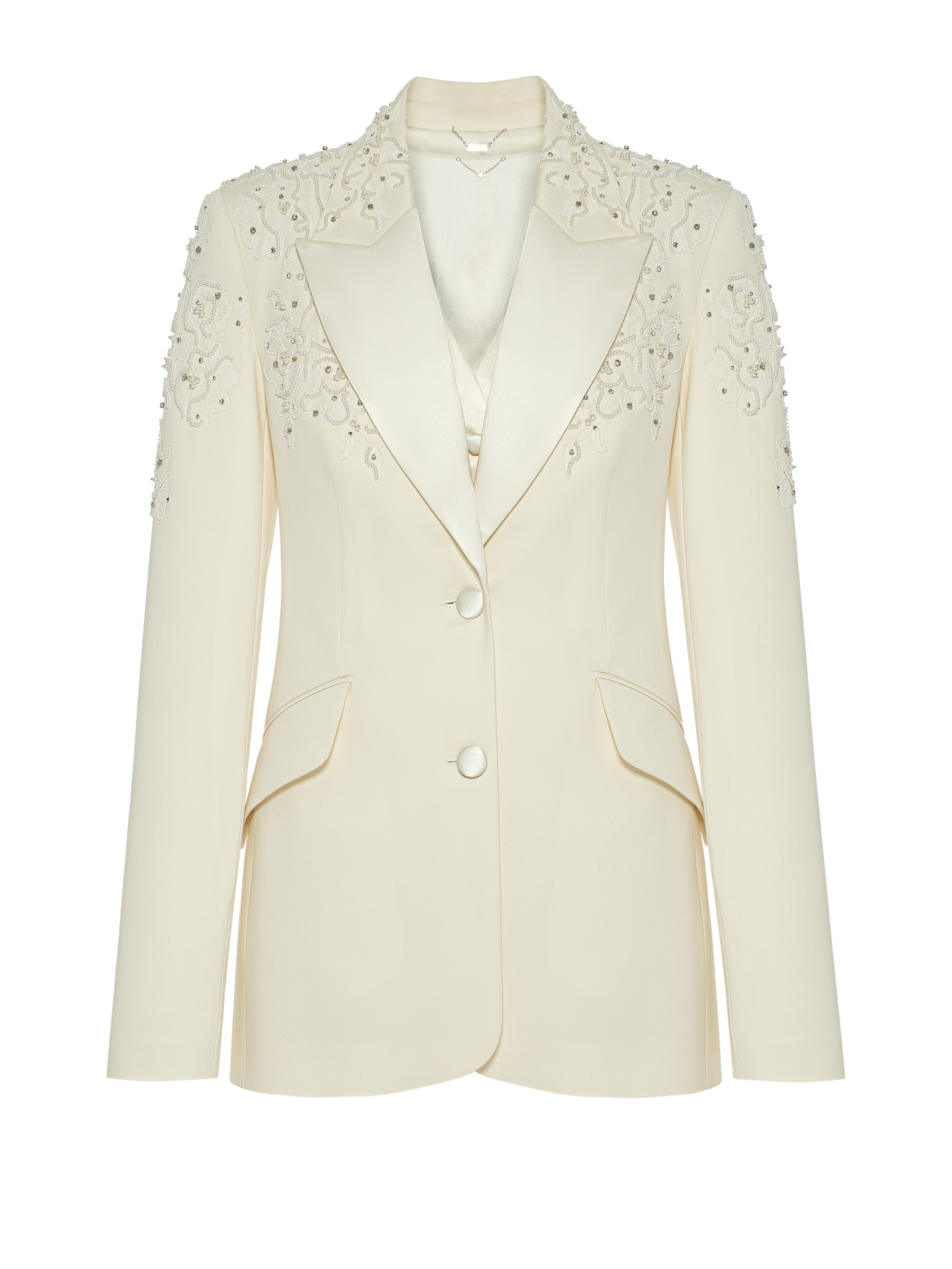 An unconventional approach to the wedding tradition — a three-piece trouser suit, hand-embroidered with lace flowers, pearls and Swarovski crystals.