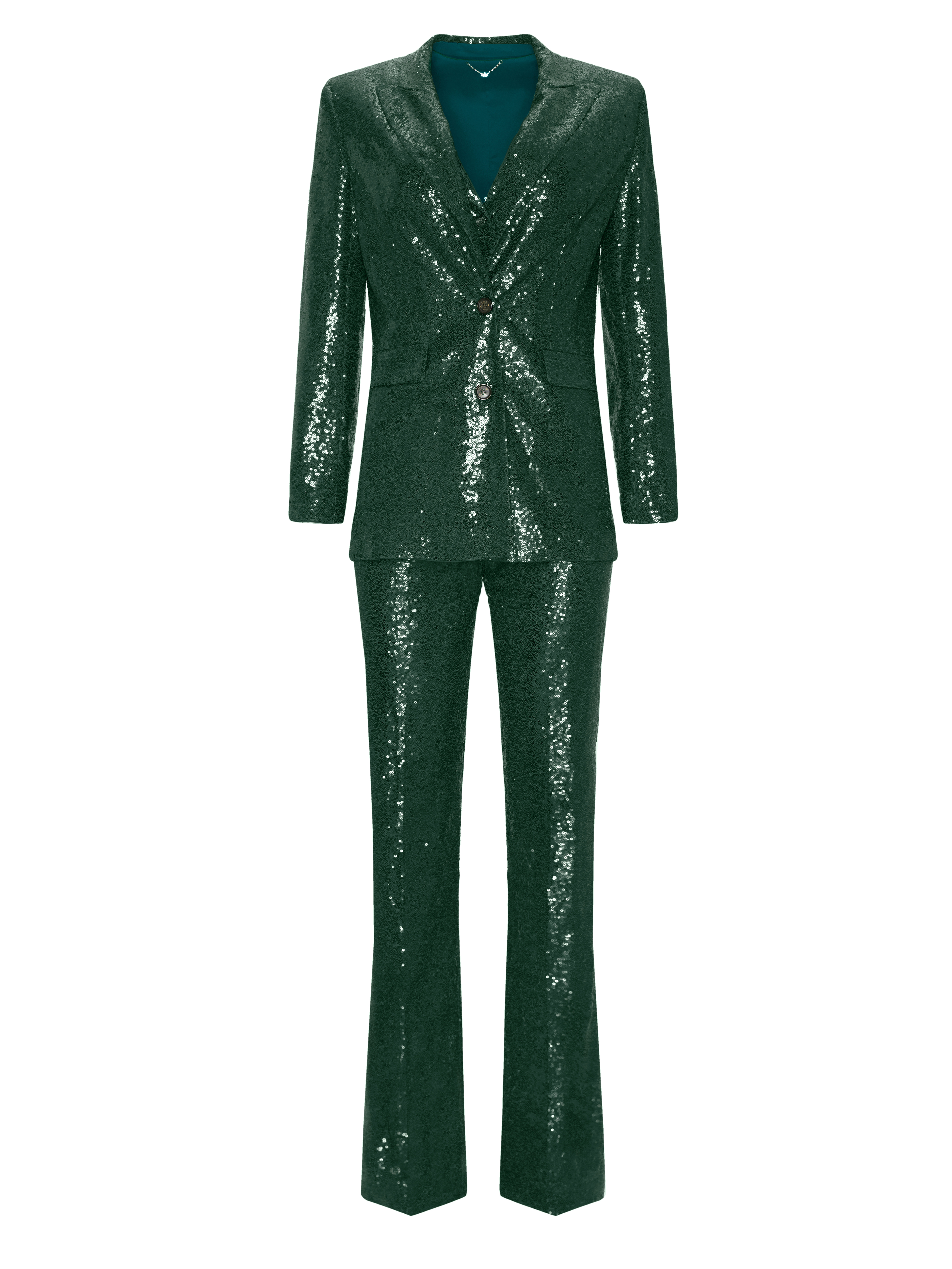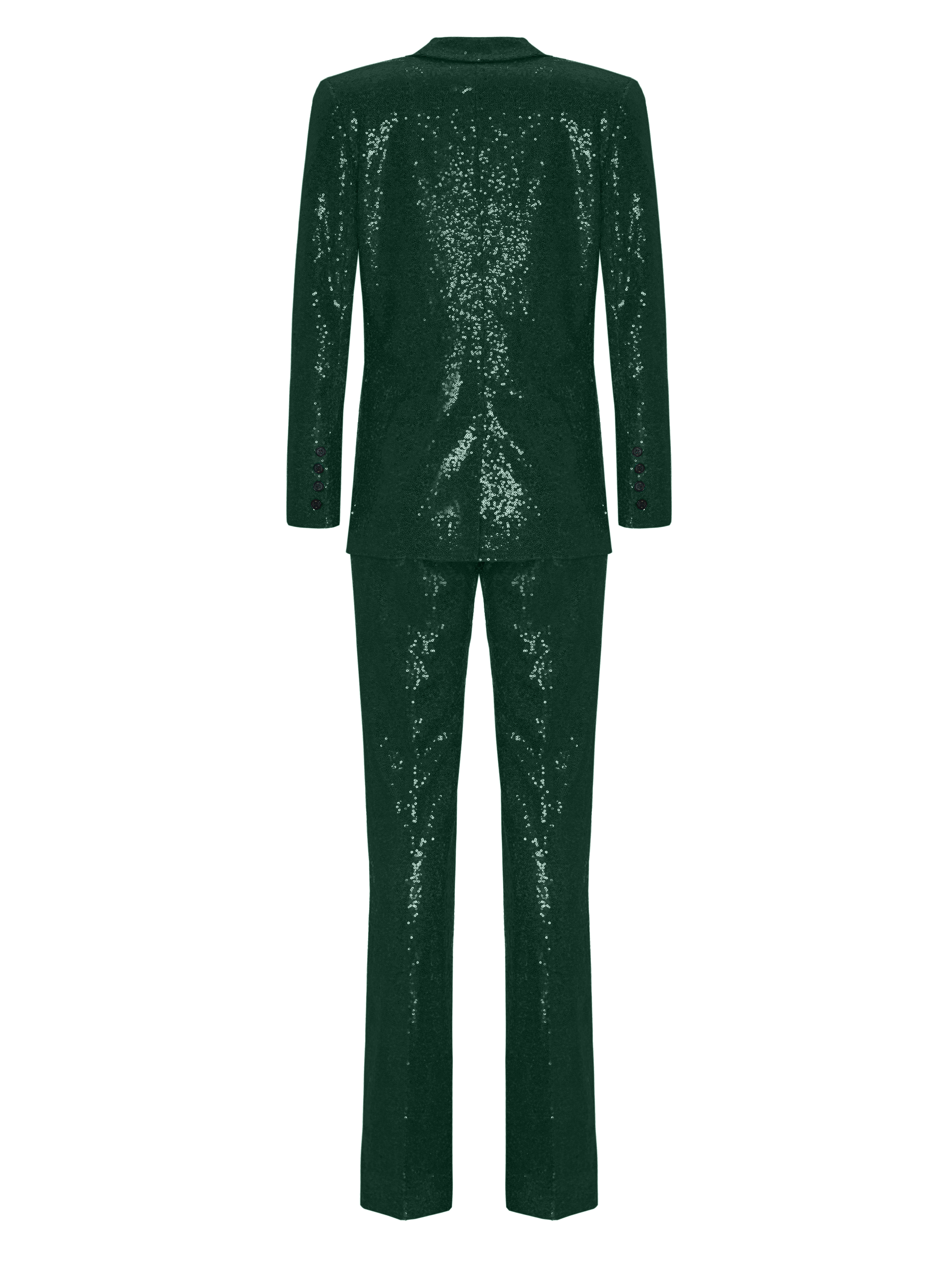 The three-piece suit consists of a single-breasted straight-cut blazer with 2 buttons, a vest, and straight trousers with creases. Completely embroidered with green sequins, with Yana logo engraving on the buttons.