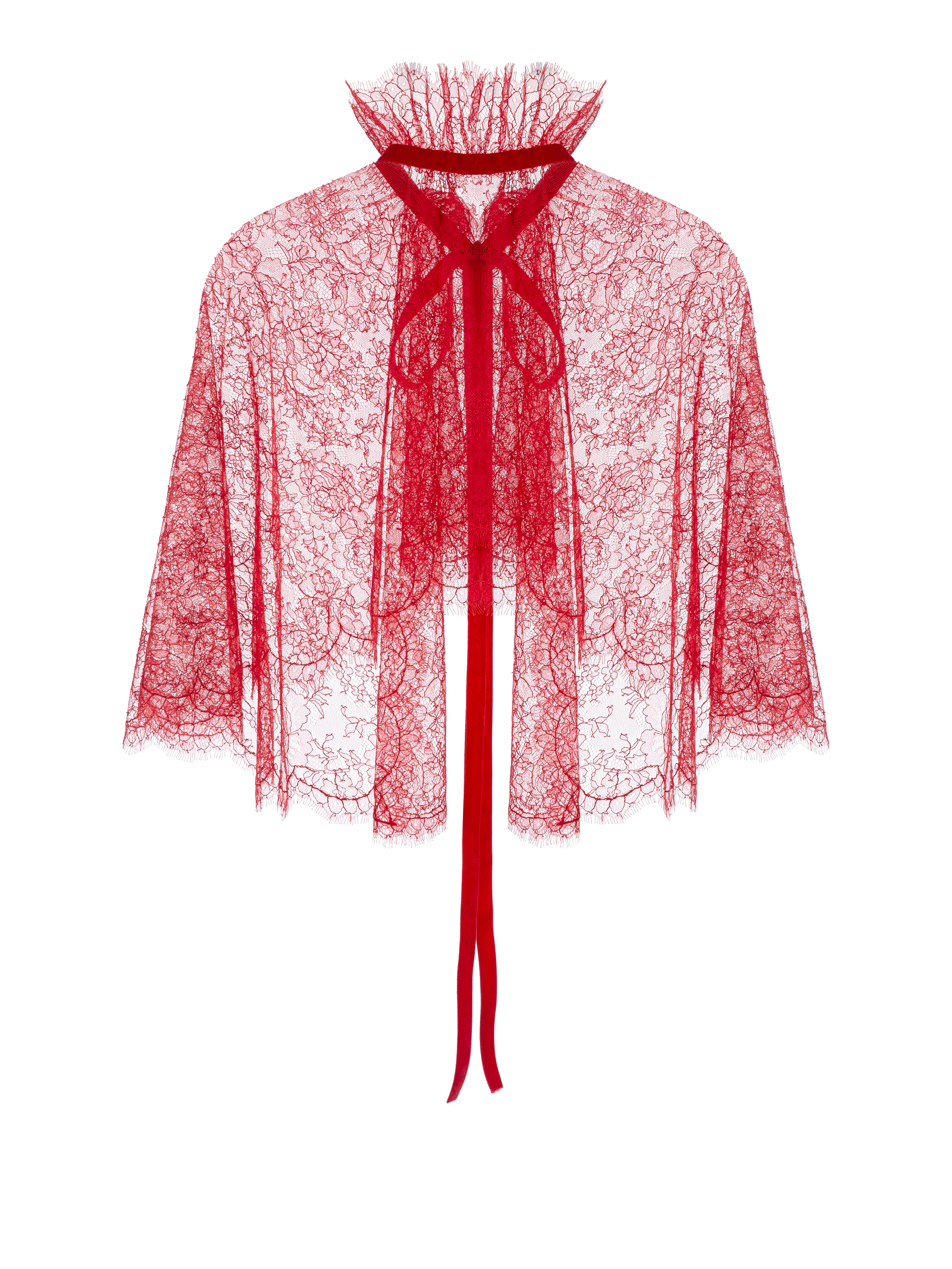 A red cape made of semi-sheer lace. Front velvet ties in a matching shade. The cape will be the perfect finishing touch to a Yana look.