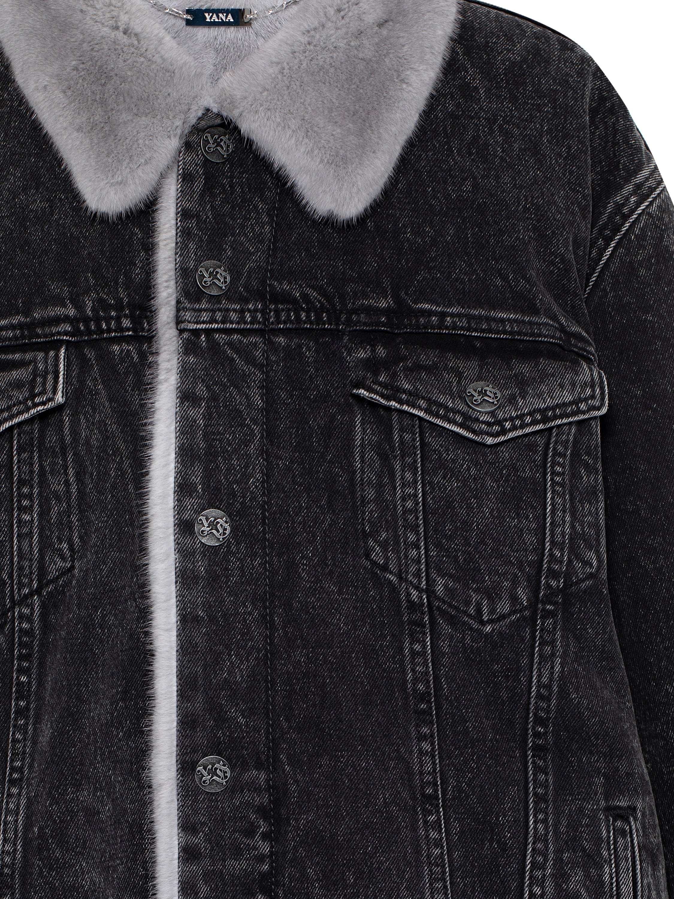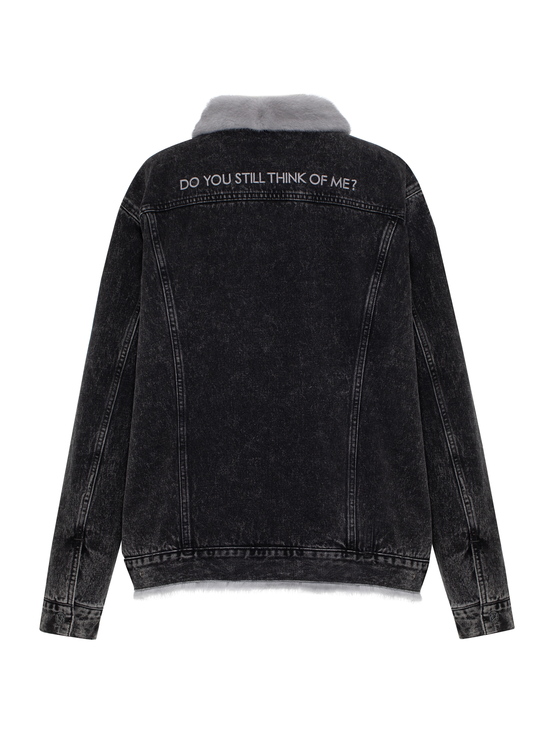 A black washed denim jacket with a grey mink fur lining will become a memorable accent in your wardrobe. The model is complemented by two patch pockets with flaps on the chest and two welt pockets at the sides. The jacket is decorated with grey "Do You still think of me?" embroidery on the back. Fastens with logo-embossed buttons.