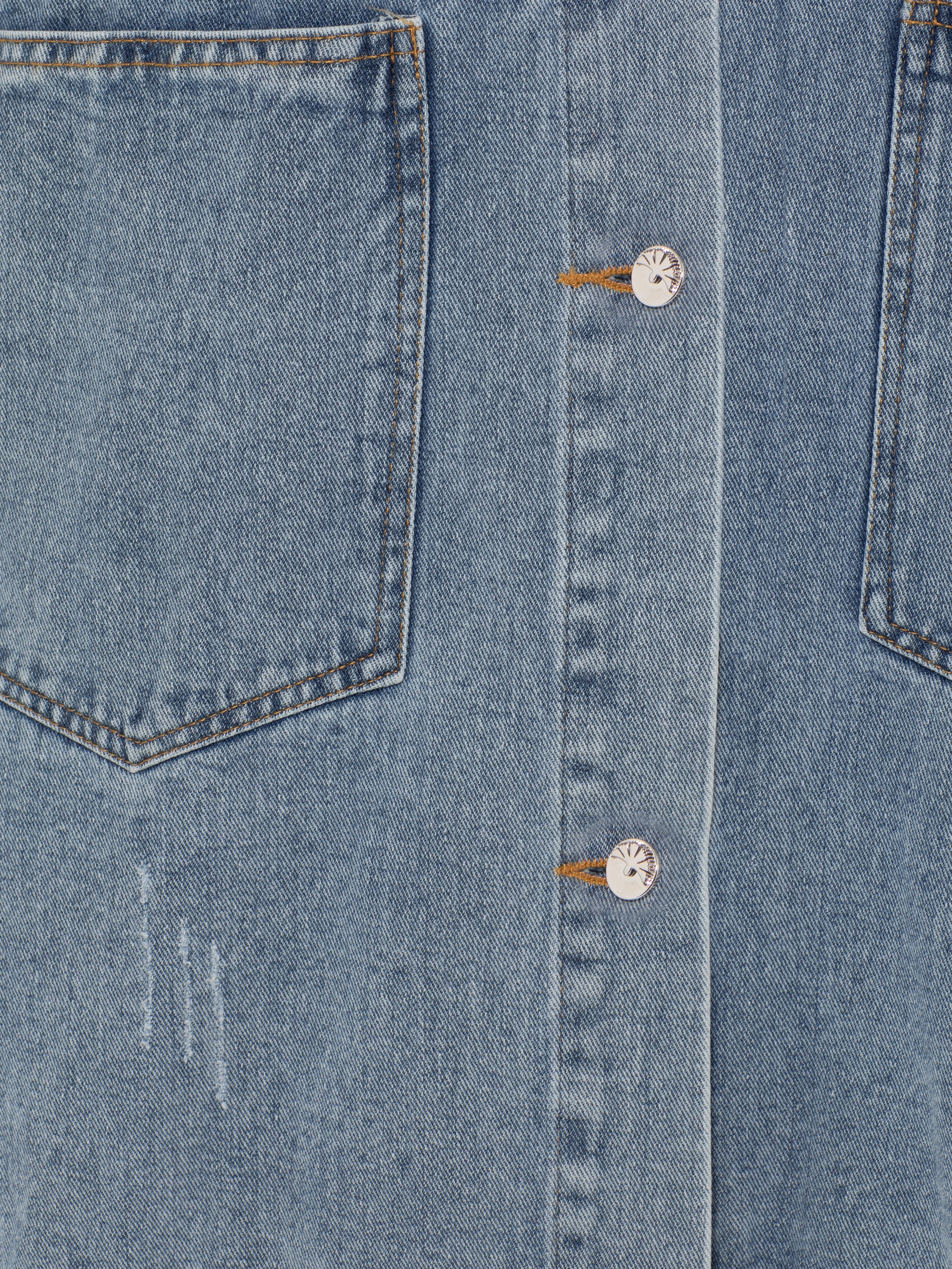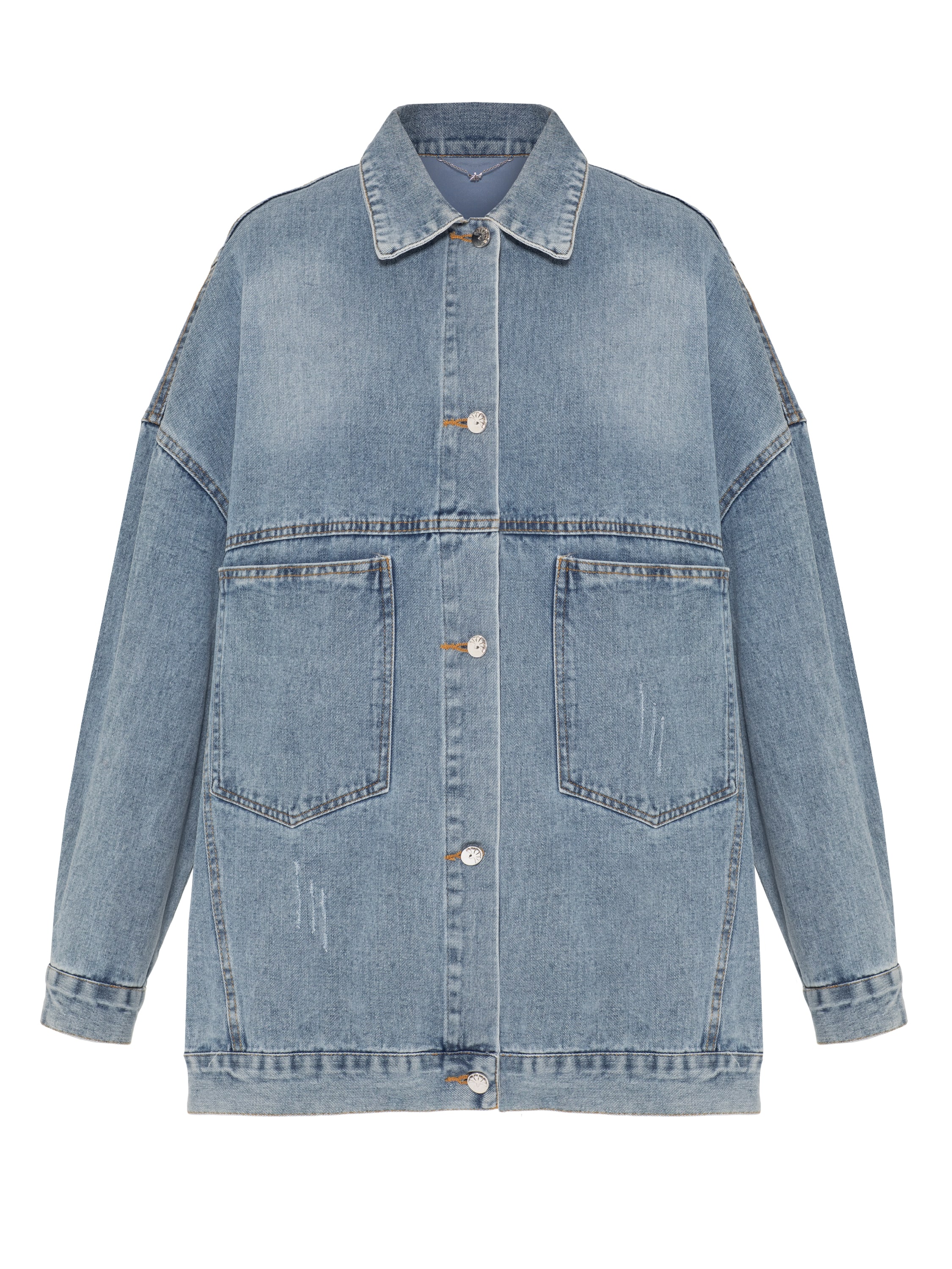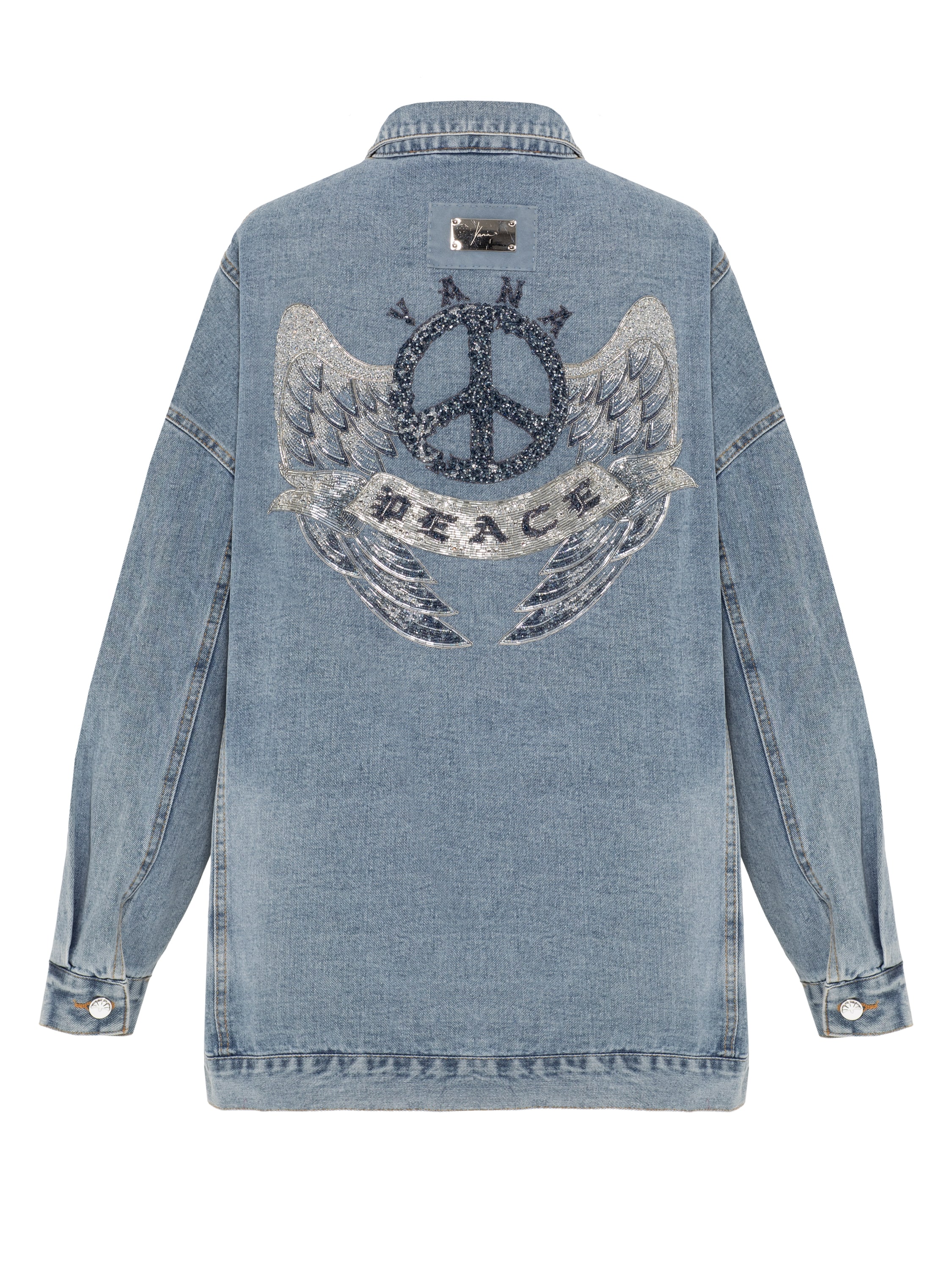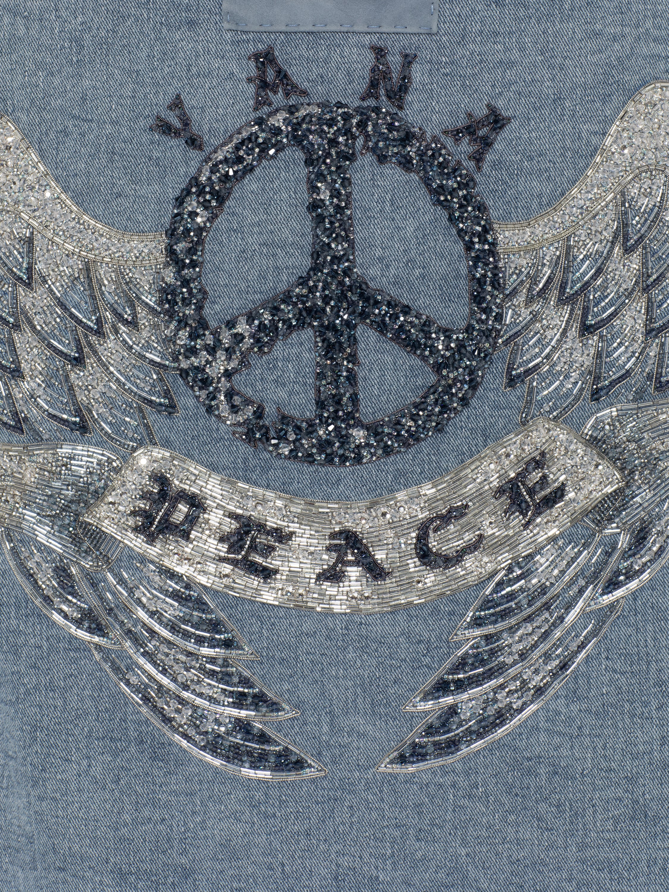 The light blue denim jacket is embellished with bead embroidery and crystals on the back. Fastens with silver logo buttons.