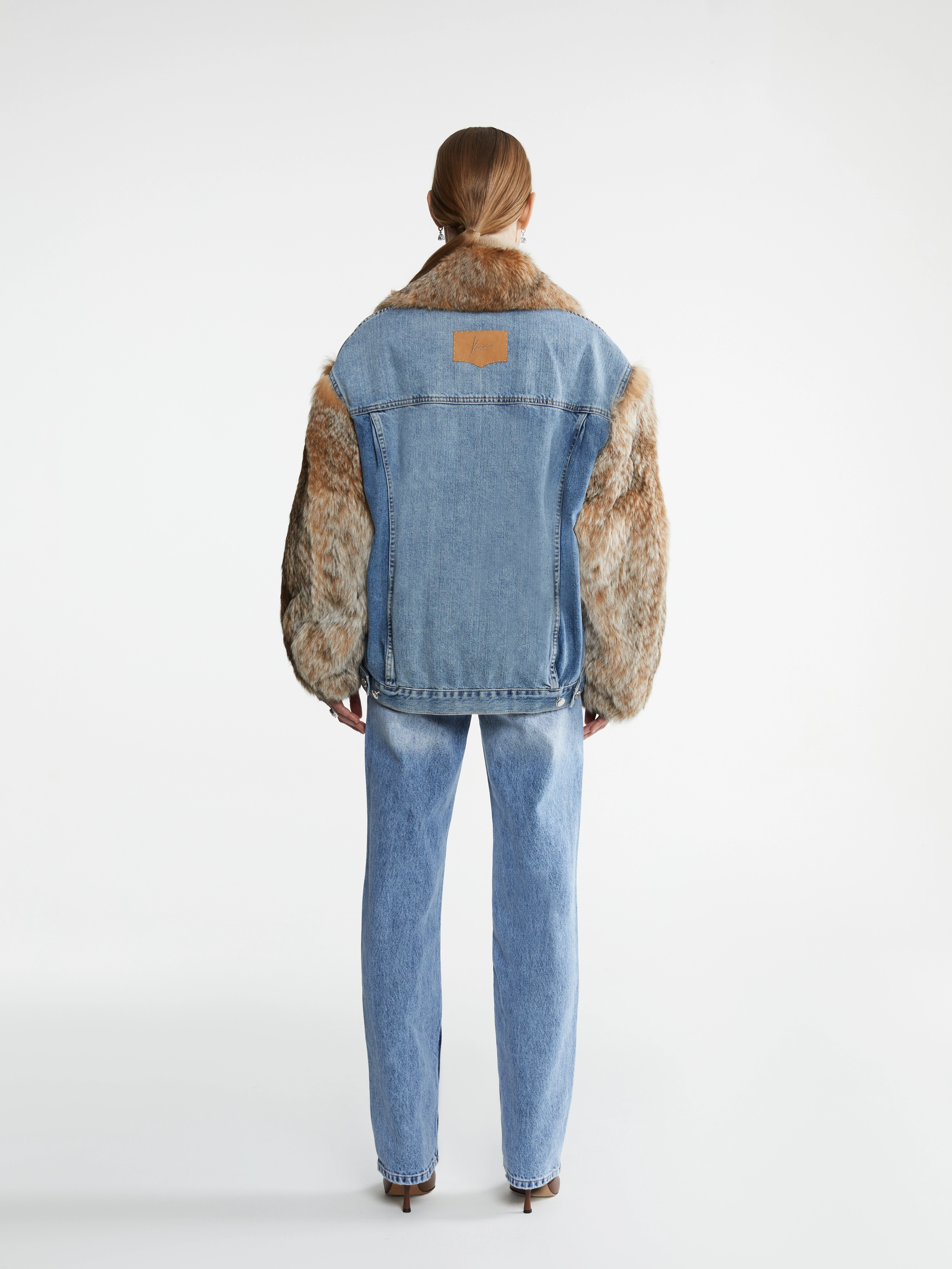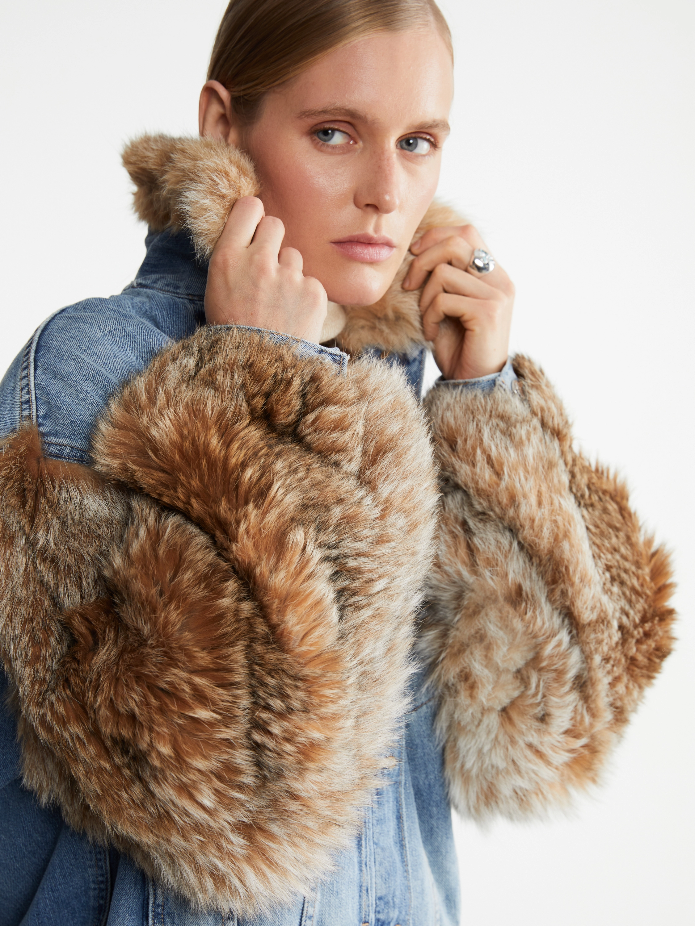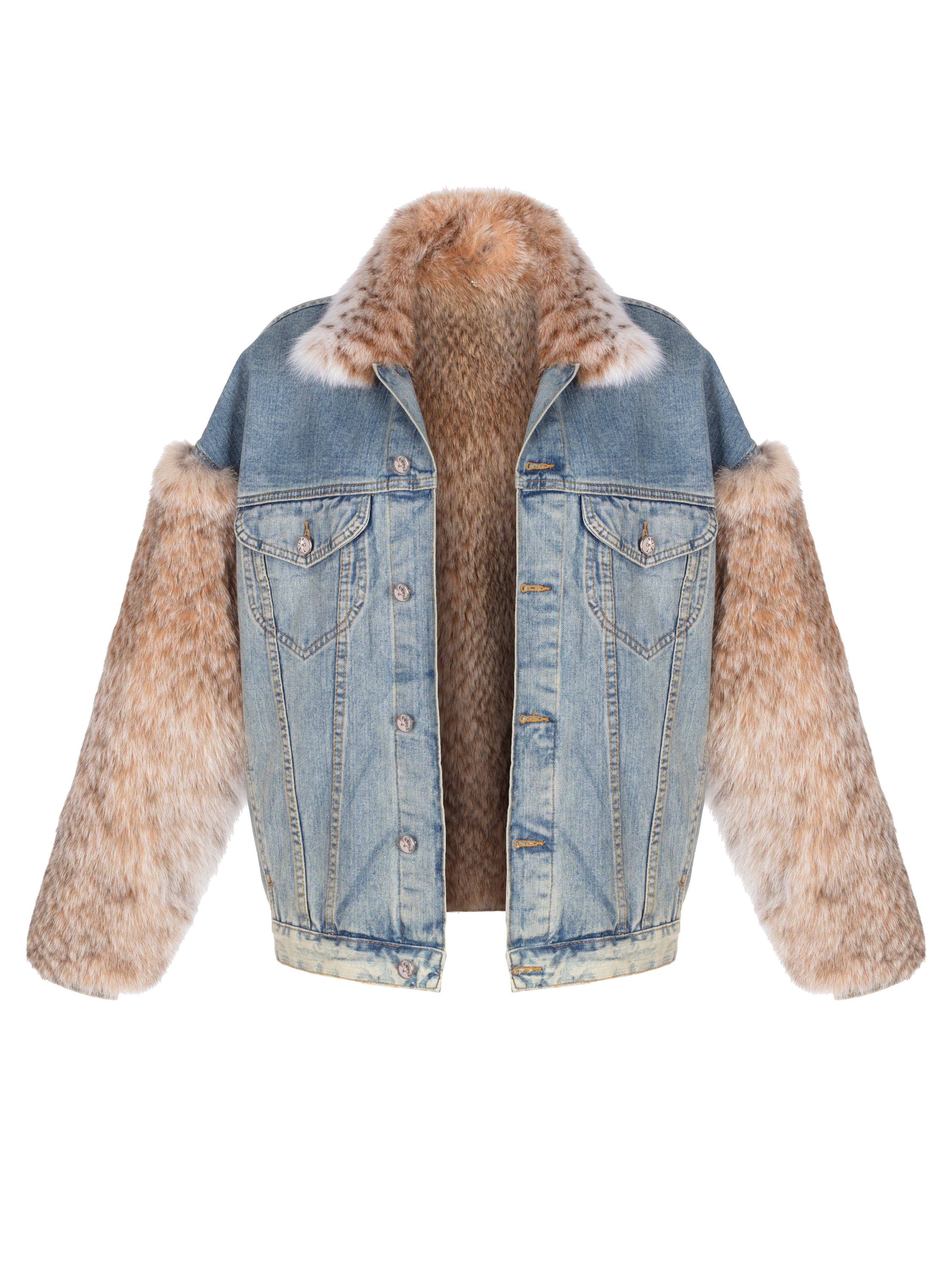 An oversized jacket made of washed denim with fur sleeves and lining. Made from wild lynx (bobcat) fur. Decorated with 925 sterling silver buttons.
