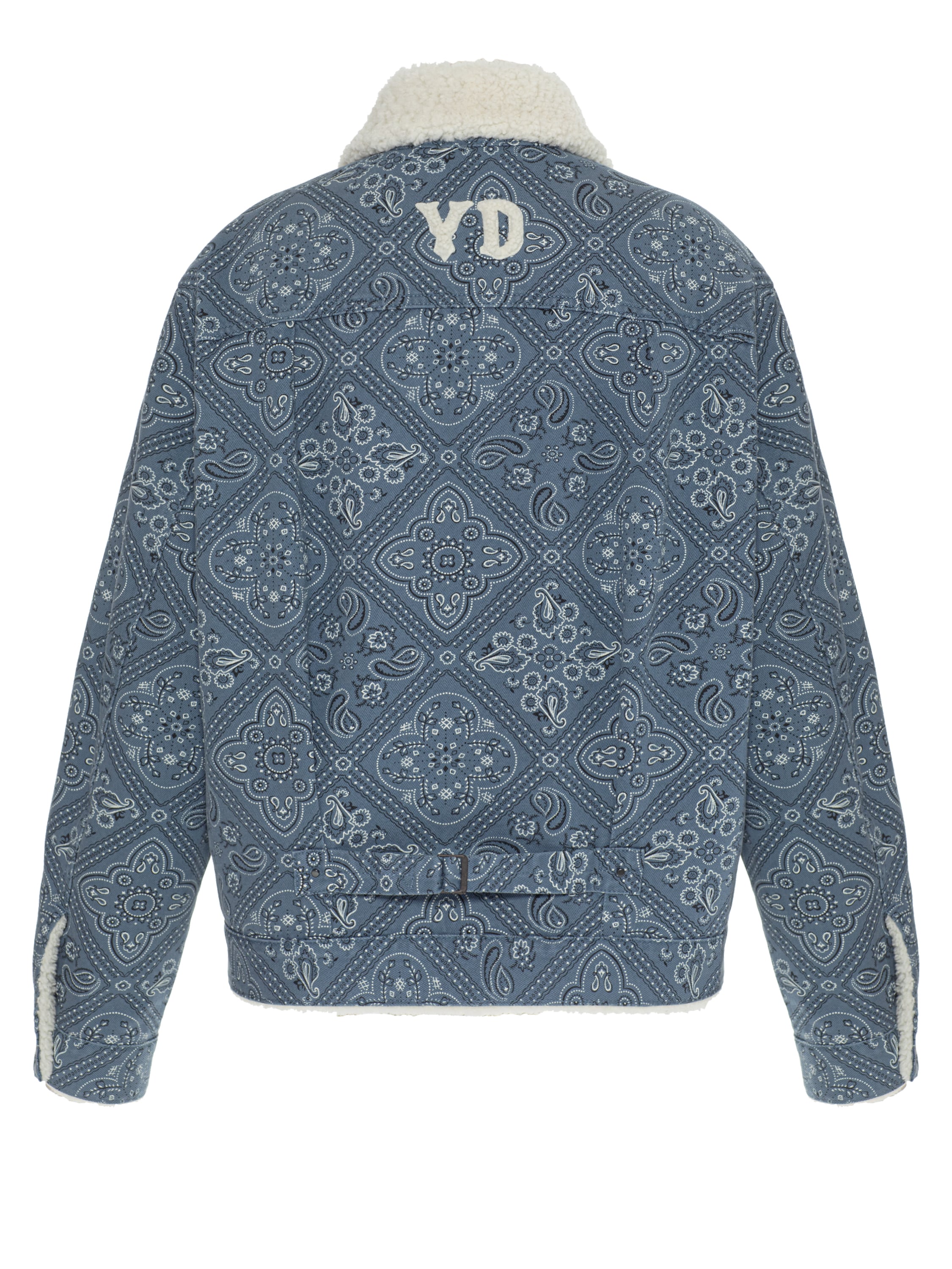 A blue denim jacket with a paisley print, lined with white shearling, will pair well with any casual outfit. The model is complemented by a contrasting notch lapel collar and a logo appliqué on the back.