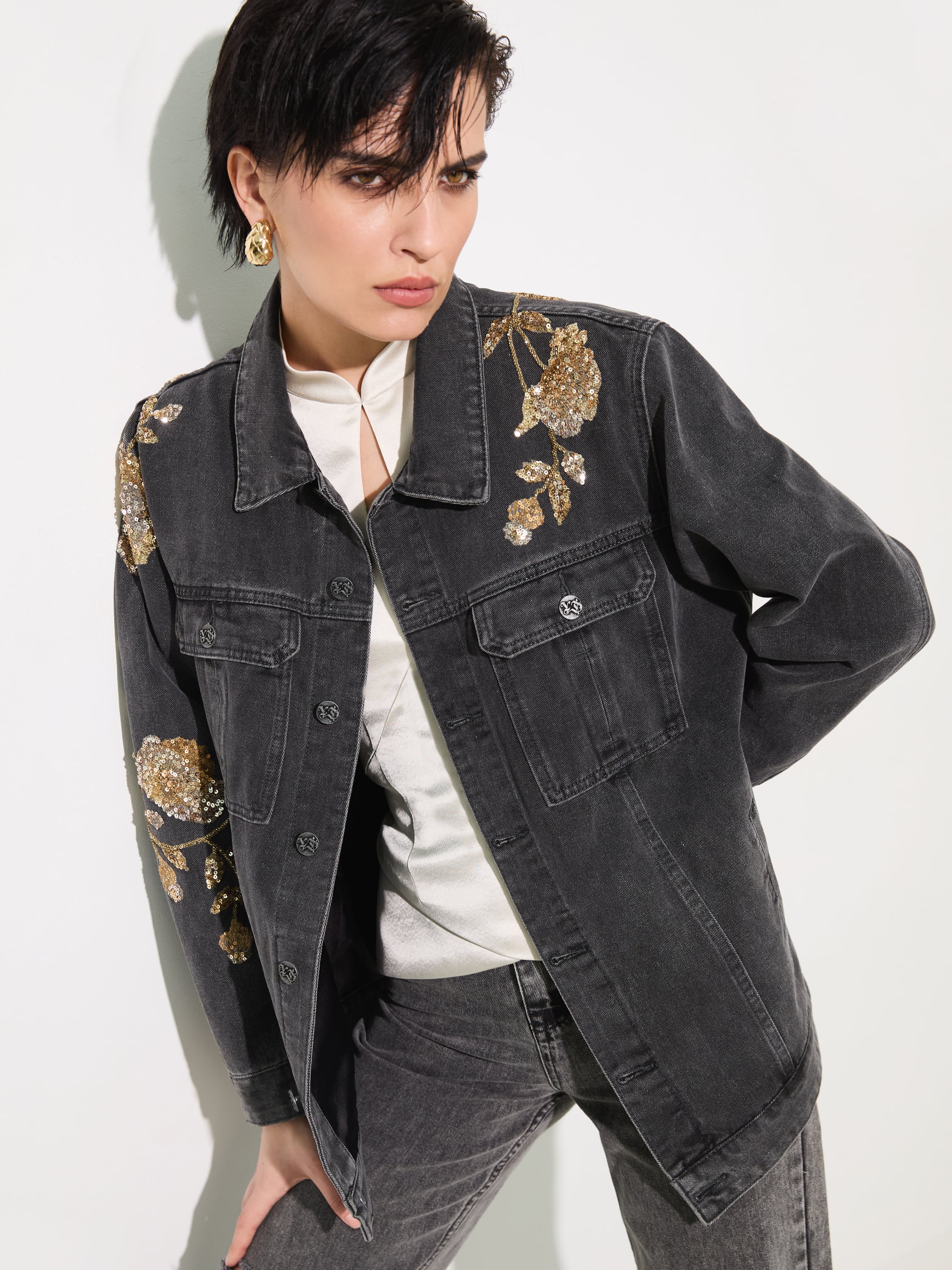 The black denim jacket is complemented by delicate floral embroidery with golden sequins. The decoration of the piece required 46 hours of handwork by the craftsmen of the Yana fashion house.