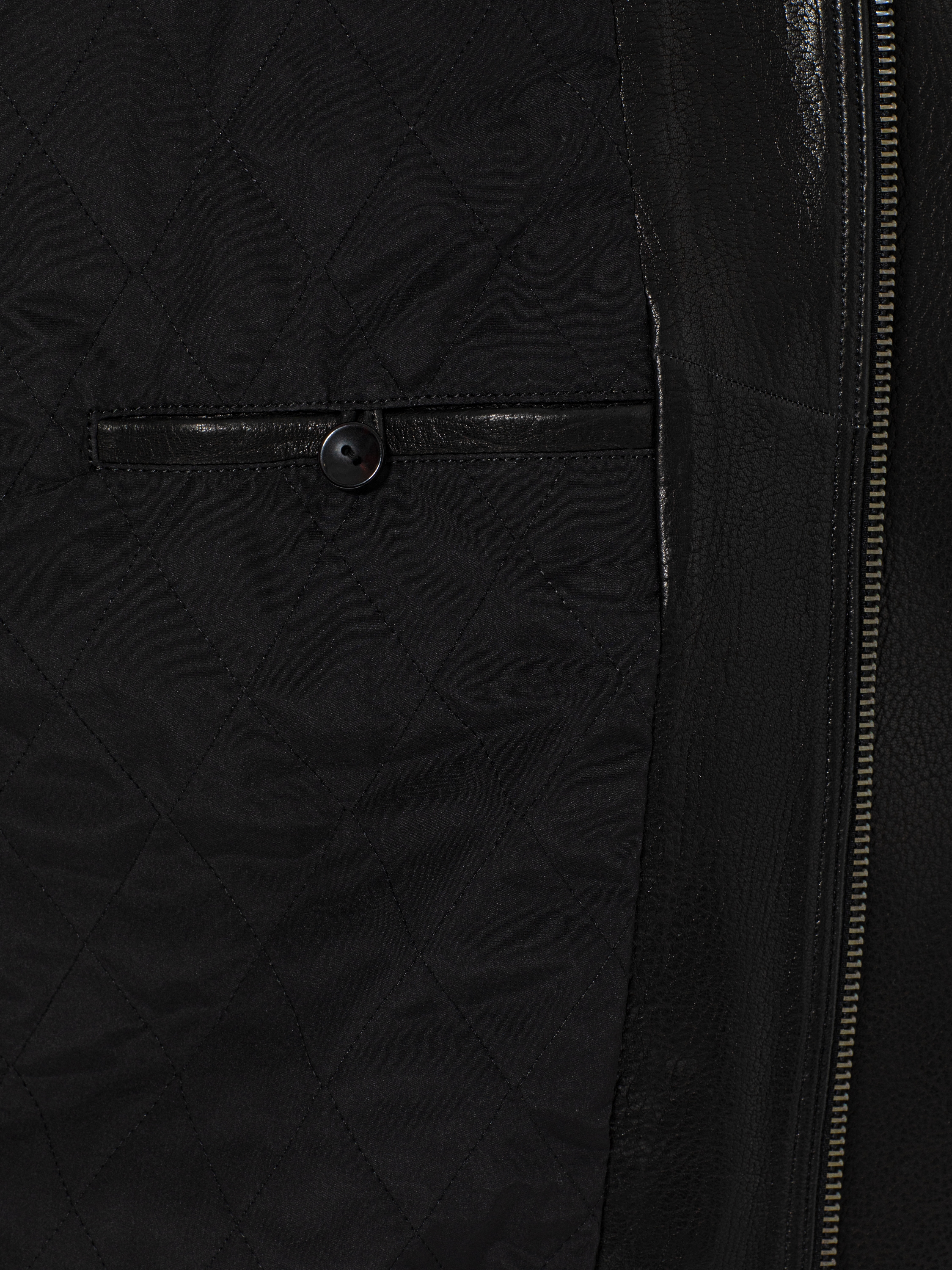 A black biker jacket made of genuine leather. A removable turn-down fur collar is included. Zip and snap button fastening.
