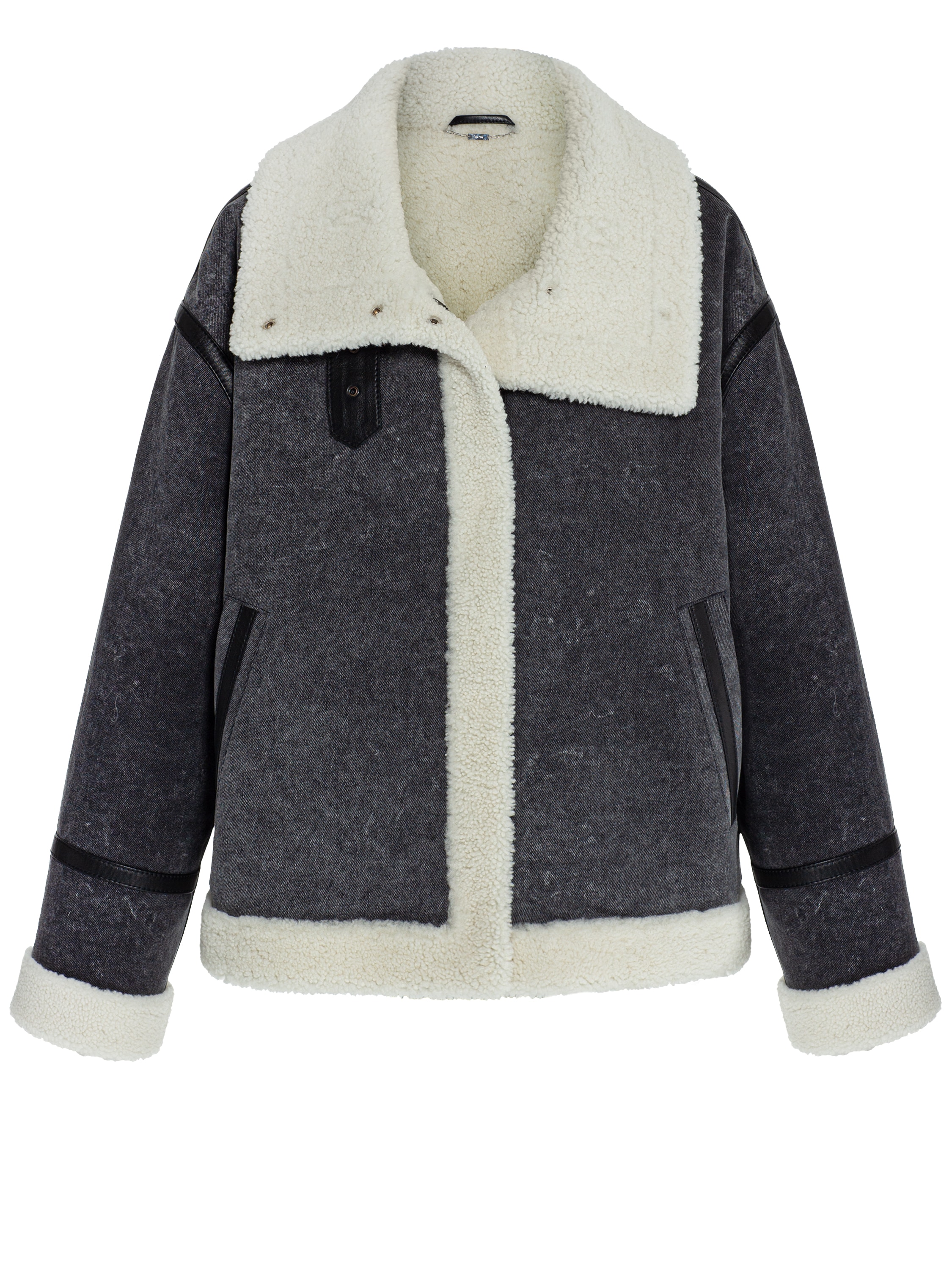 A biker jacket made of stonewashed denim insulated with white sheepskin fur is the perfect balance between comfort and style. The model is complemented by contrasting black leather trim. Two welt pockets on the sides.