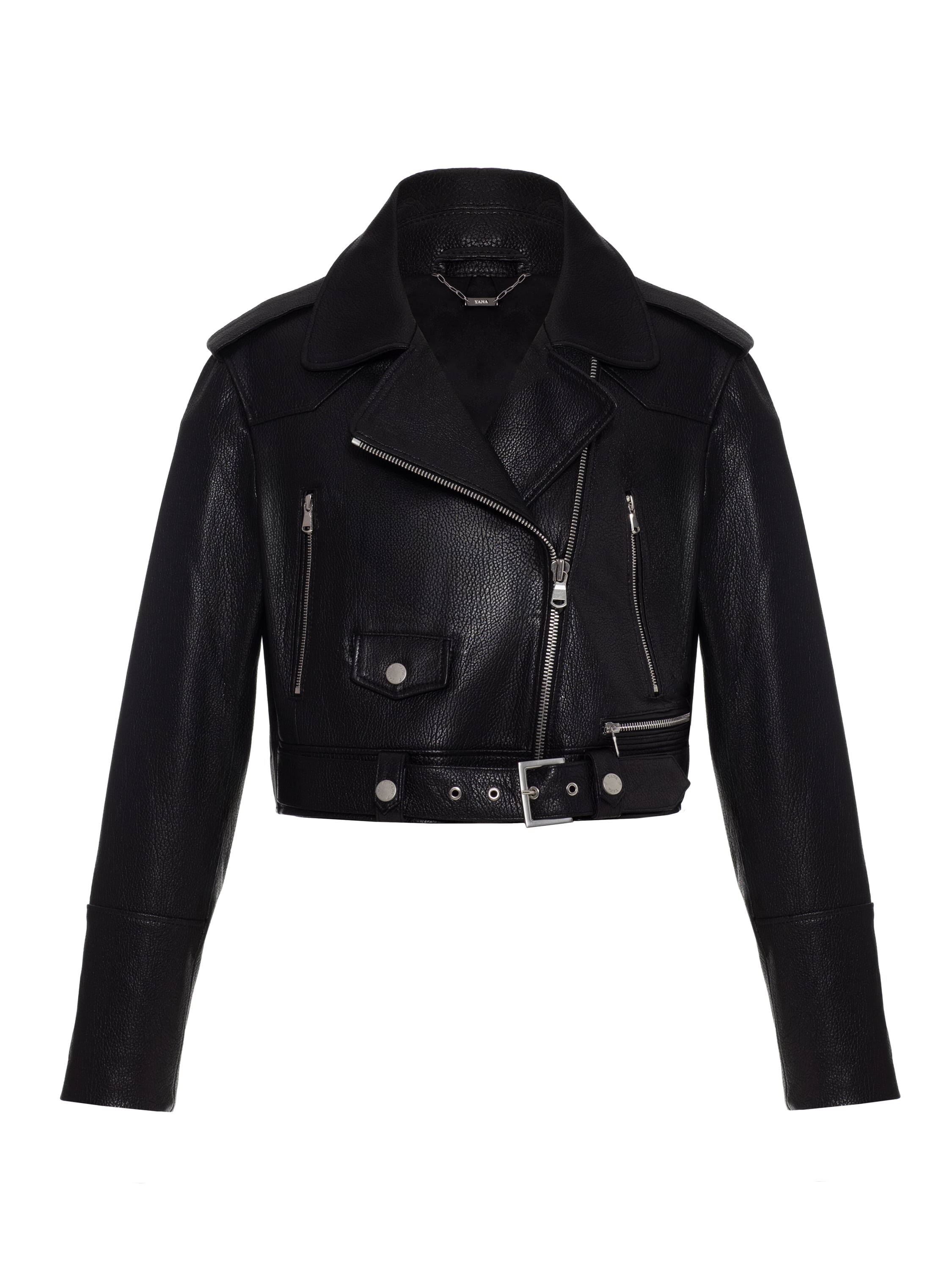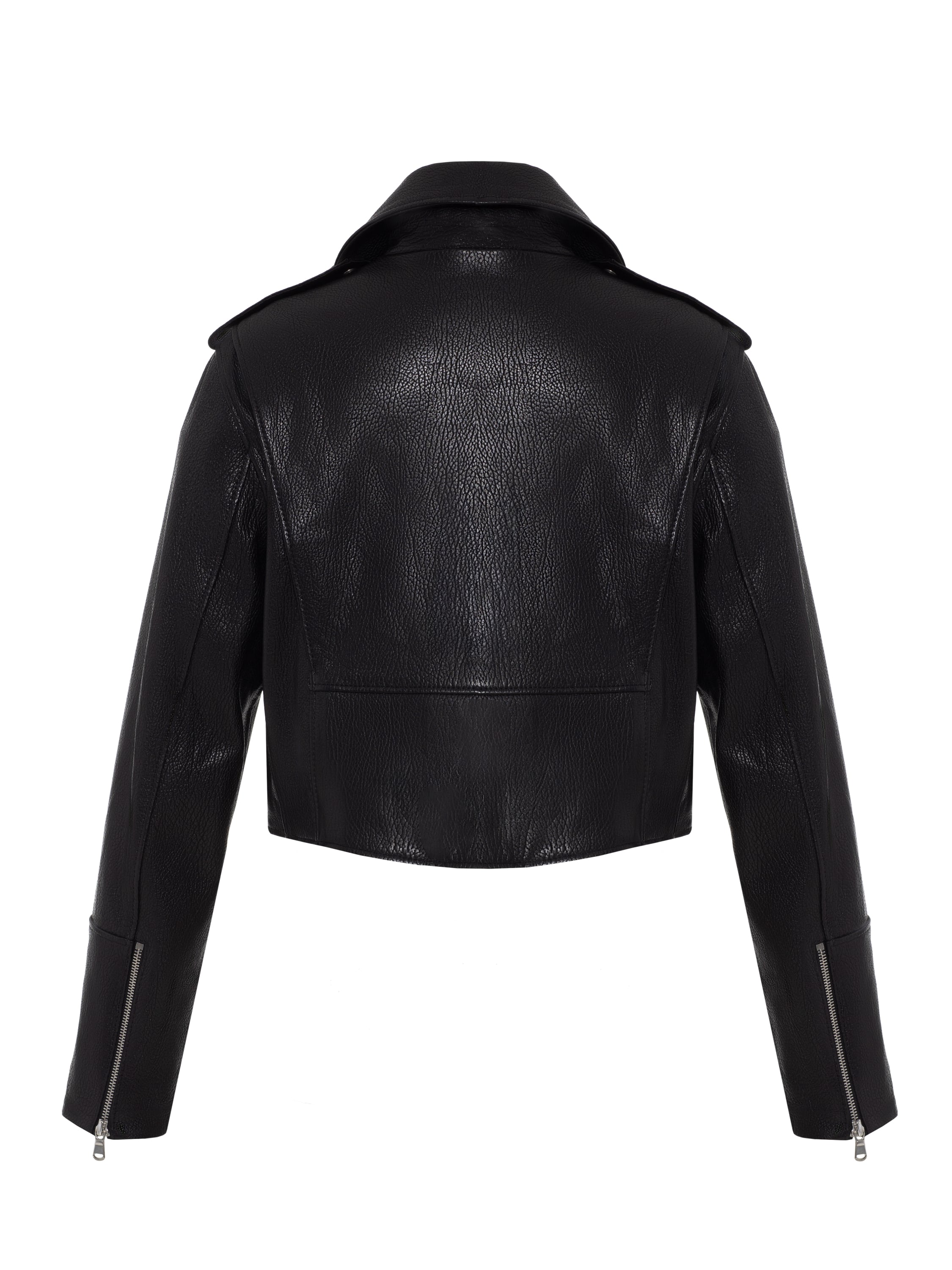 The cropped black biker jacket made of genuine leather is a versatile everyday option that is easy to combine with any basic pieces. Two welt zip pockets, one small flap pocket and a belt at the waist. The model is made of grained genuine leather.