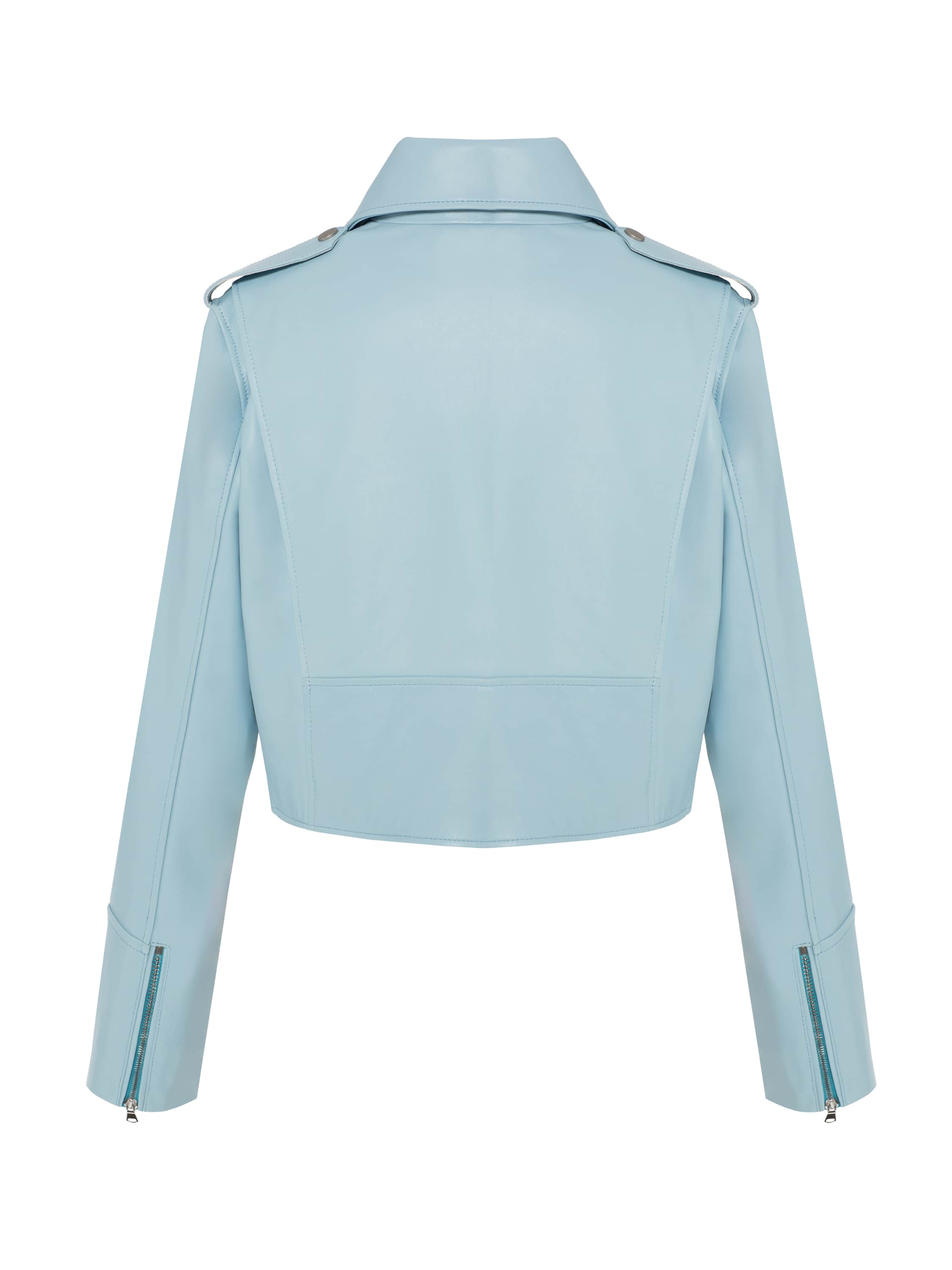 A pastel blue genuine leather biker jacket will become a versatile addition to any look. The cropped model pairs well with dresses and skirts as well as with trousers.