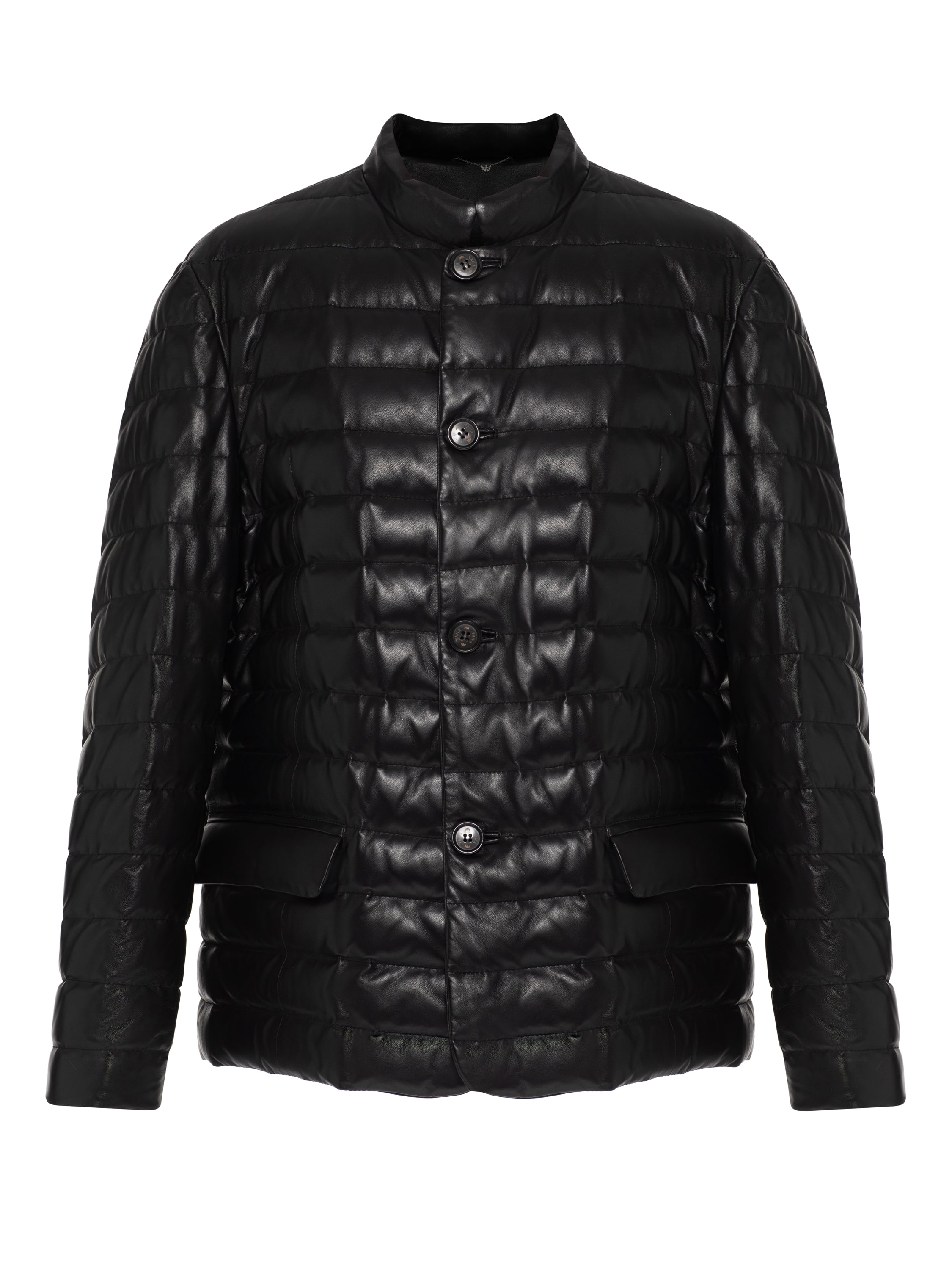 Men's black quilted leather jacket is a versatile wardrobe item that will suit any clothing style. The model with a stand collar is complemented by two flap pockets. It fastens with buttons.