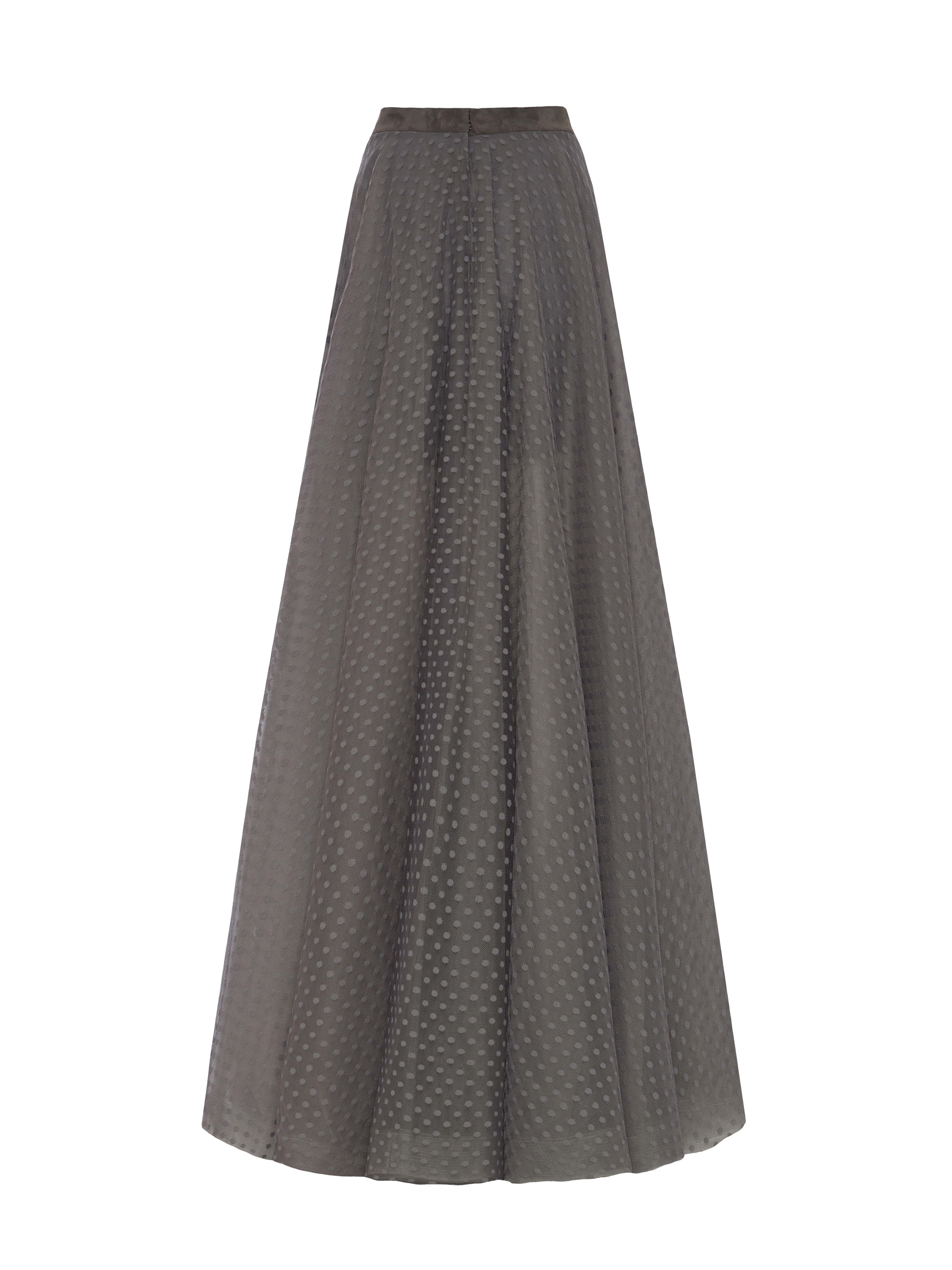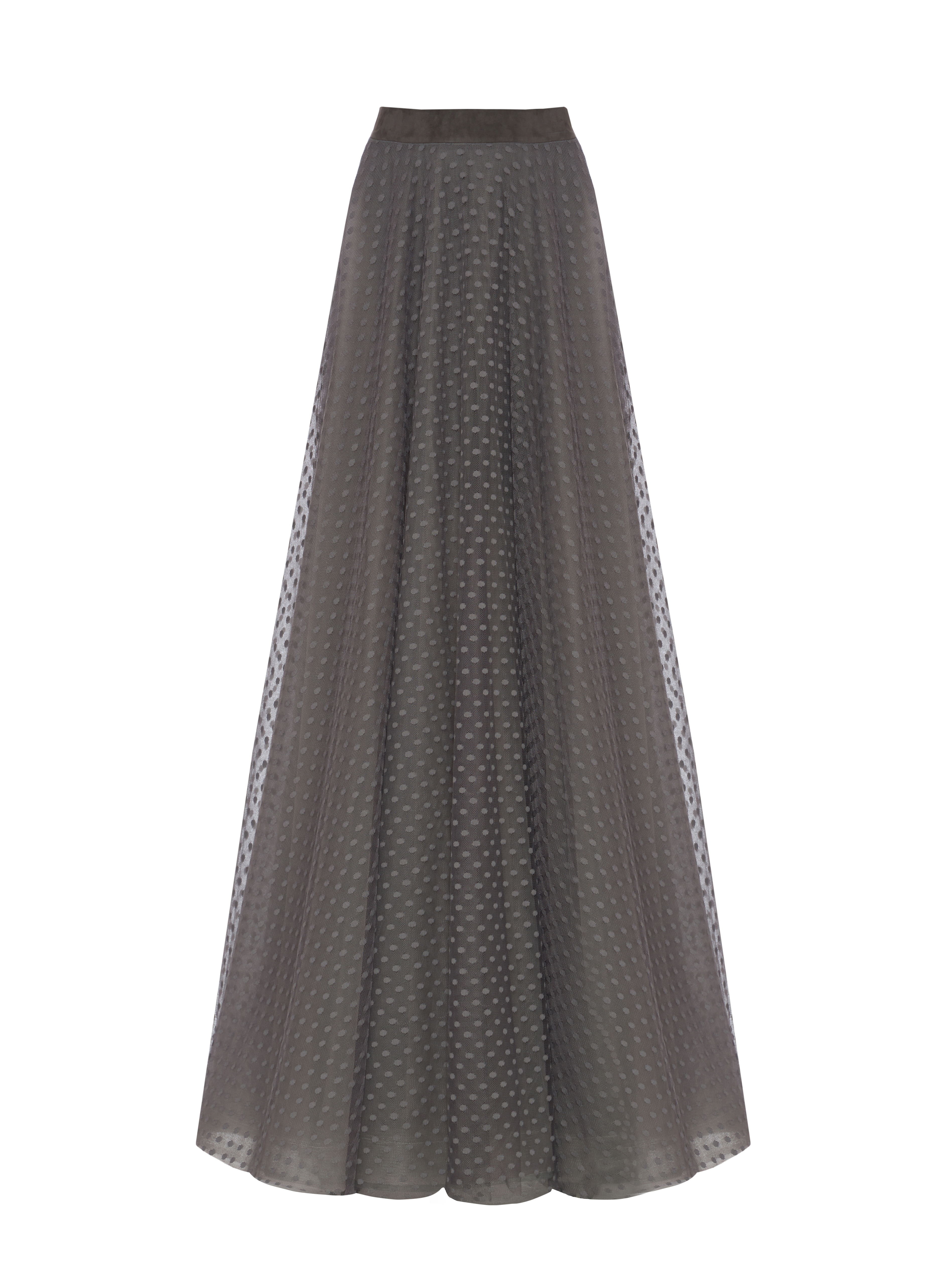 The airy grey skirt is made of four layers of tulle in different shades, with the top layer embroidered with small polka dots. Thin suede belt and back fastening.