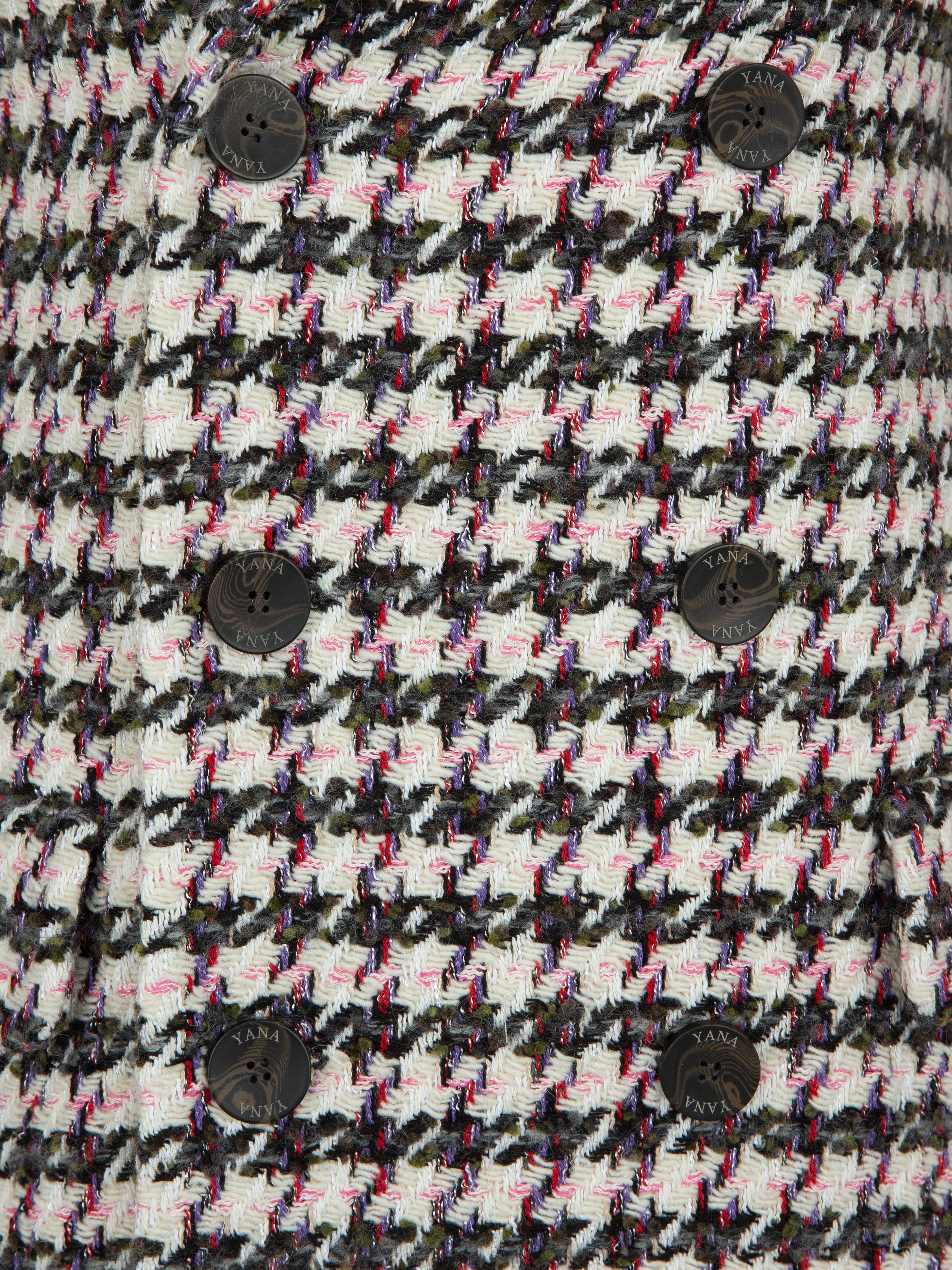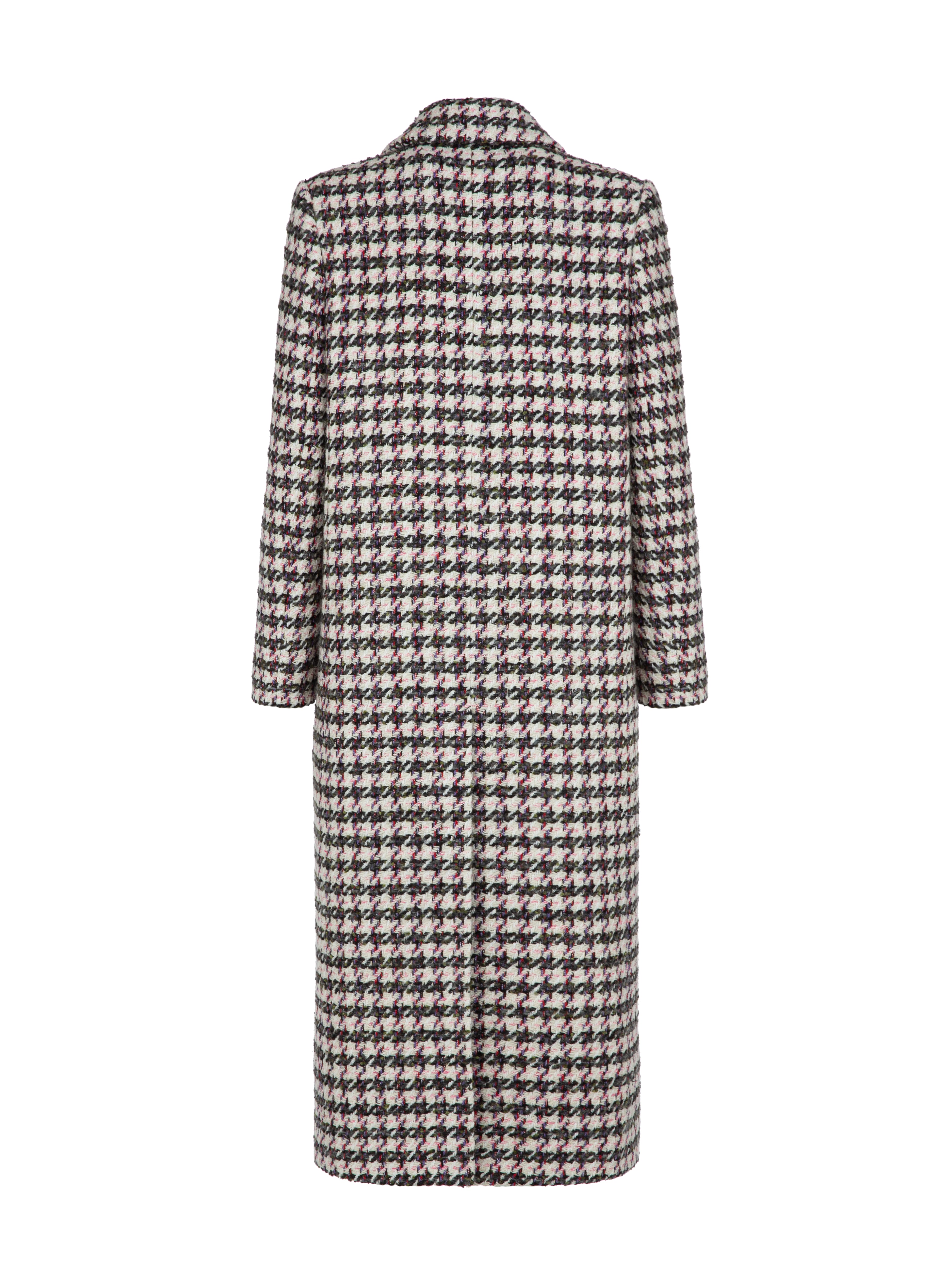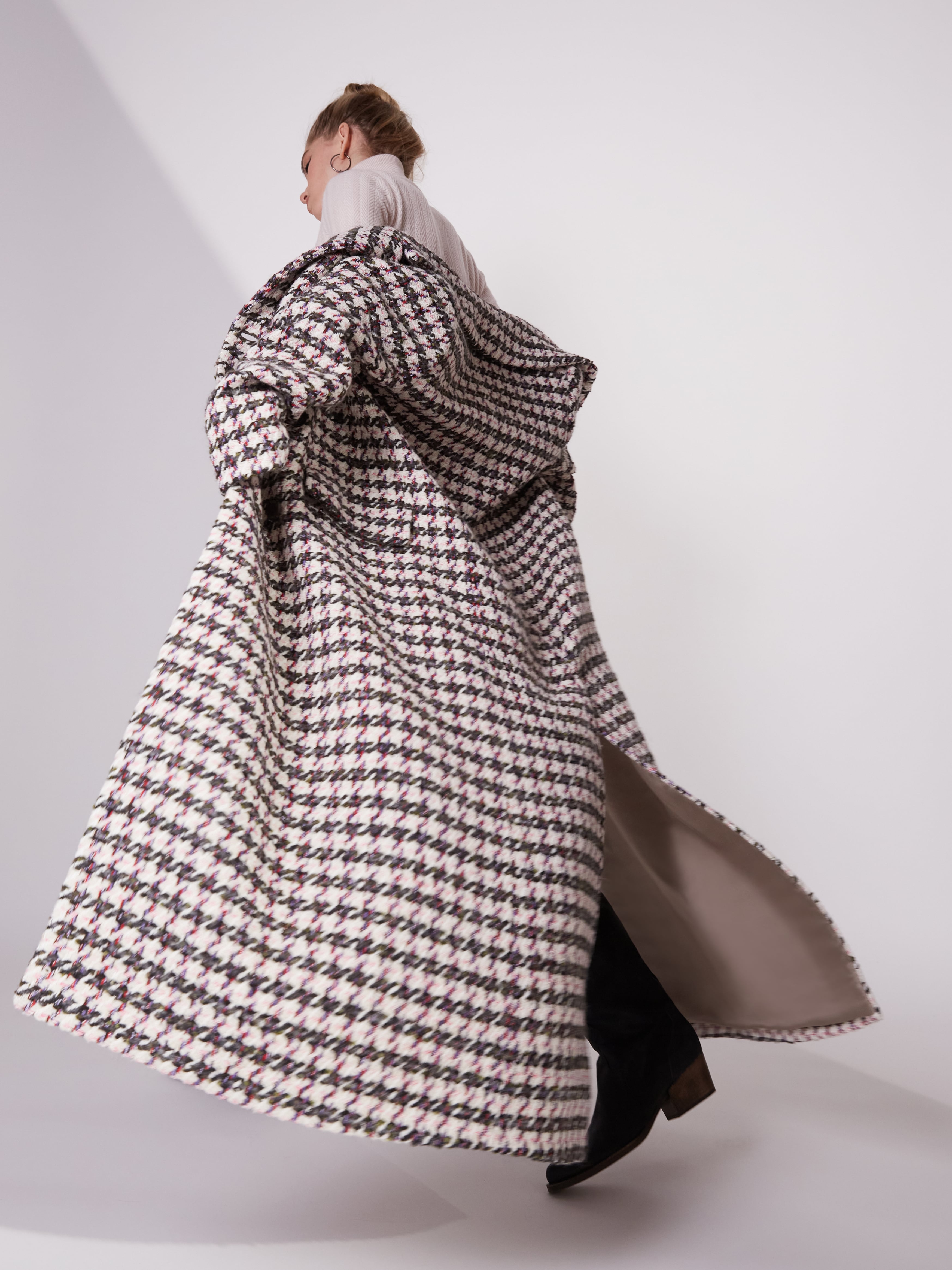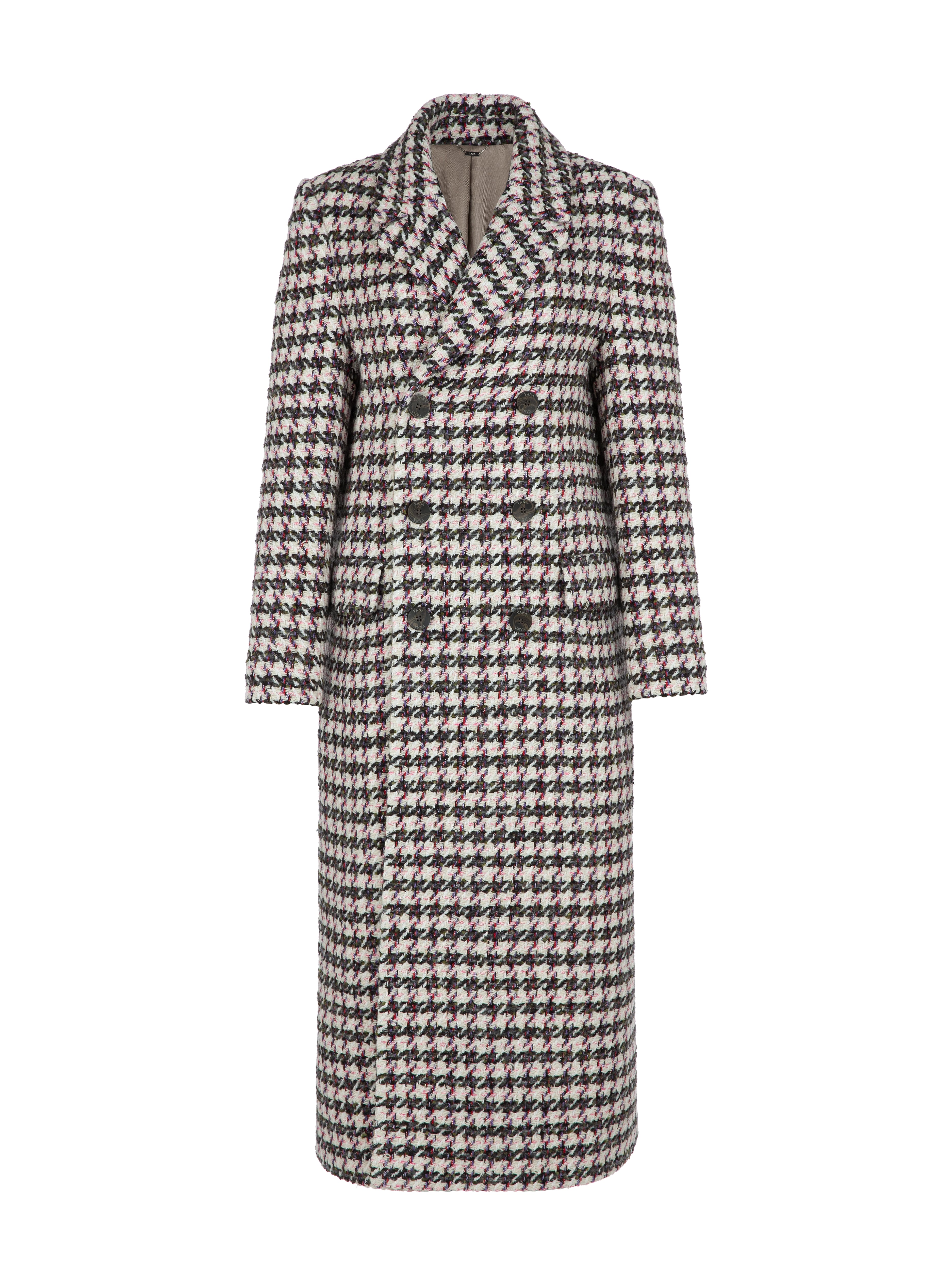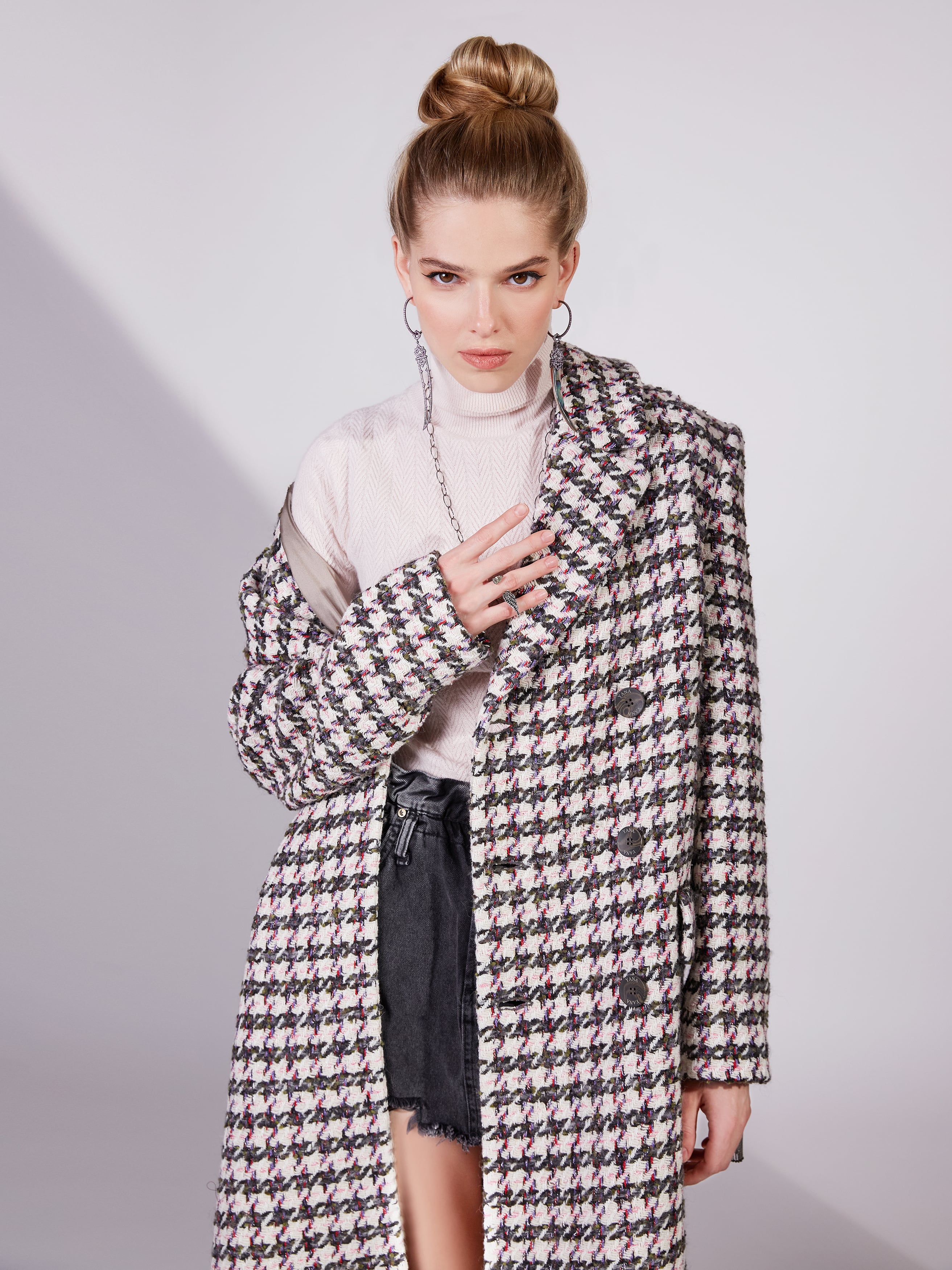 Beige double-breasted coat made of tweed with a pied-de-poule pattern. The coat is complemented by welt pockets with flaps at the front. Straight oversized silhouette.