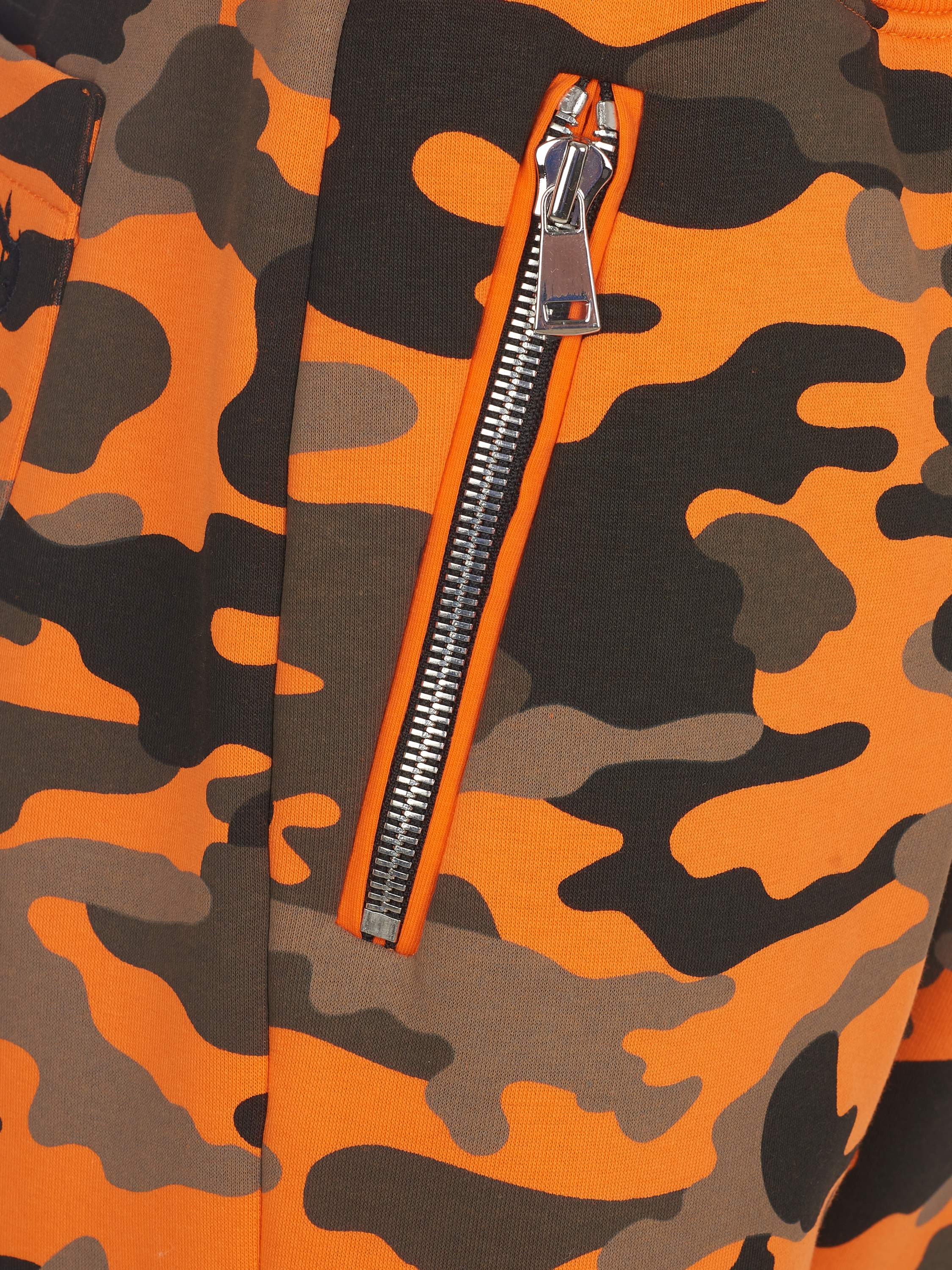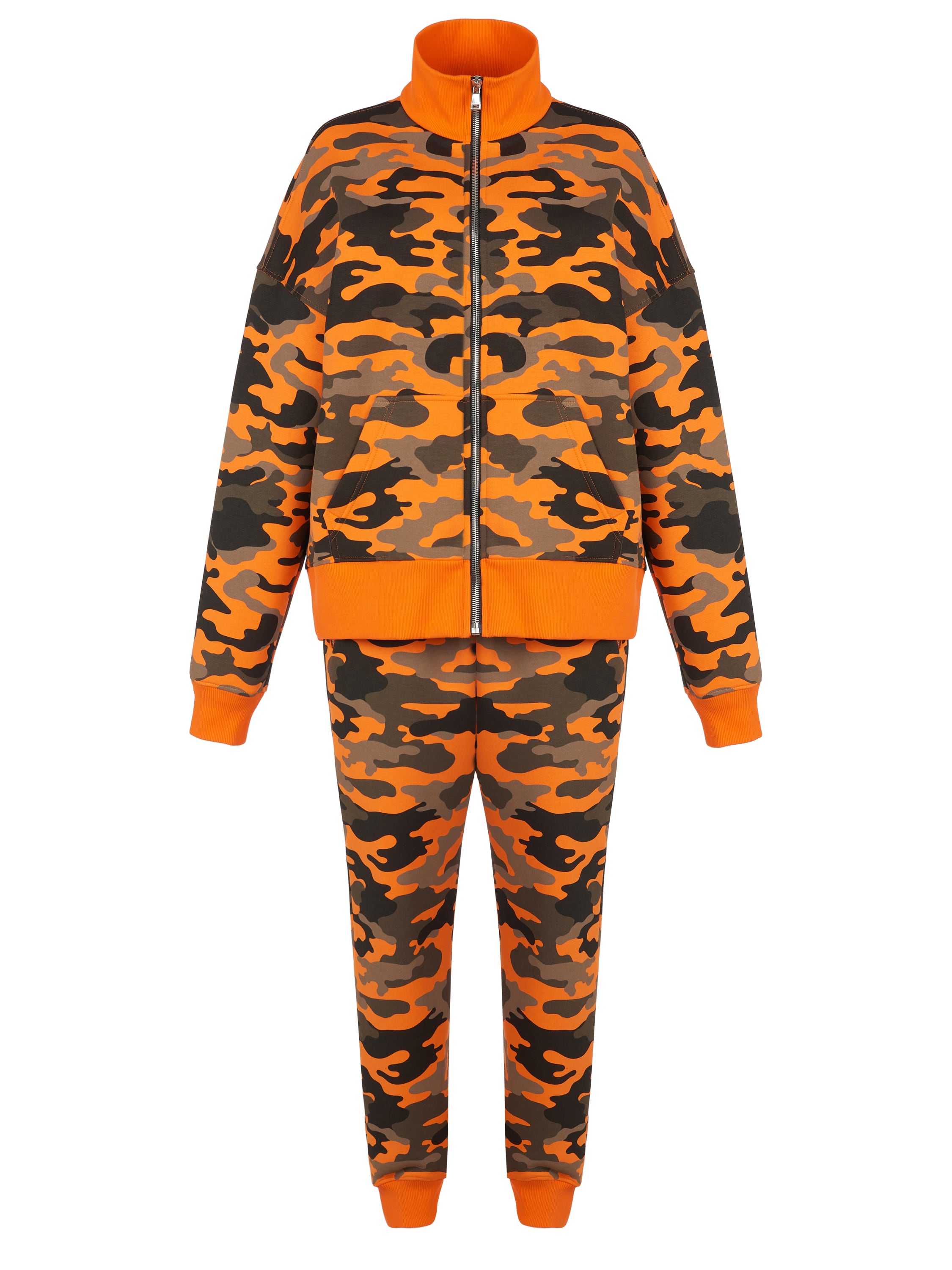 The unisex knitwear set is made of orange camouflage jersey and consists of a zip-up sweatshirt with a stand-up collar and track pants. The cuffs and collar are finished with a wide elastic band; the back pocket on the trousers is not sewn on — for all clients we offer to add personalization with embroidered owner’s initials on it and on the chest (+30% to the cost of the suit).