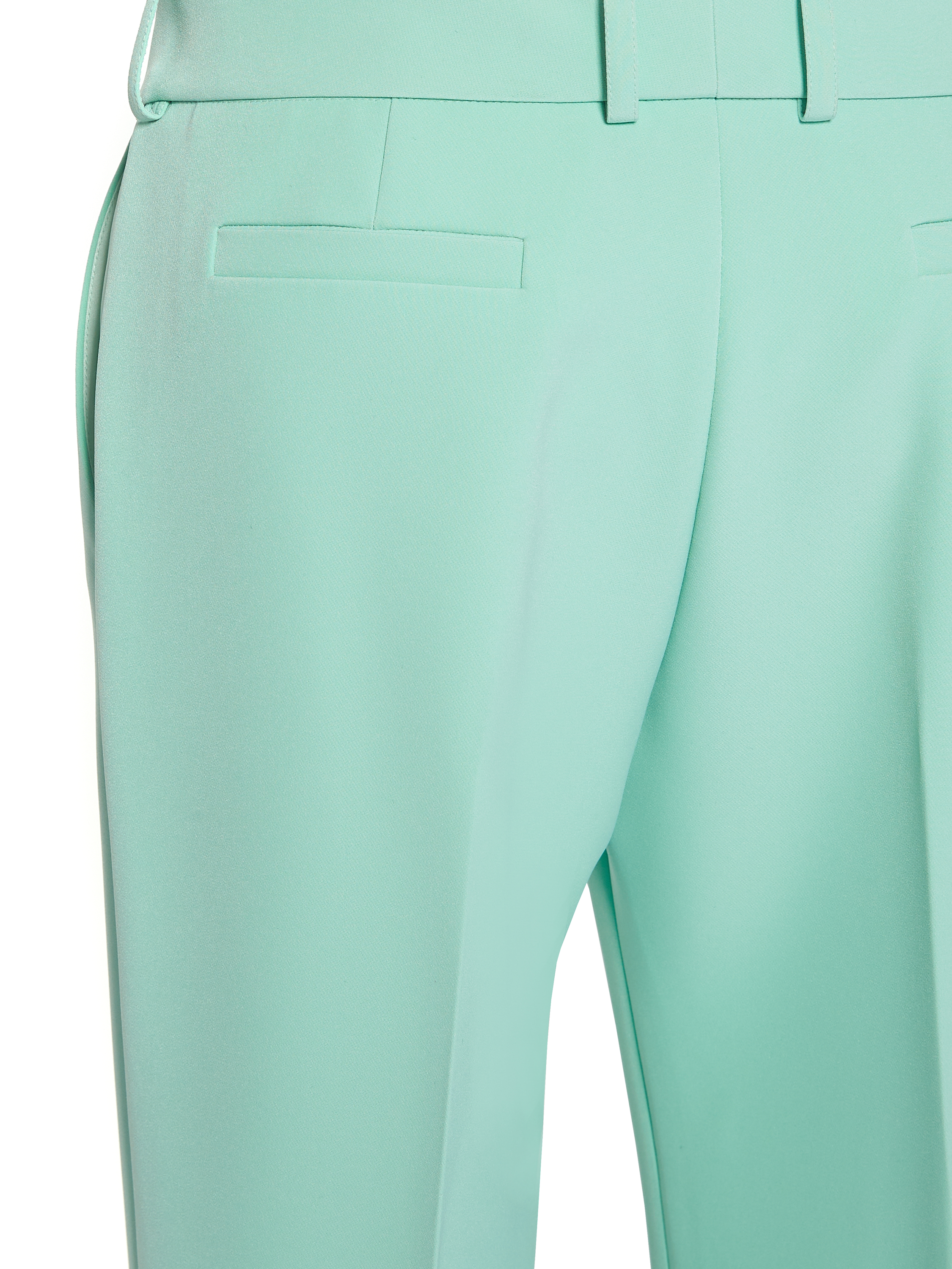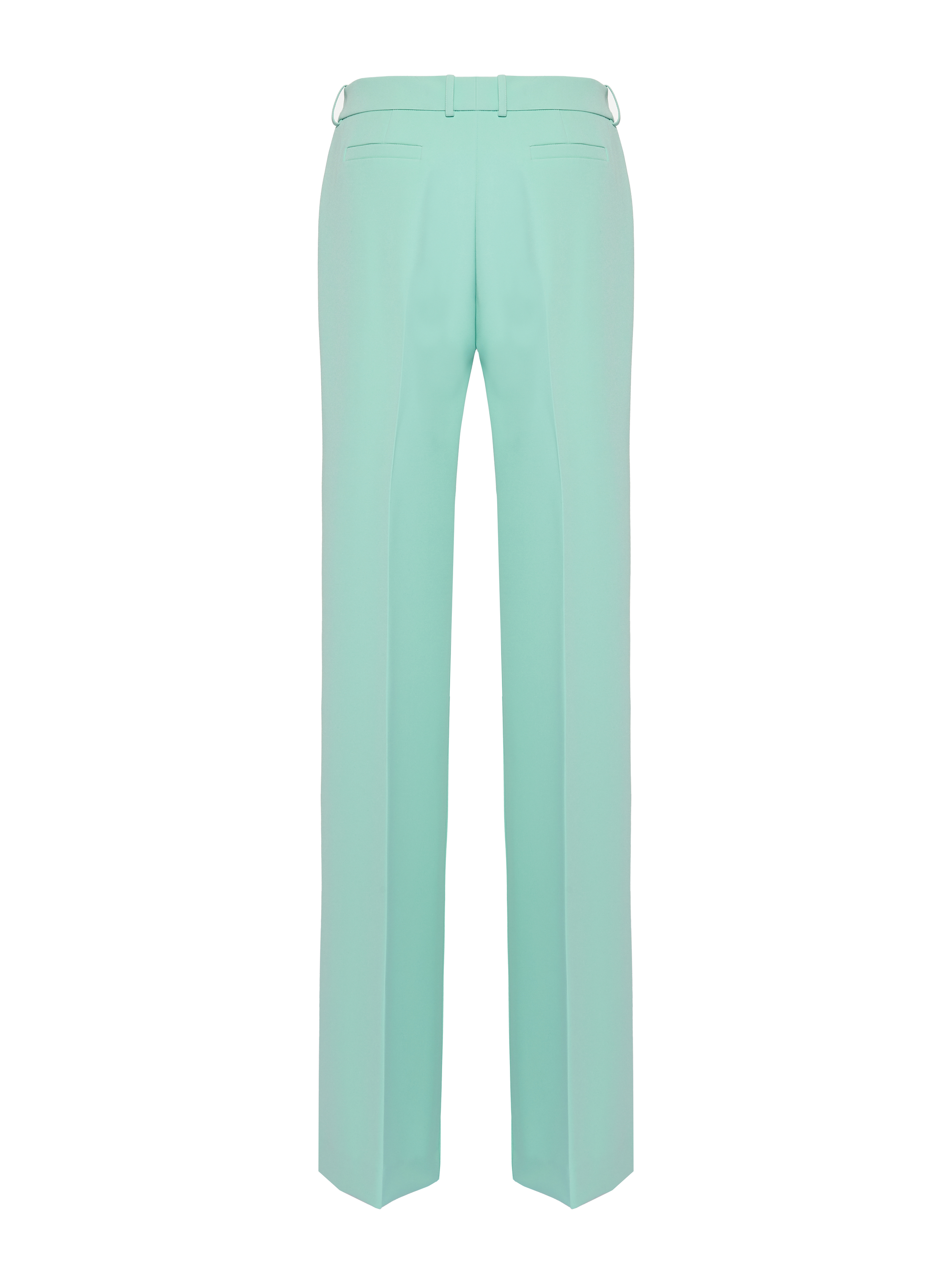 Classic pressed-crease trousers step beyond the borders of a formal wardrobe thanks to the delicate mint shade. The long straight-leg trousers are made of viscose: this material maintains a comfortable microclimate for the body in hot weather.