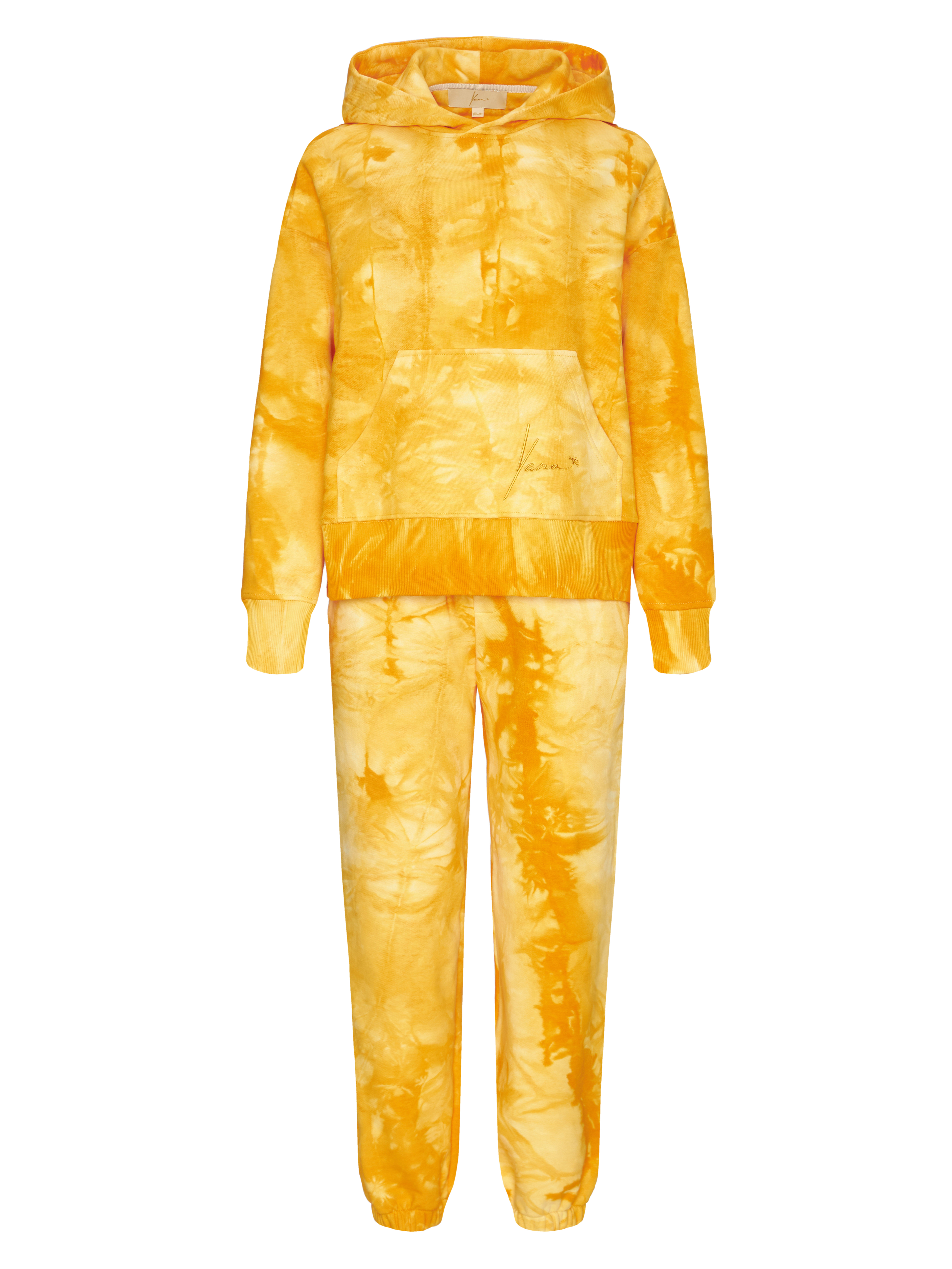 An orange cotton suit dyed in the tie-dye technique consists of a hoodie with a kangaroo pocket and elasticated trousers.