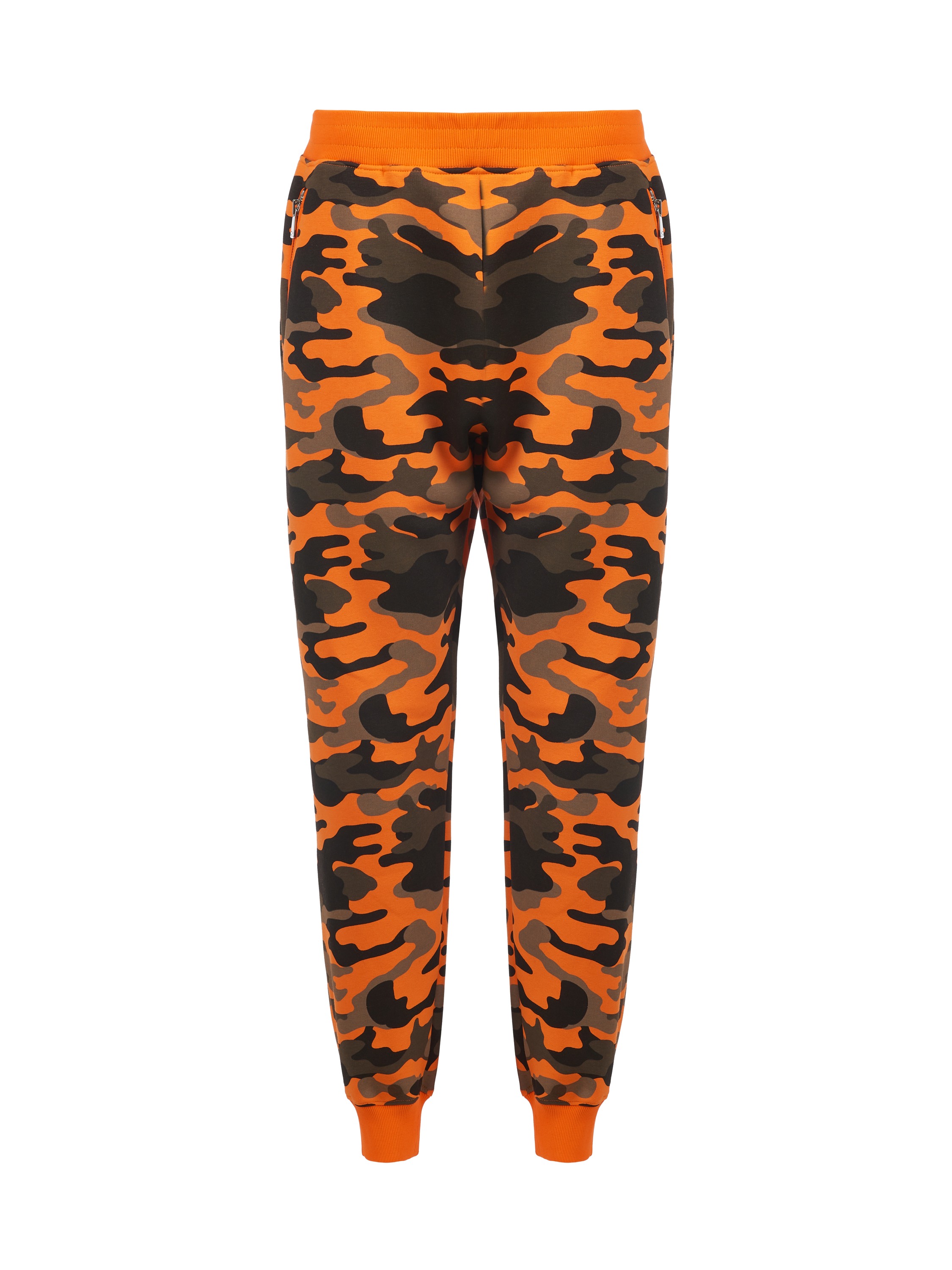 The unisex knitted tracksuit is made of orange jersey with a camouflage print and consists of a zip-up hoodie with a stand collar and track pants. The cuffs and collar are finished with a wide elastic band; the back pocket on the trousers is left unstitched — for all clients we offer to add personalization with embroidered owner’s initials on it and on the chest (+30% to the cost of the suit).