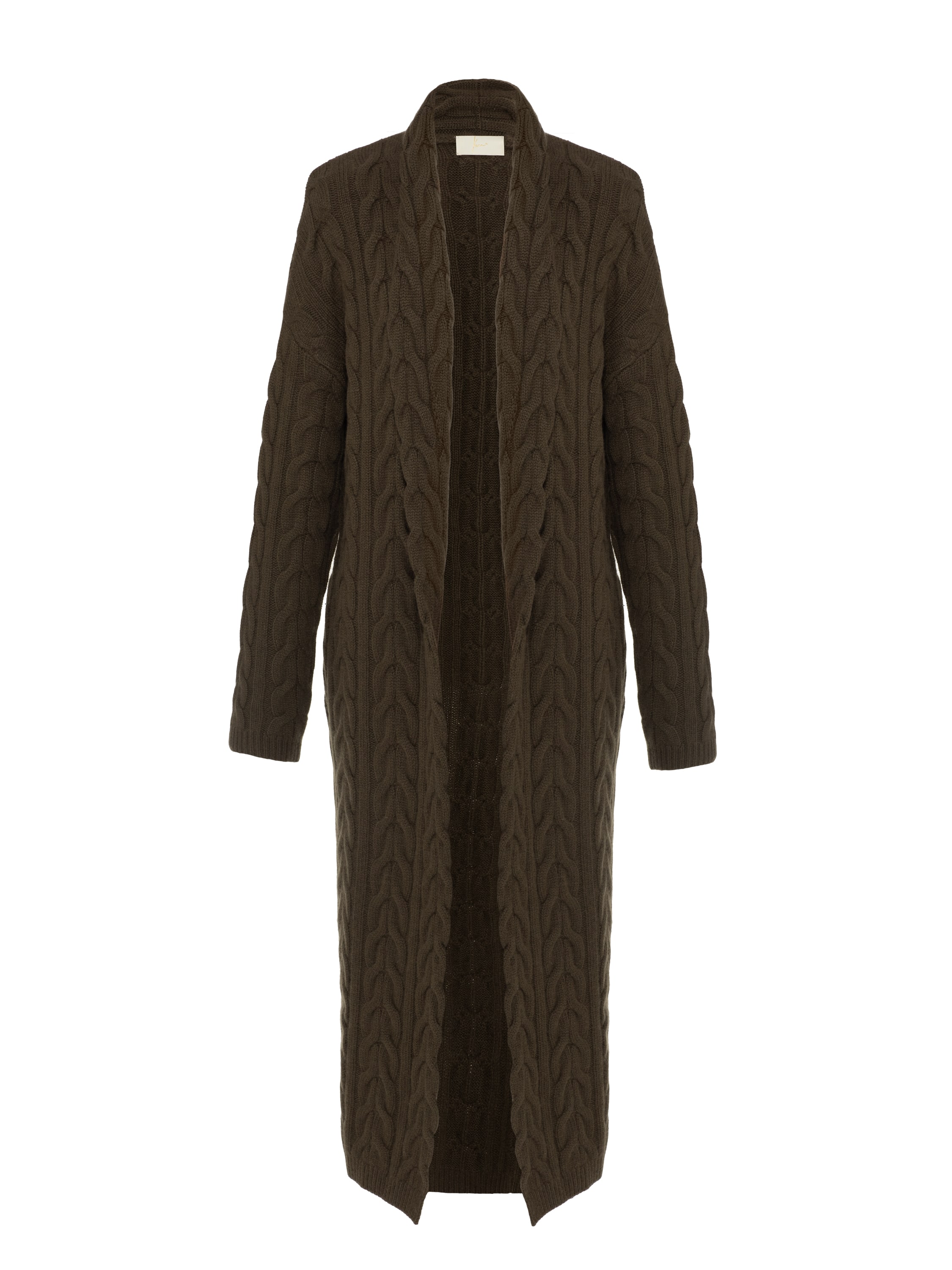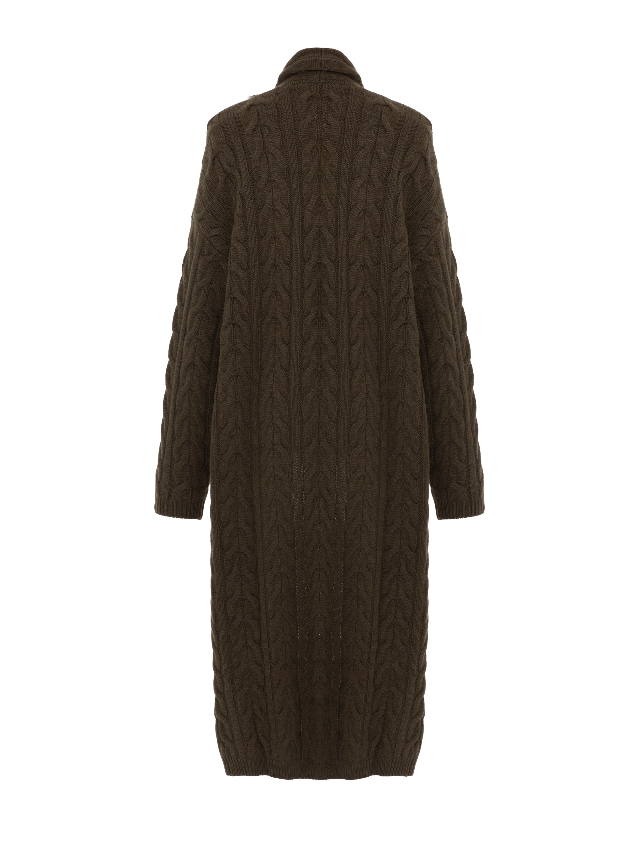 Knitted cashmere coat-cardigan made of 100% natural cashmere in khaki color. Shawl collar, no fastening, cable knit.