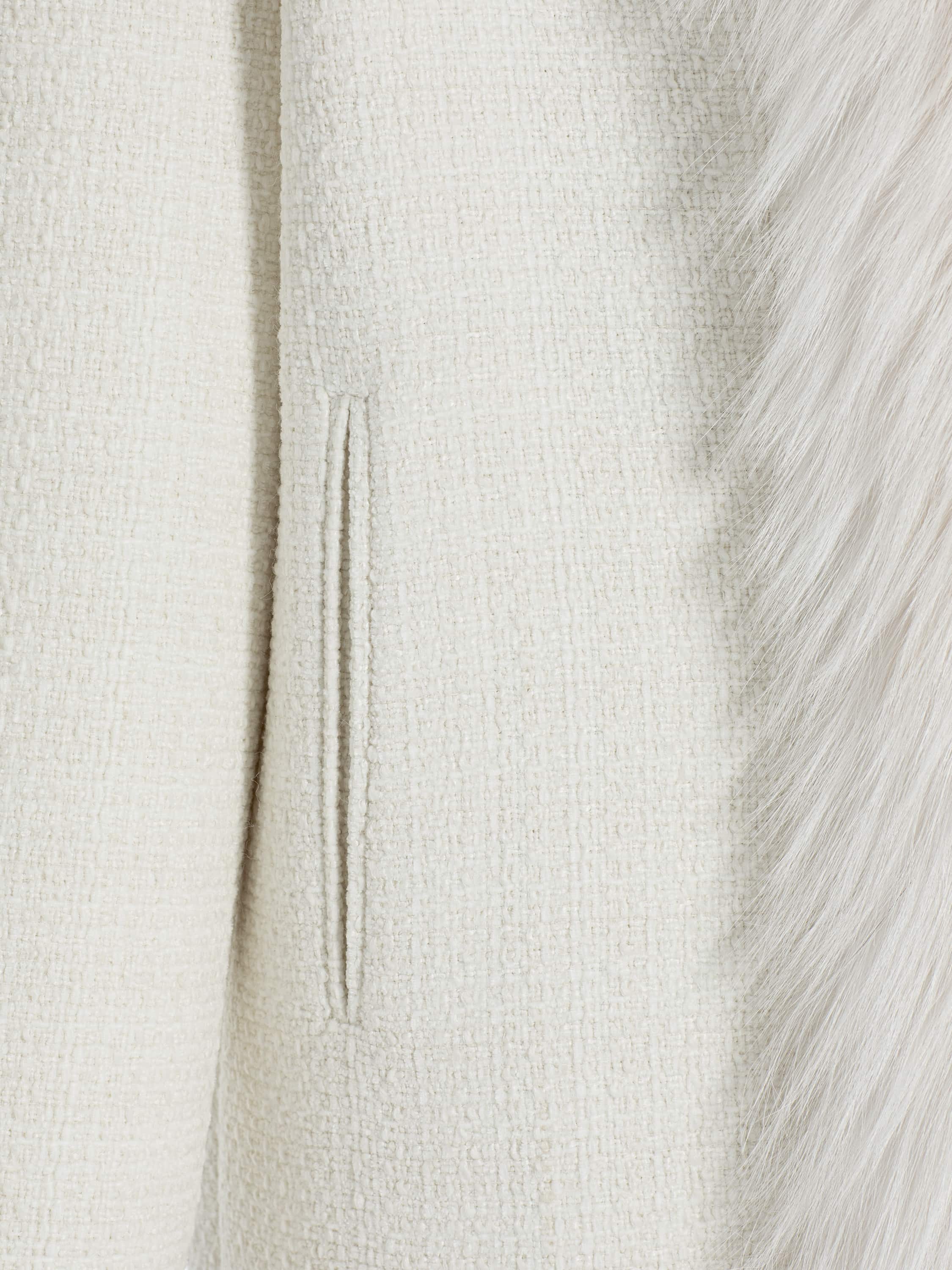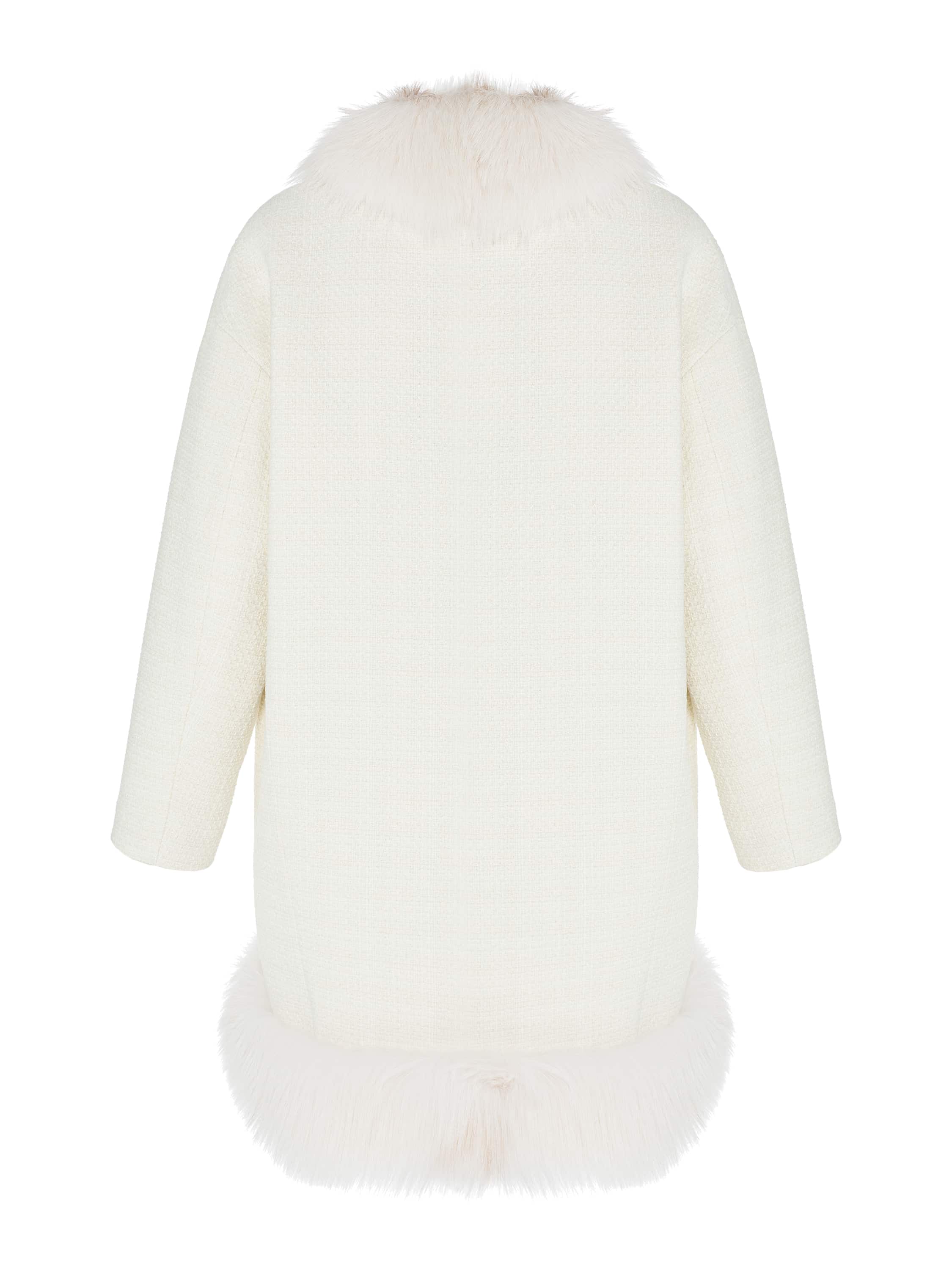 The milky coat is made of tweed fabric and complemented with precious fox fur. Since ancient times, fox fur has been considered a symbol of luxury, wealth and high status. Loose-fit design.
