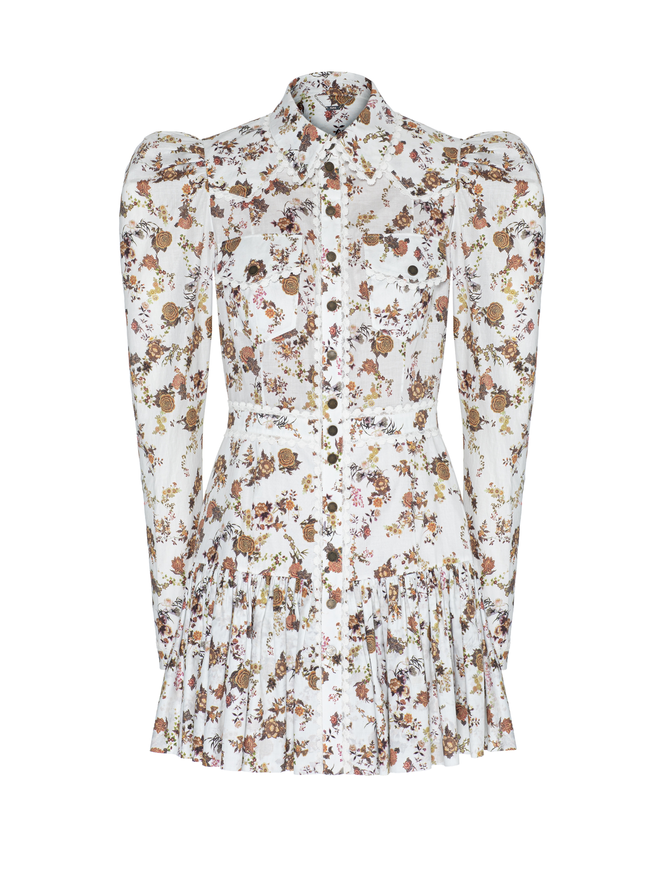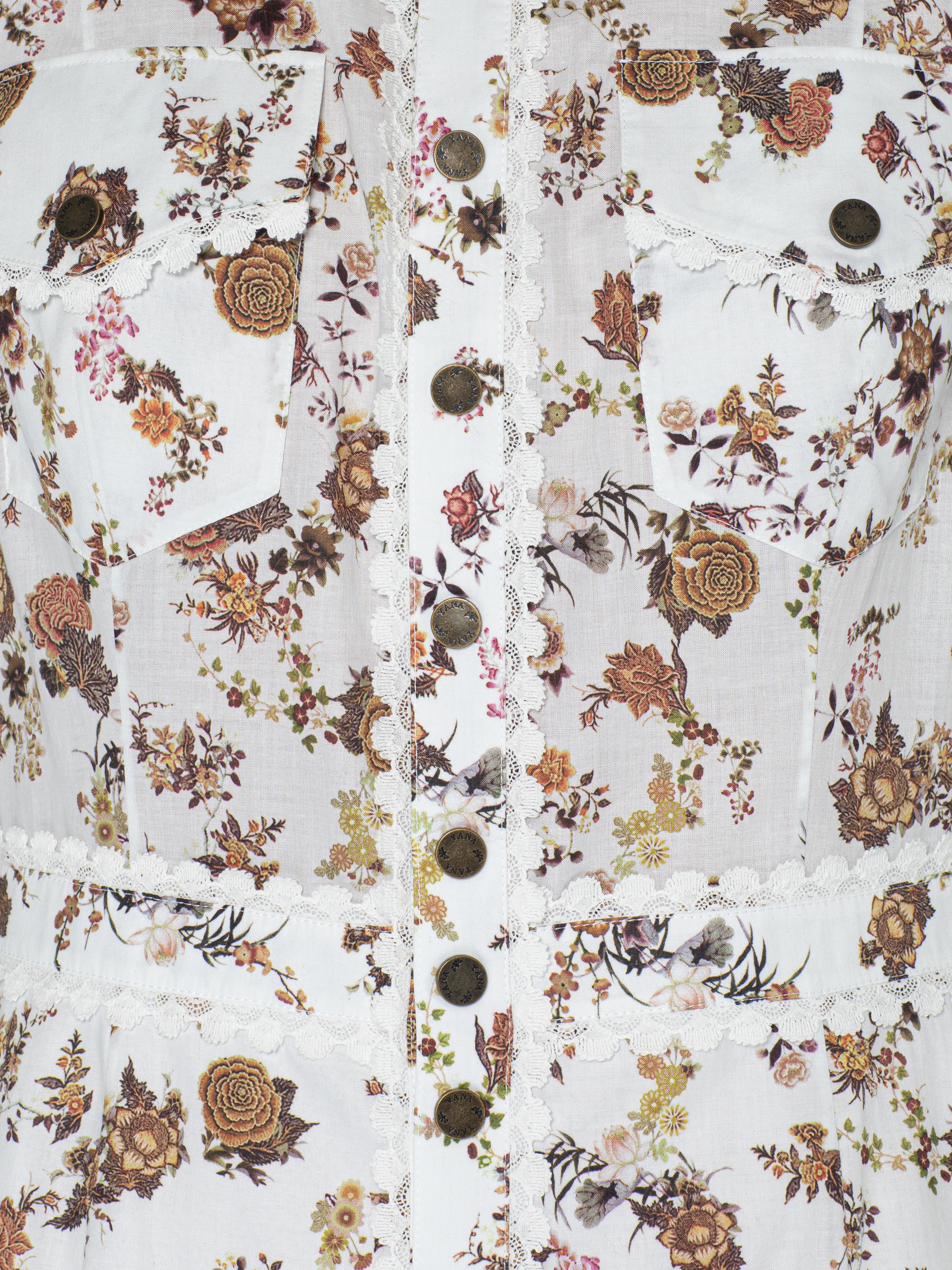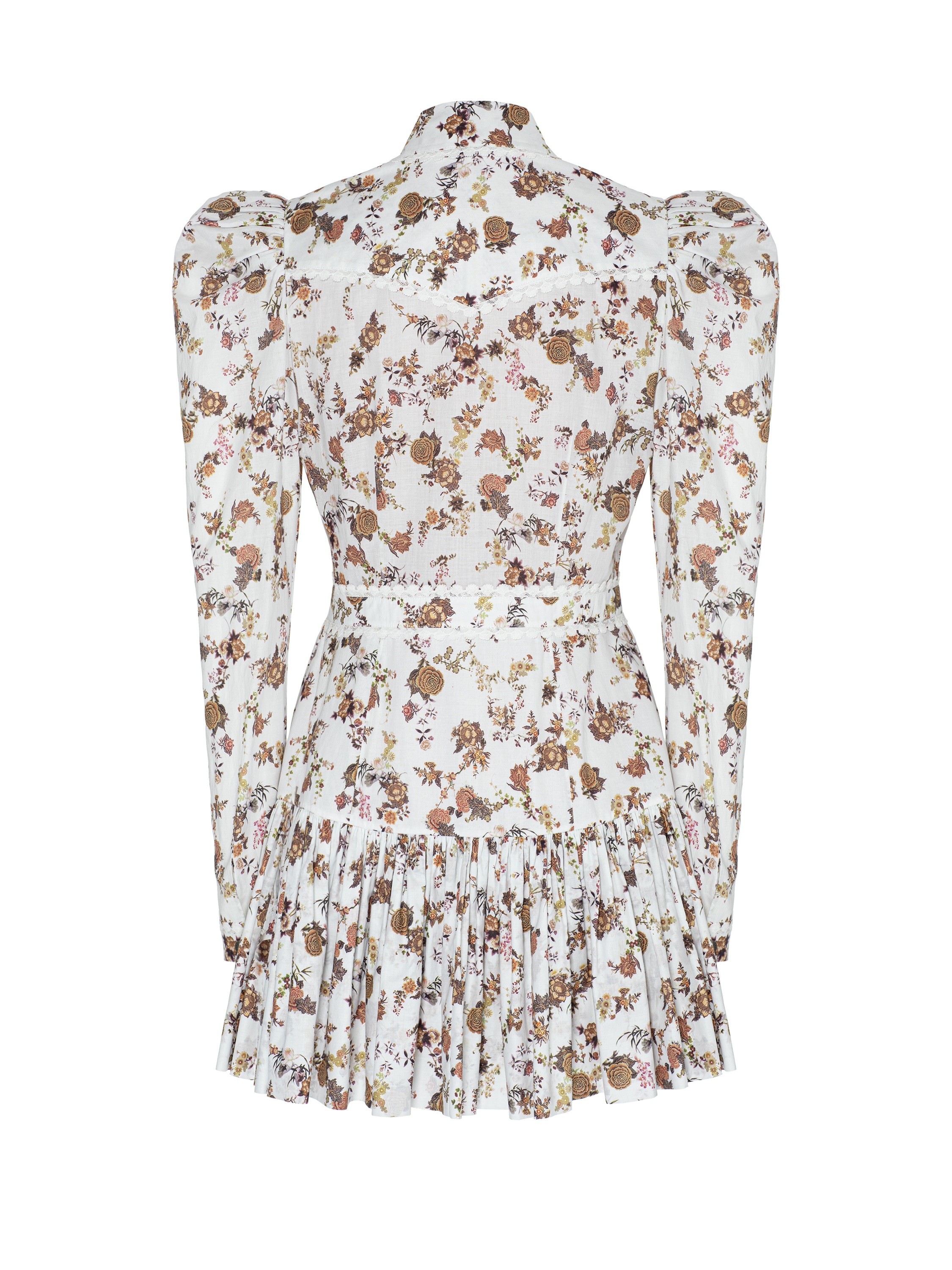 An elegant dress made of delicate milky cotton is adorned with a refined print of brown flowers, creating a romantic and feminine look. The design draws attention with a flounced skirt that gives the silhouette special grace and lightness, while lace trim adds sophistication and charm to the dress.