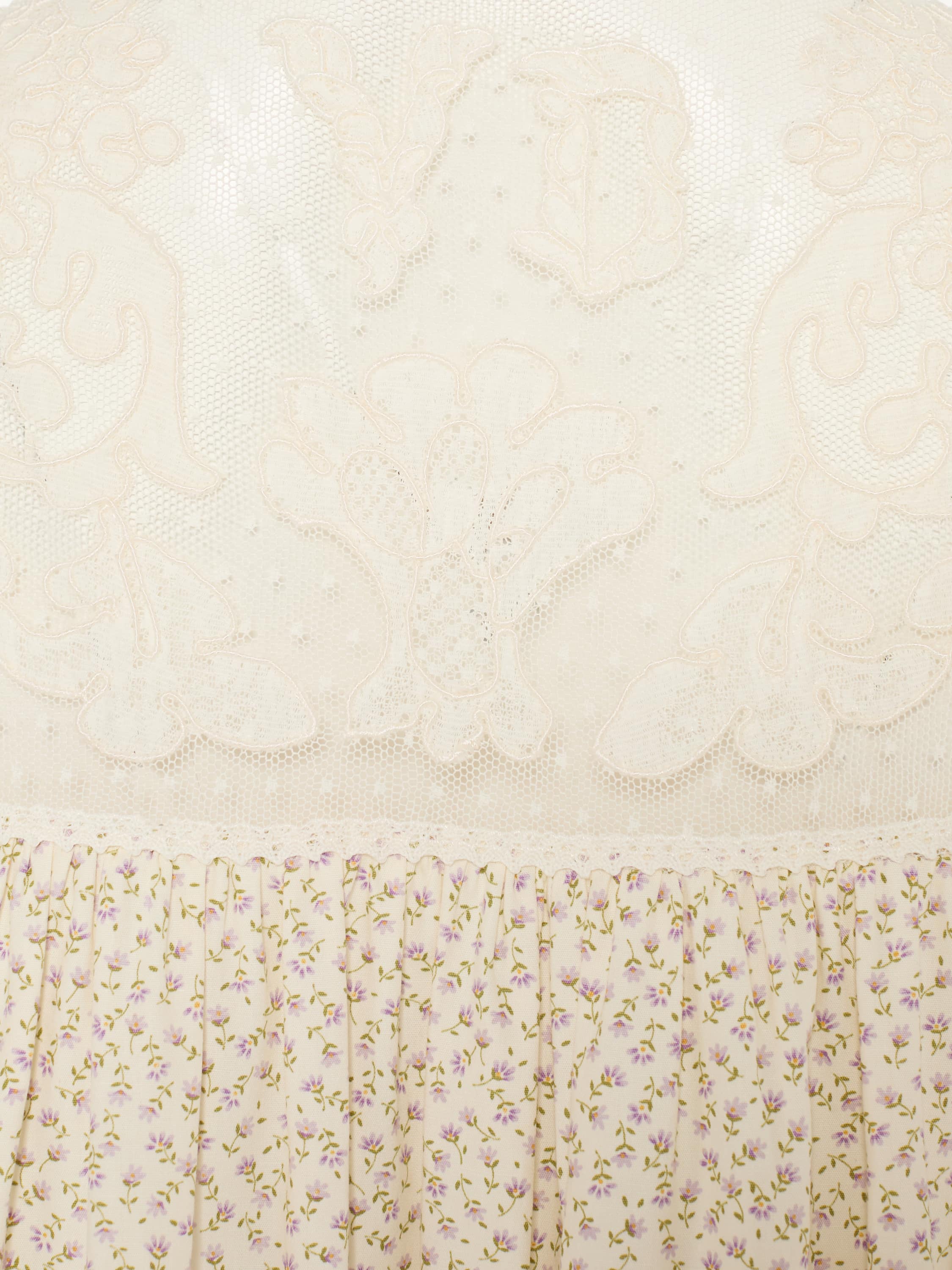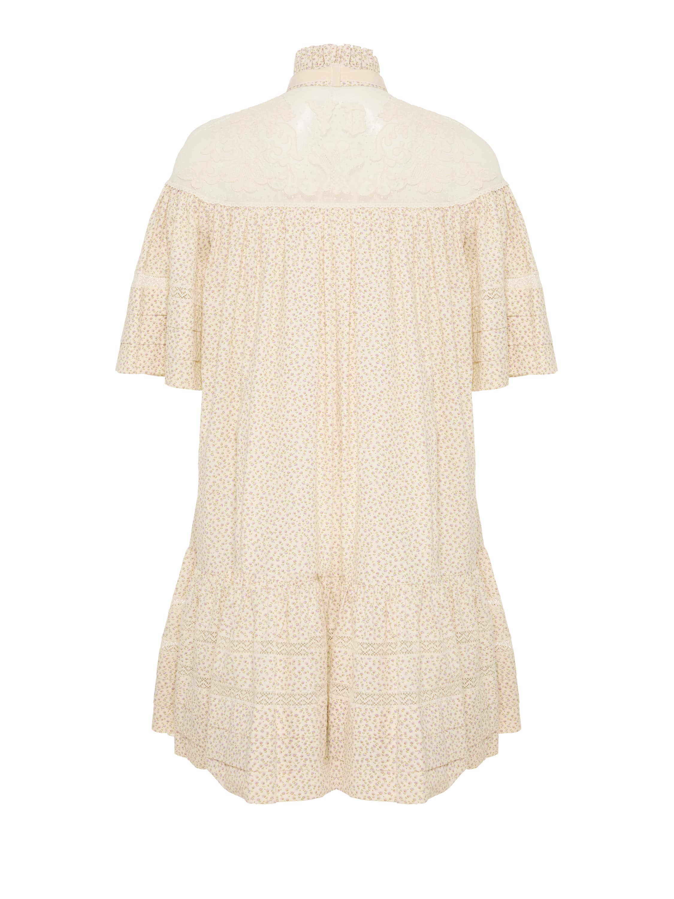 Milk-colored mini dress with floral print and lace