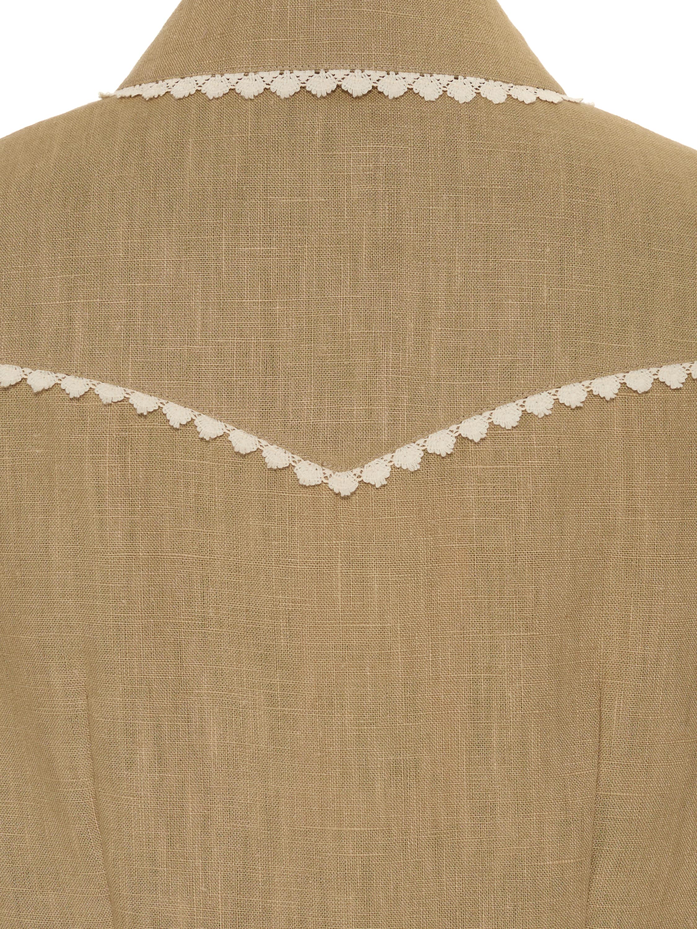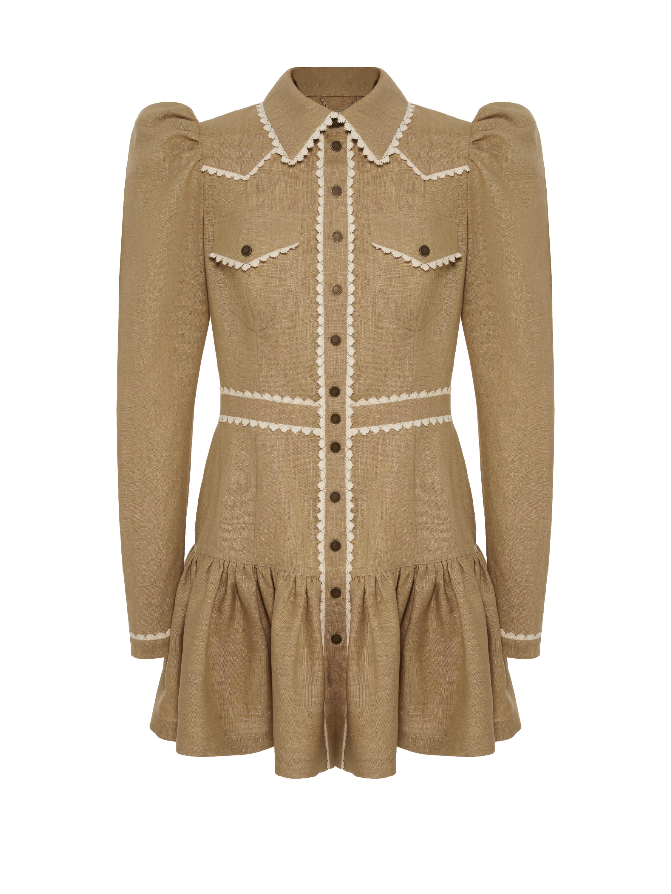 The everyday mini dress made of natural linen in a noble olive color will become an indispensable item in your summer wardrobe. The model with a detachable flounce on the skirt and pockets with decorative flaps on the chest is decorated with lace braid. Fastens with snap buttons along the entire front length.
