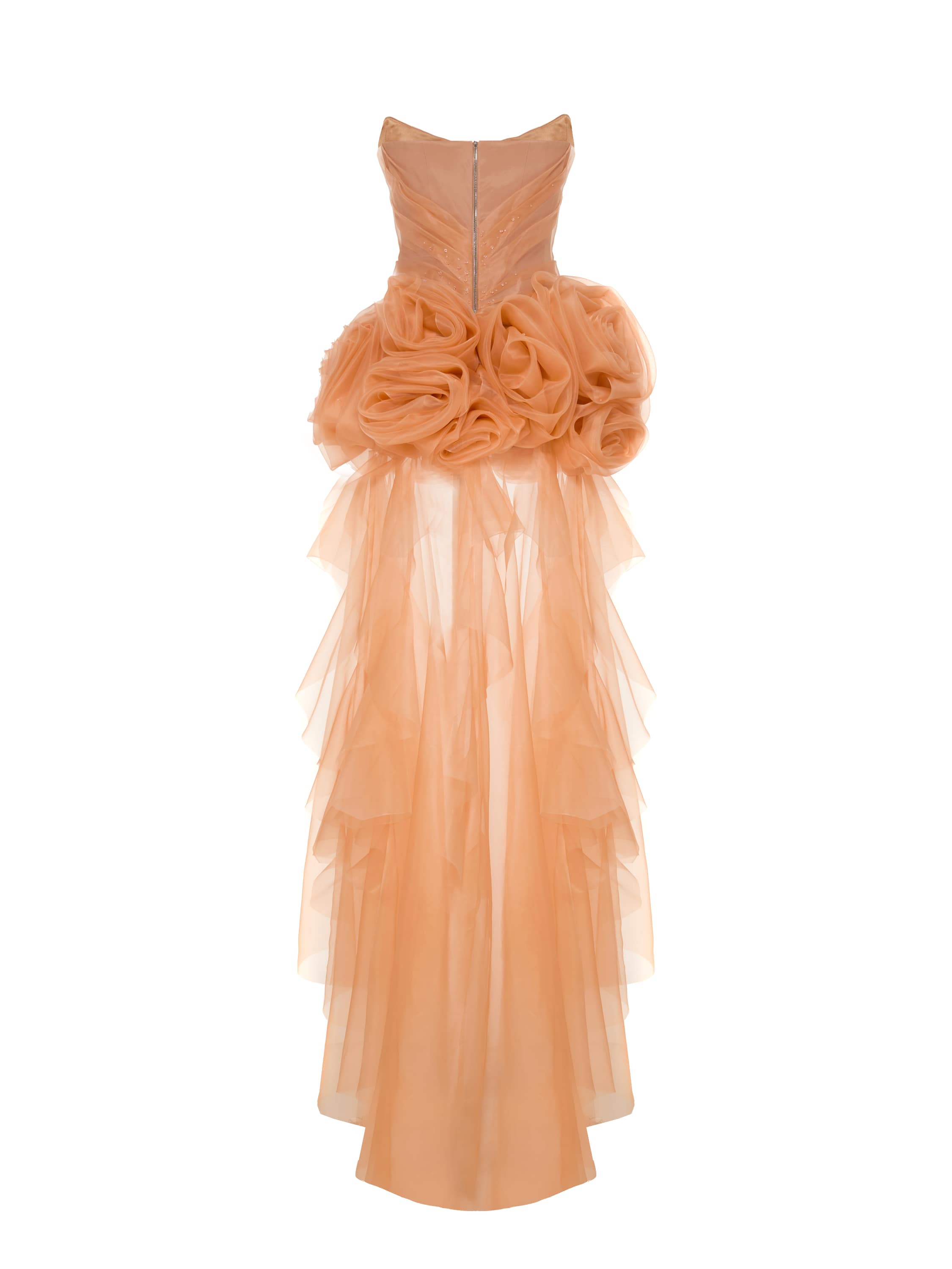 An elegant evening dress with a long train is made of light semi-sheer orange organza. The corset bodice with draping gracefully emphasizes the figure, while the high-low skirt with voluminous flowers creates a unique romantic silhouette. The decoration of the piece (hand embroidery with bicones) required 20 hours of handwork by the masters of the Yana Fashion House.
