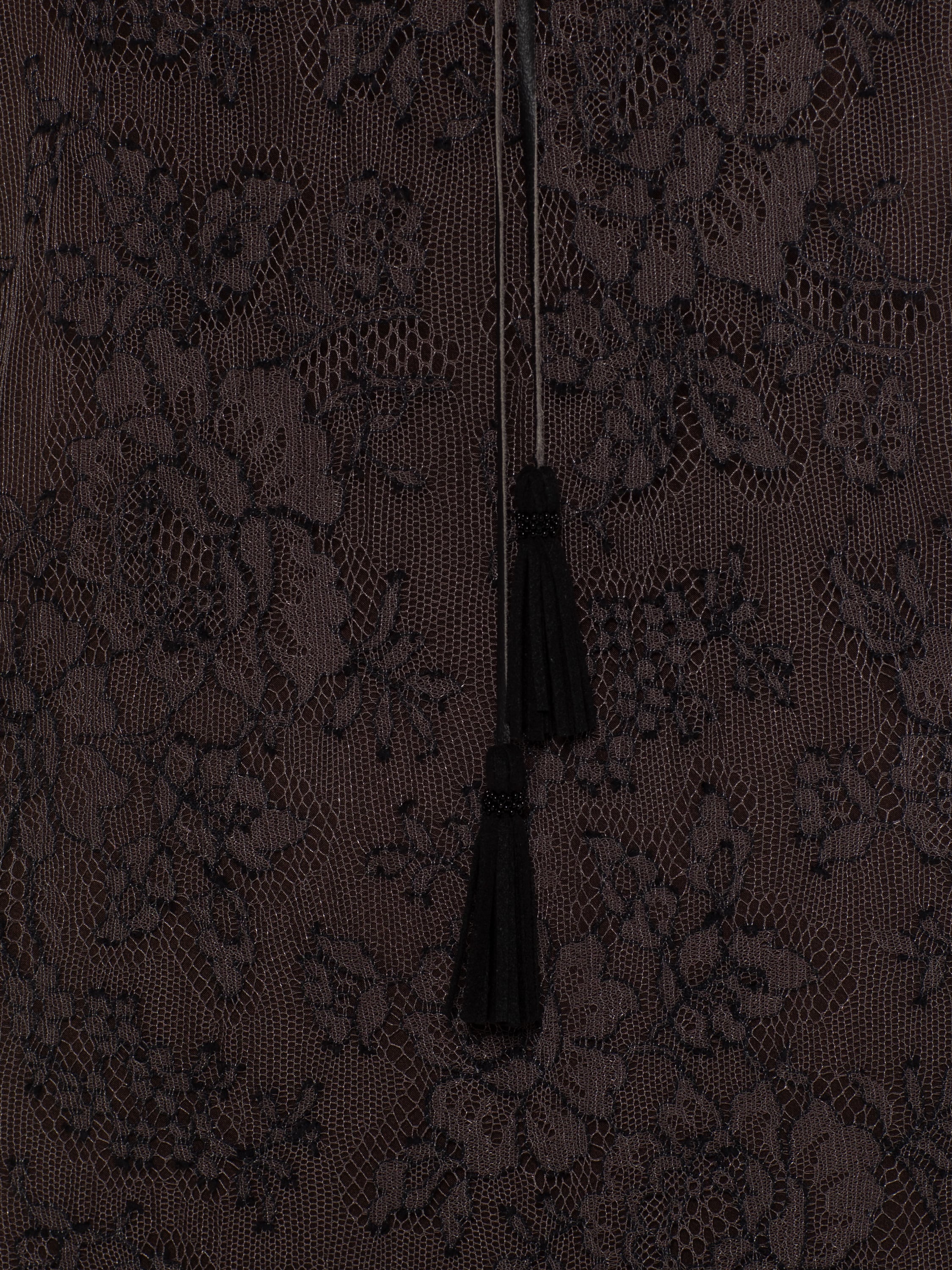 The grey-brown midi dress with 3/4 sleeves is made of semi-sheer lace. The model is complemented by inserts of natural brown leather on the shoulders and sleeves, bead embroidery and tassel ties at the chest. The dress comes with a matching silk slip.