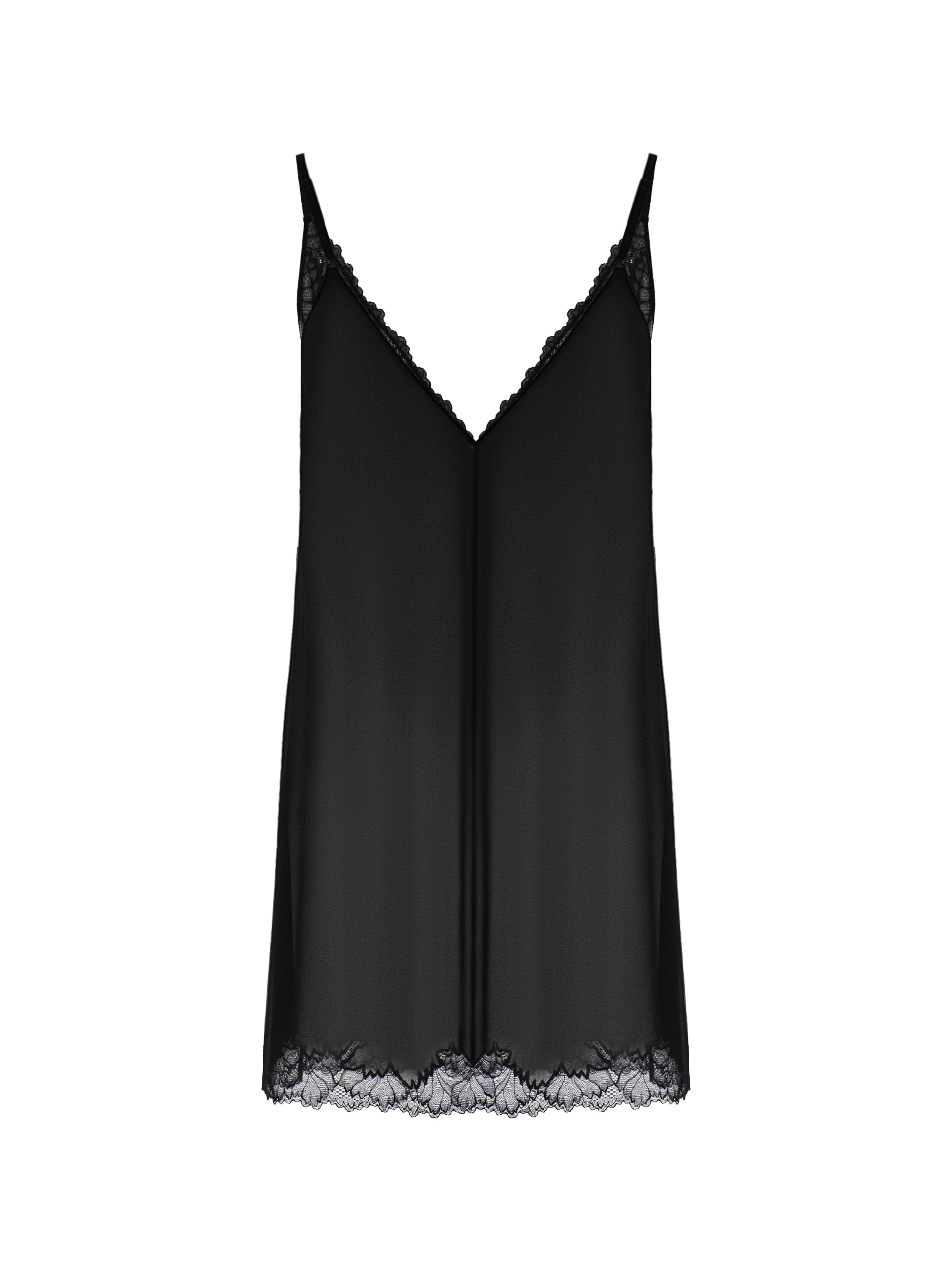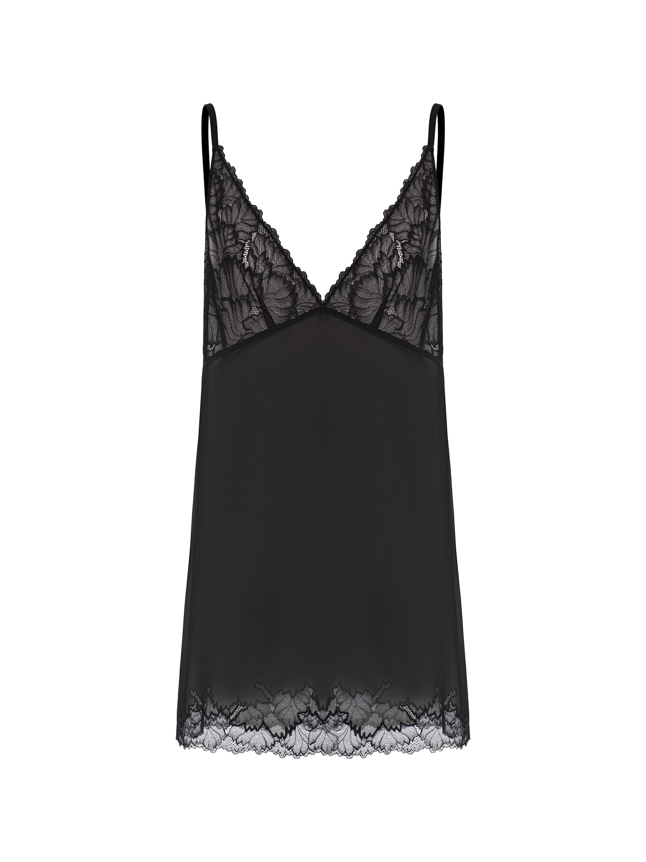 The black slip dress is made of black chiffon. The classic model is decorated with a lace bodice and lace trim along the bottom edge.