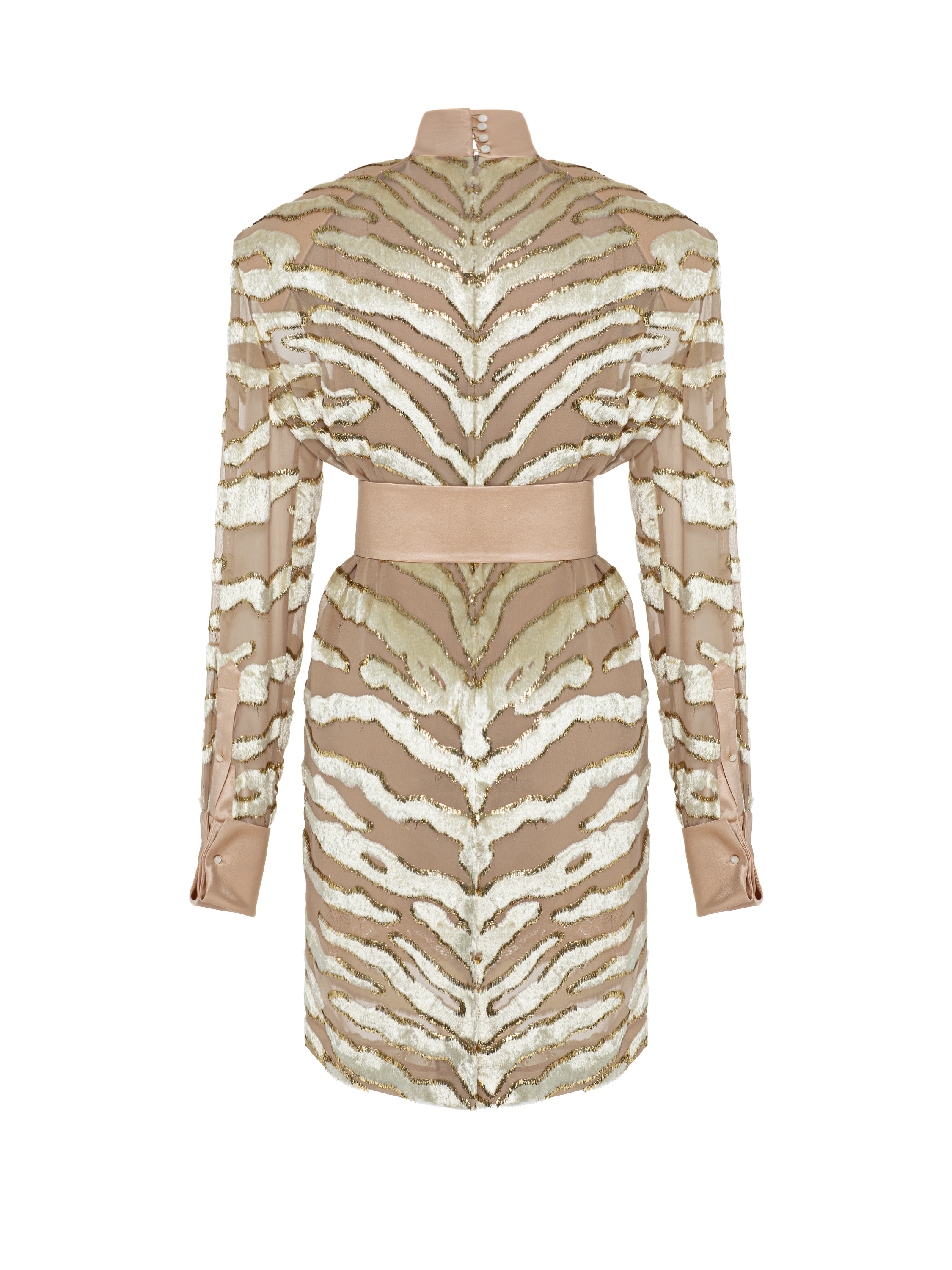 The midi dress made of beige devoré velvet with a trendy animal print is a striking and memorable evening look. The set includes a short slip dress made of silk chiffon with lace and a wide waist belt.
