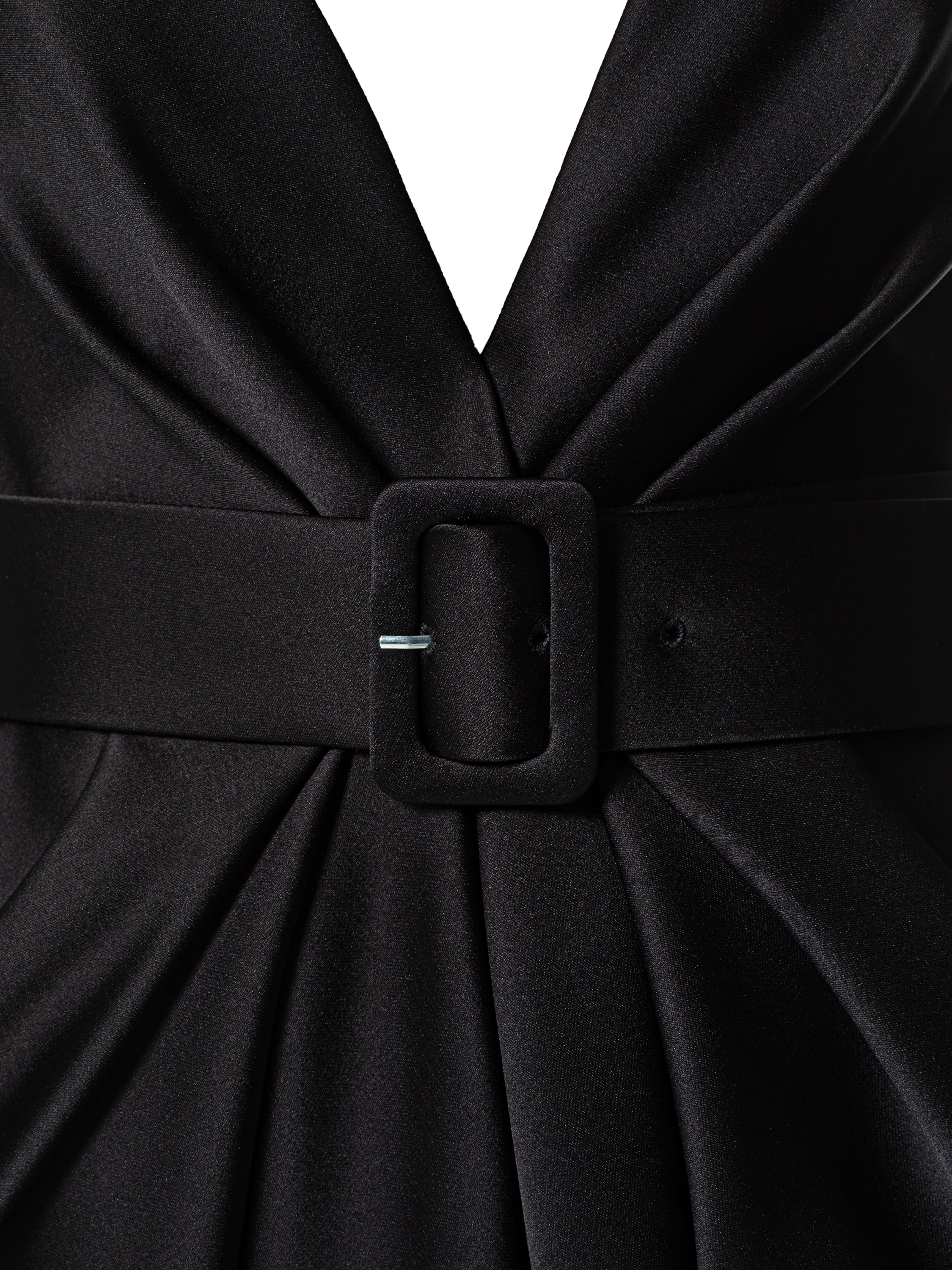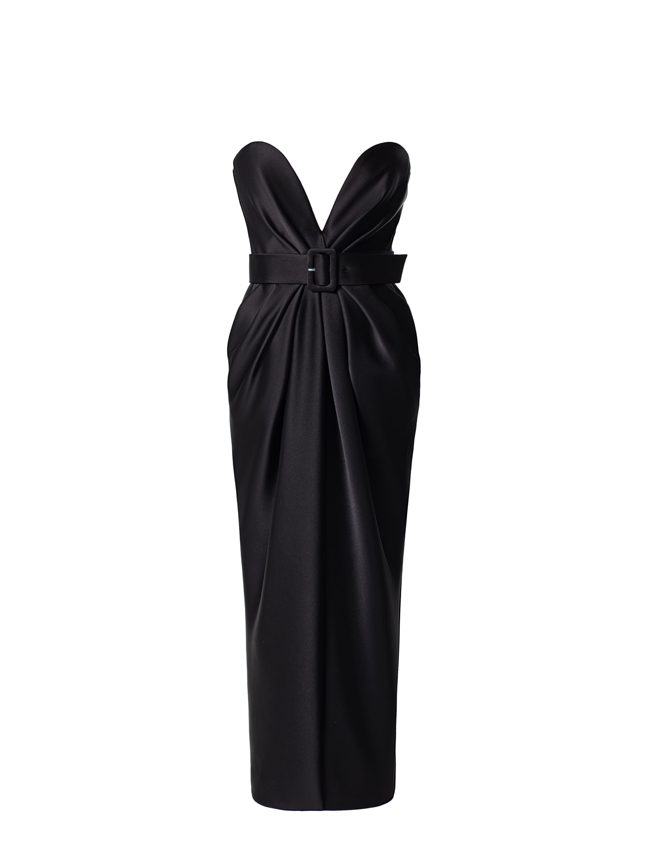 A midi dress with a striking corset-style sweetheart neckline, made of black duchesse satin. The model is decorated with drapery and a wide waist belt. It fastens with a concealed zipper at the back.