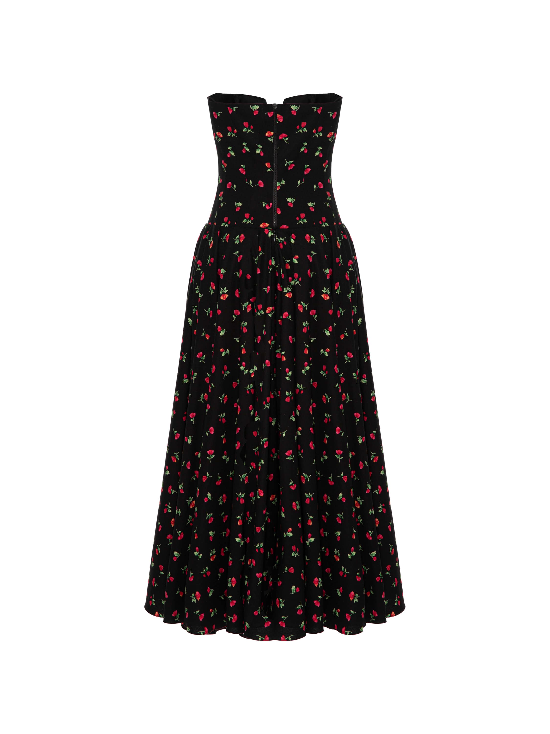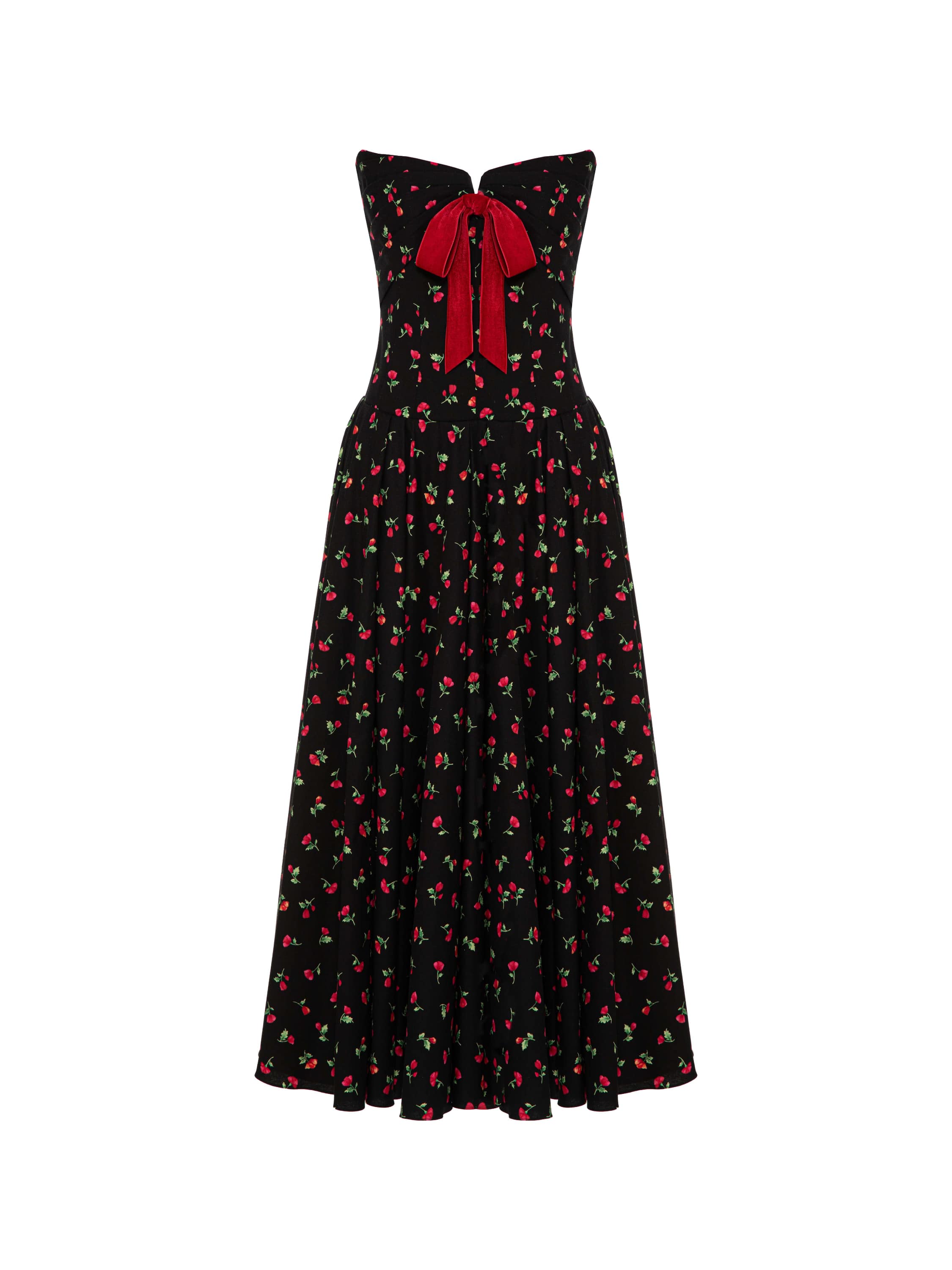 An elegant midi dress is made of black cotton with a bright floral print that creates a contrasting and memorable look. The piece features a sophisticated sweetheart corset bodice and a voluminous skirt that emphasize the femininity of the silhouette. The finishing touch is a striking red bow that adds a touch of romance to the look.