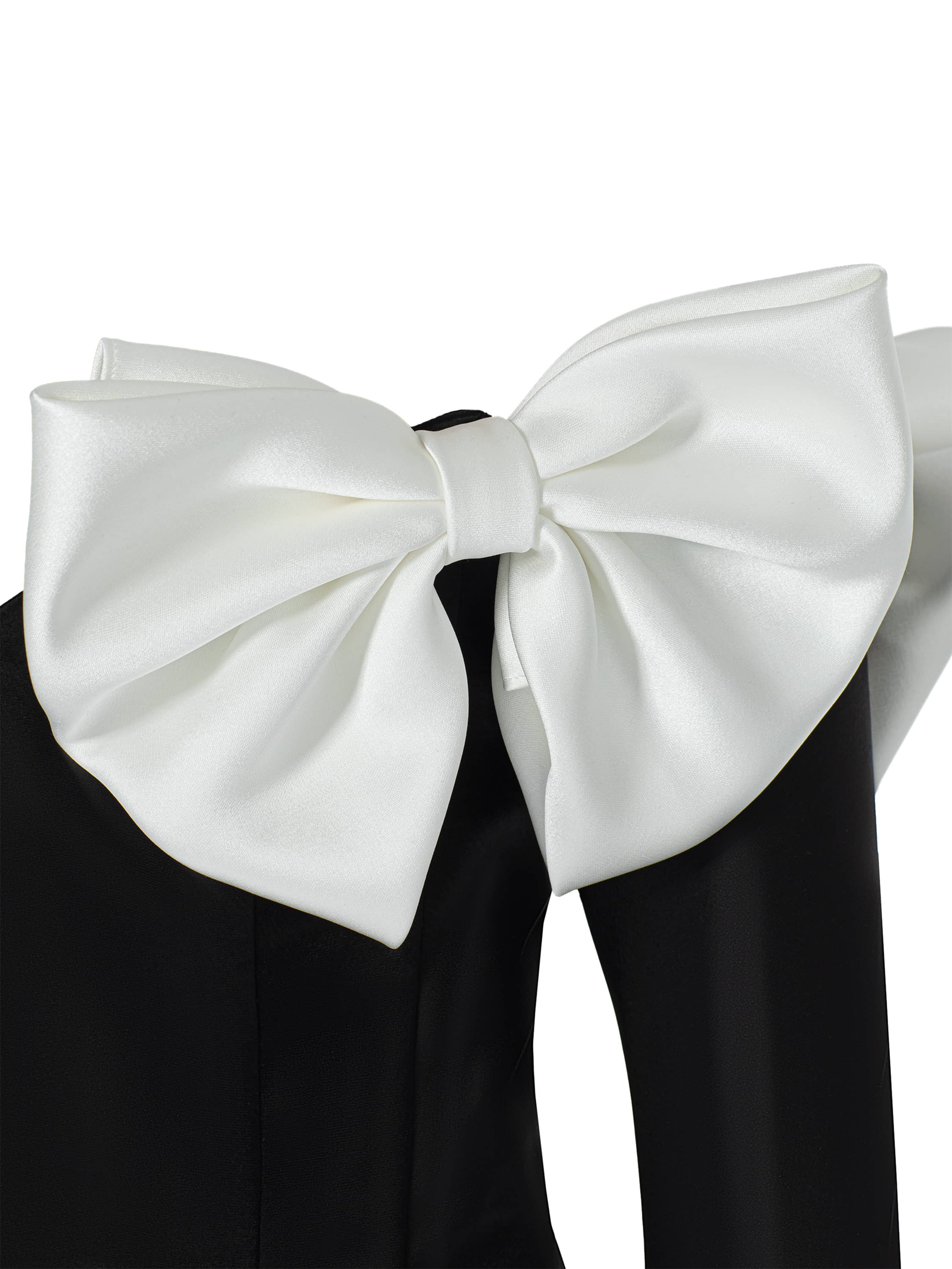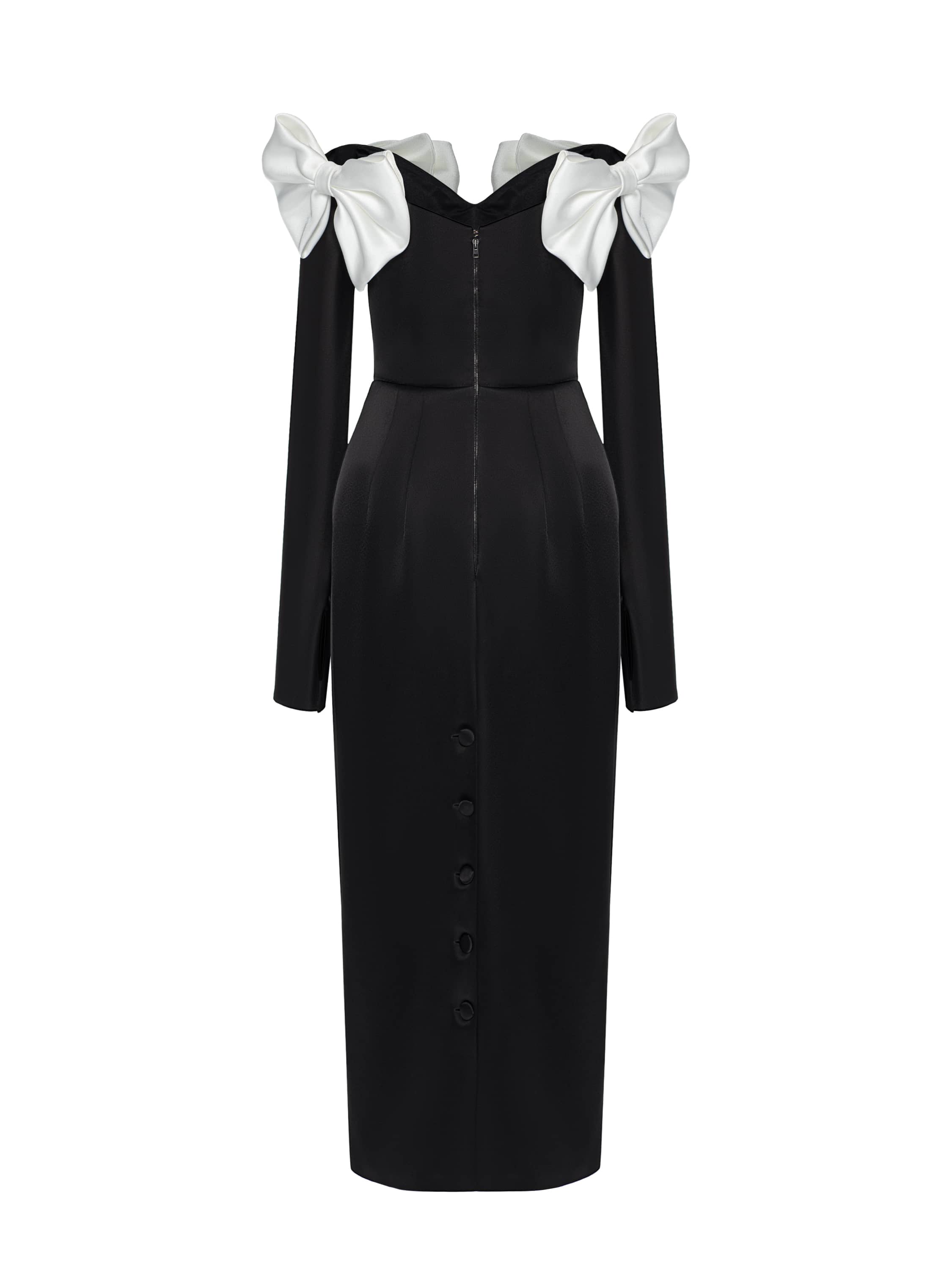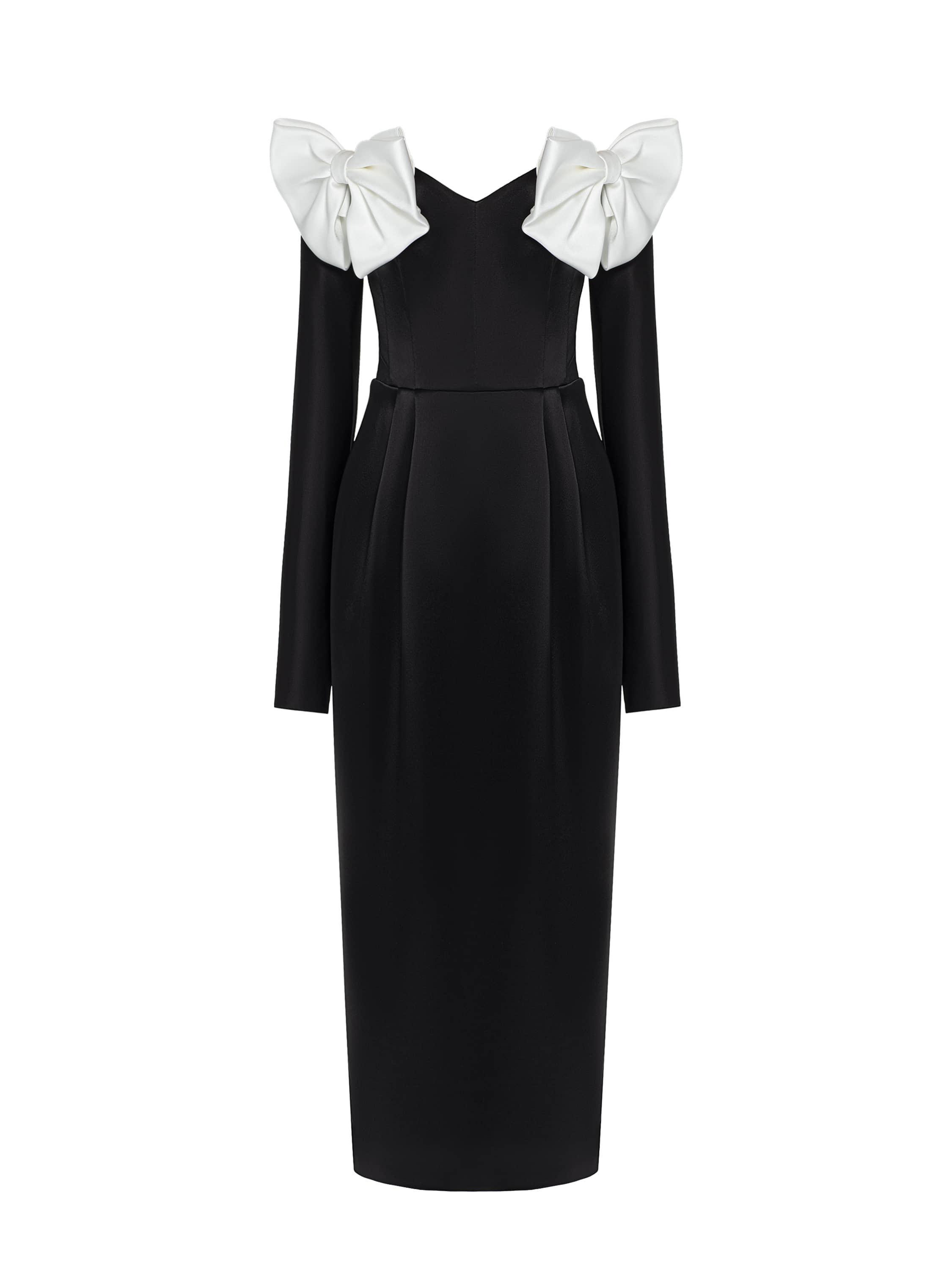 The black midi dress with voluminous bows on the shoulders is made of smooth silk fabric. The minimalist cut perfectly accentuates the silhouette, and the pleats on the skirt emphasize the waistline. Fastens with a back zipper.