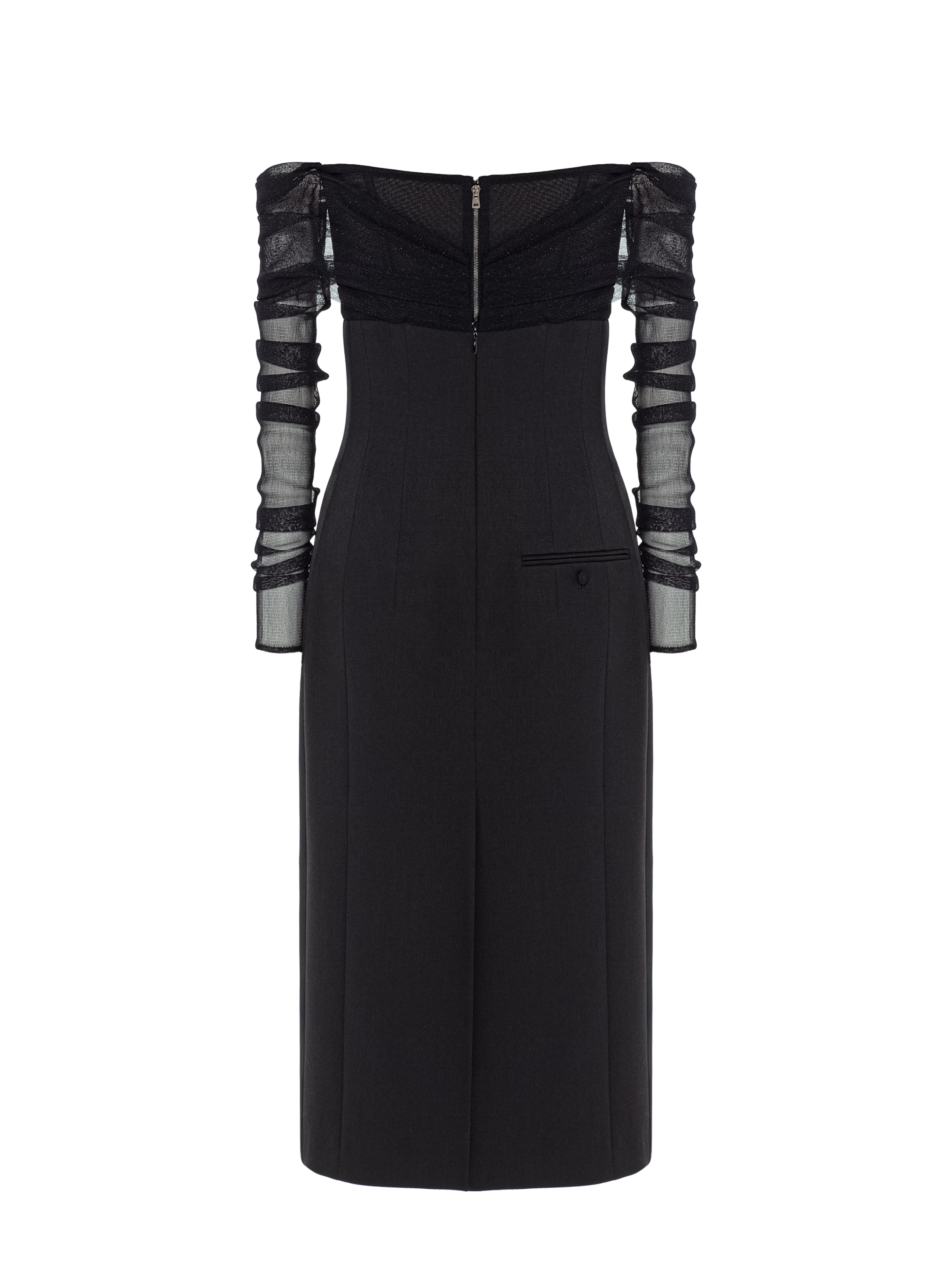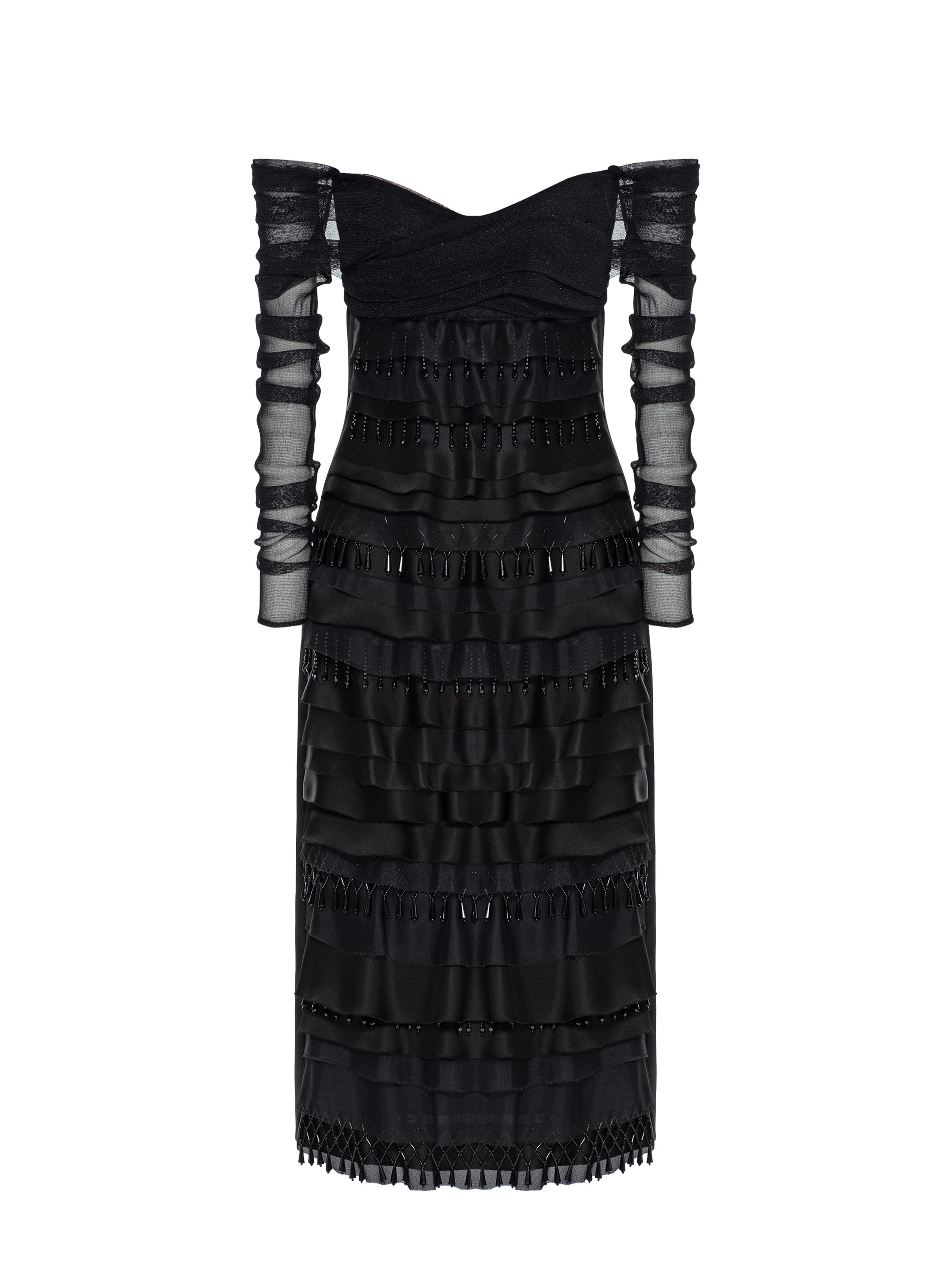 The black midi dress is made of wool suiting fabric with an emphasis on the open shoulder line. Mesh sleeves add lightness to the look, while textured tiers of organza decorated with handmade beaded fringe give the piece a special sophistication. Fastens with a concealed zip at the back.