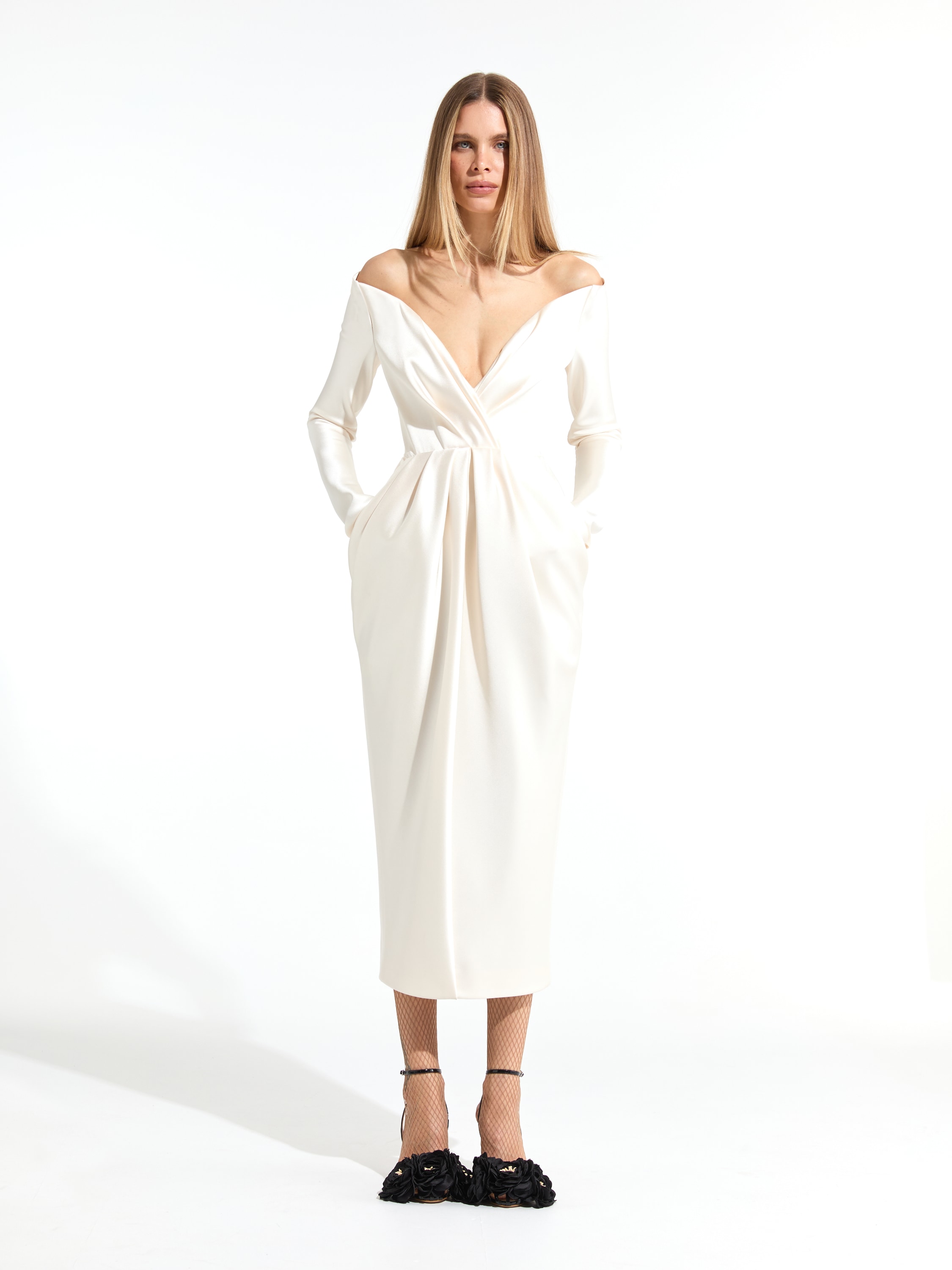 A midi dress in a noble milk‑white shade will create sophisticated look. The off‑the‑shoulder model features a deep neckline and expressive drapery. The waistline is accentuated with a wide matching belt. The dress has a concealed zipper closure at the back.