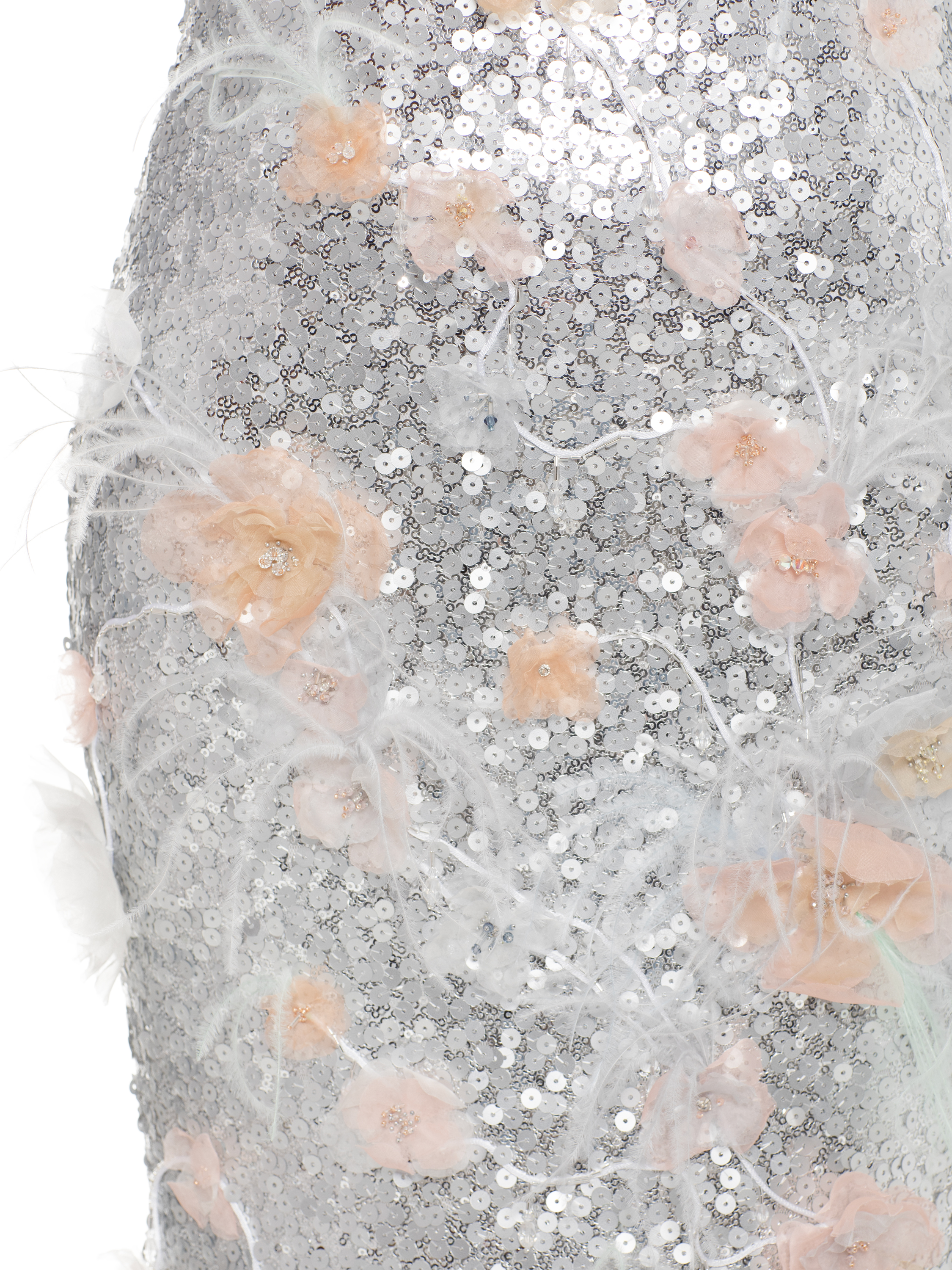 The evening dress made of mesh is completely embroidered with iridescent silver sequins. The figure-hugging silhouette emphasizes harmonious proportions and the beauty of body curves. The exquisite floral composition is handcrafted from organza and feathers by the Yana fashion house artisans in 103 hours.