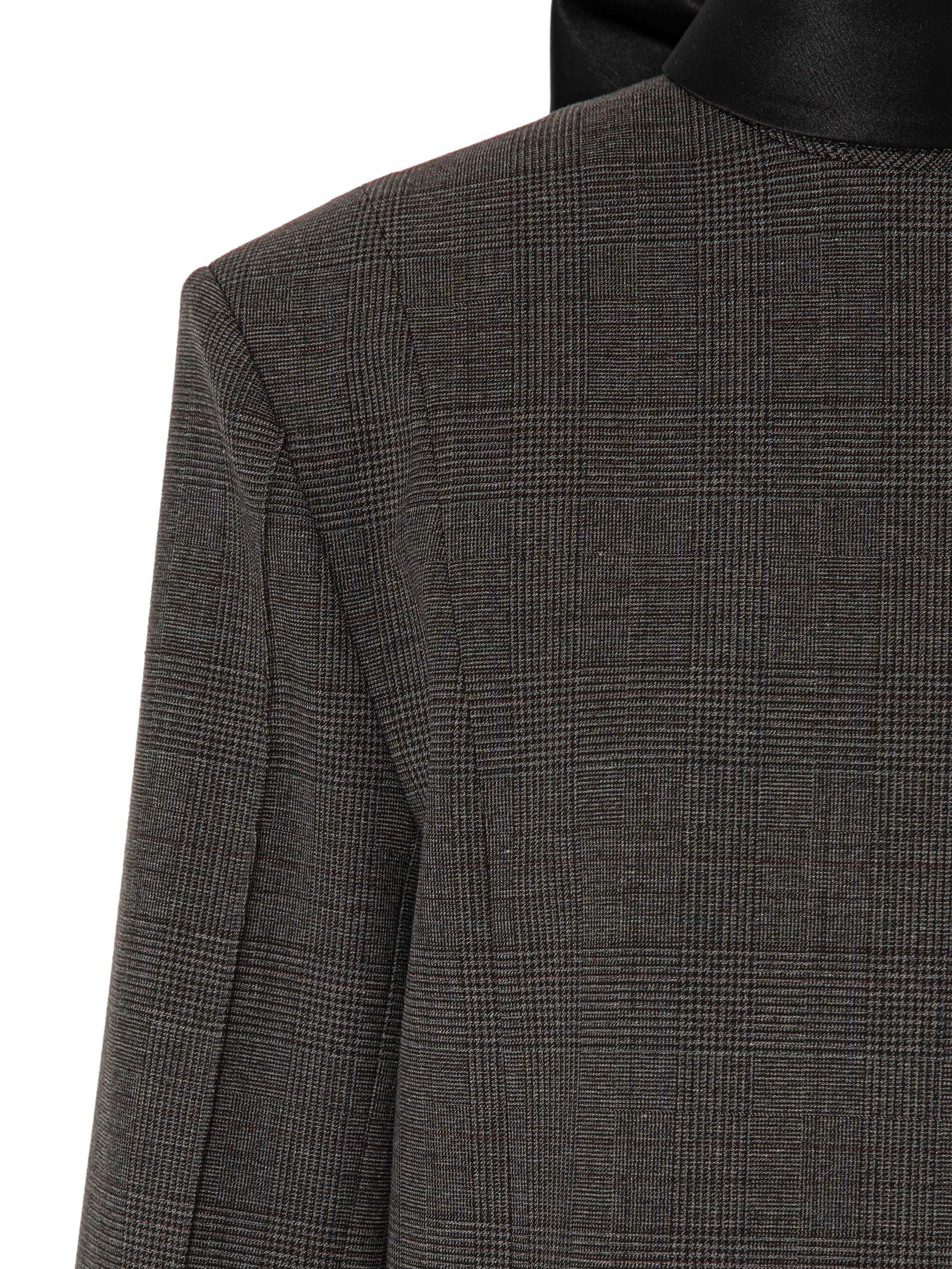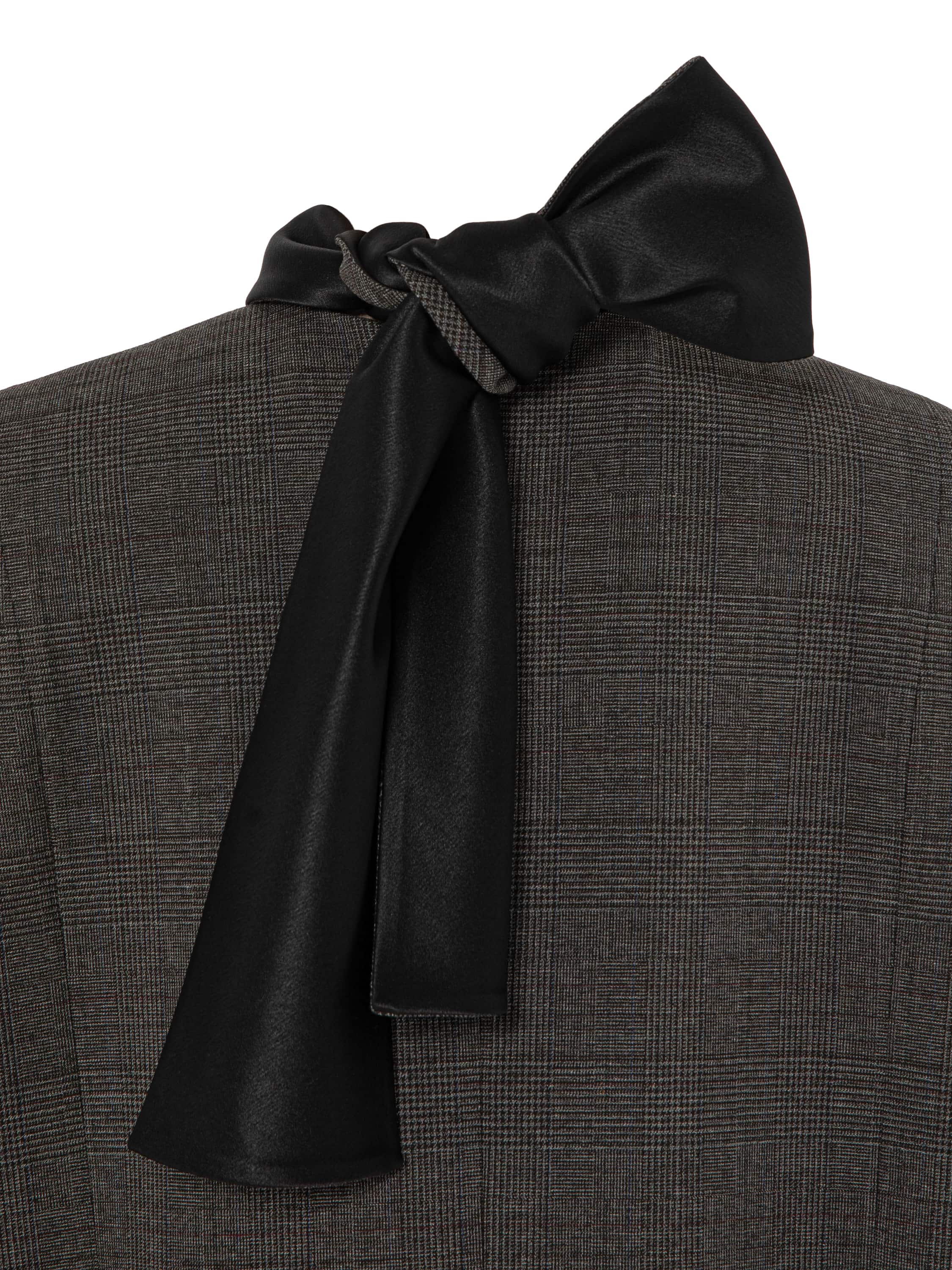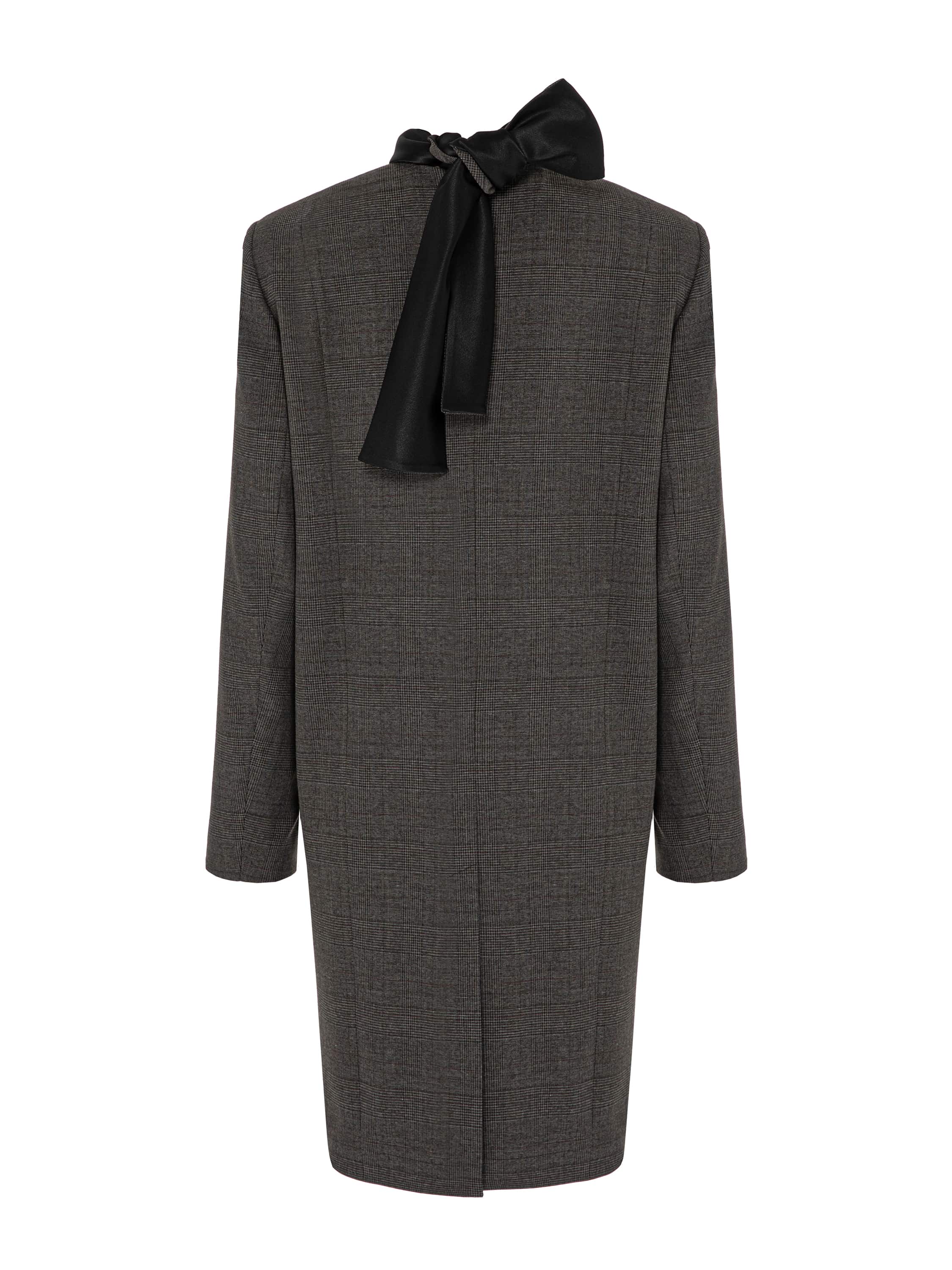 A strict grey mini dress with an accent on the shoulder line refers to the uniforms of the 1960s. This cut creates a sense of discipline and strength, and in the new YANA collection it turns into an elegant symbol of refinement and status. The model with long sleeves is complemented by a high stand-up collar that turns into long black ties at the back, which can be tied into a bow or an original knot.