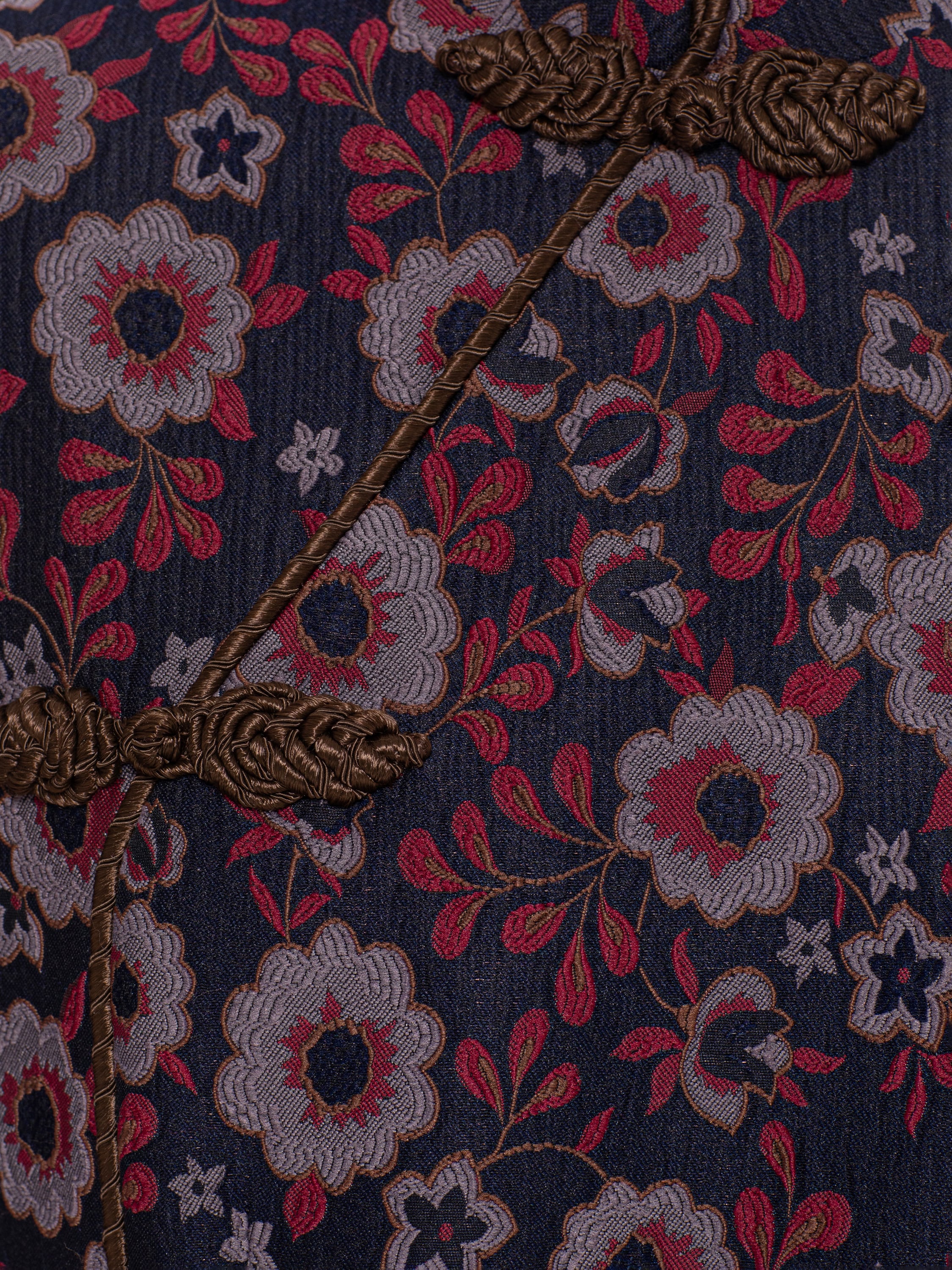 The elegant midi dress is made of jacquard with a floral print. The model is complemented by sleeves with mink fur cuffs and handmade toggles, which took the Yana fashion house craftsmen 20 hours to create. The dress fastens with a concealed zip at the back.