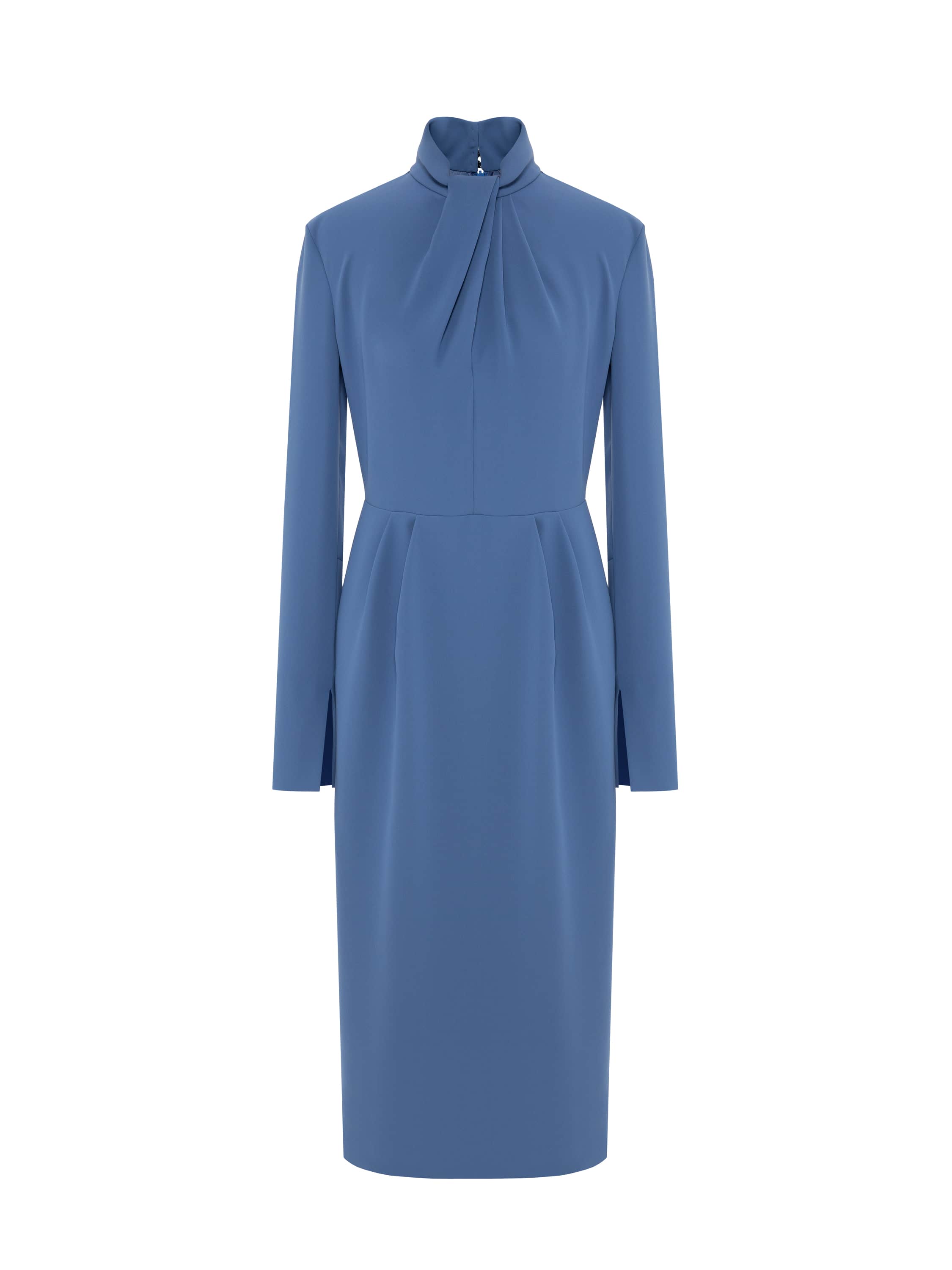A blue midi dress looks self-sufficient and needs no bright accents; it instantly becomes the center of attention. The style with a stand-up collar and soft draping on the bodice delicately hugs the upper body, flattering the figure. The clean cut and below-the-knee skirt length make the dress a suitable option even for events with a formal dress code.