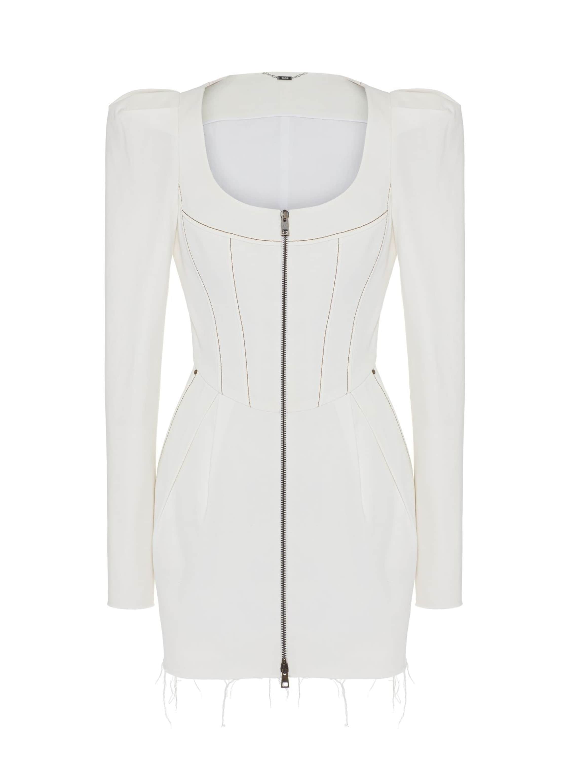 An elegant mini dress made of white denim will be the perfect choice for creating a stylish look. The laconic cut makes the model versatile for any occasion. Fastens with a zipper along the entire length at the front.