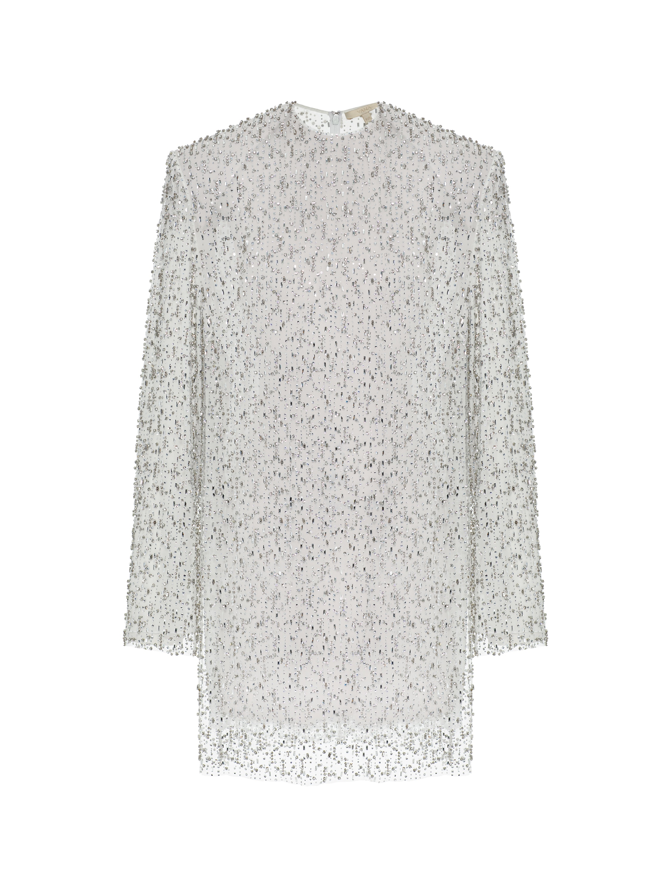 Evening mini dress with broad shoulders made of white mesh fabric. The model is decorated with shimmering crystals. Fastens with a concealed zipper at the back.