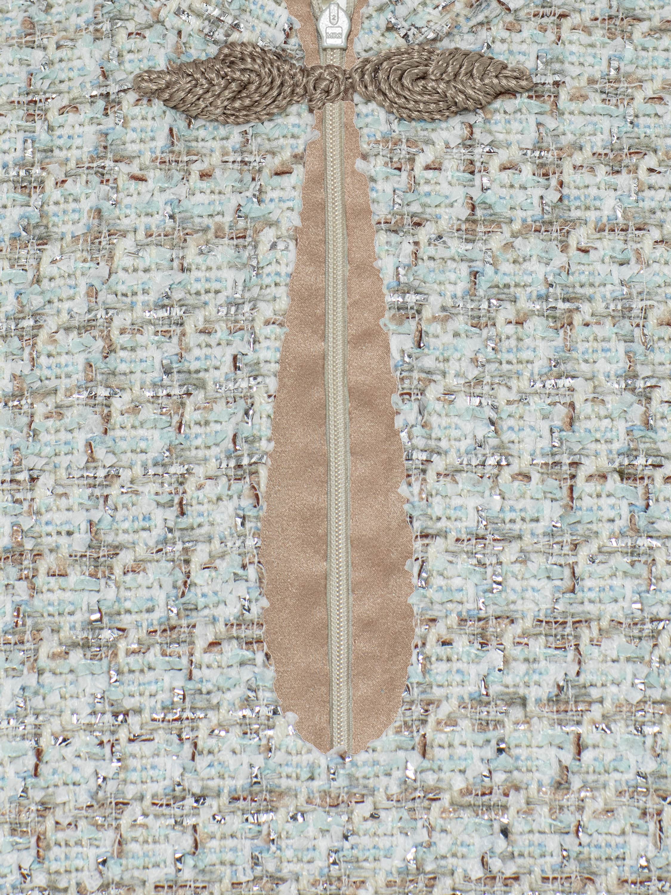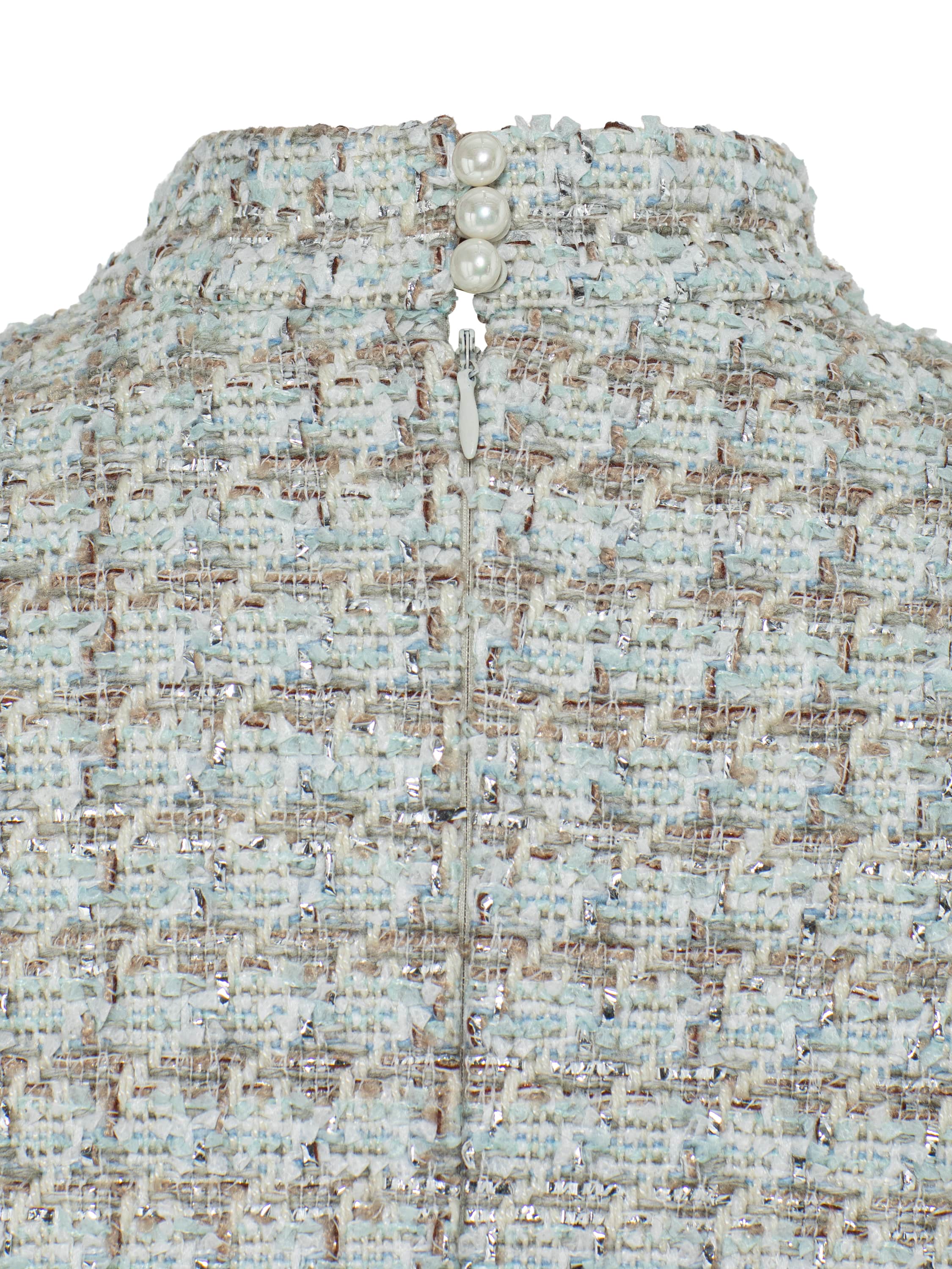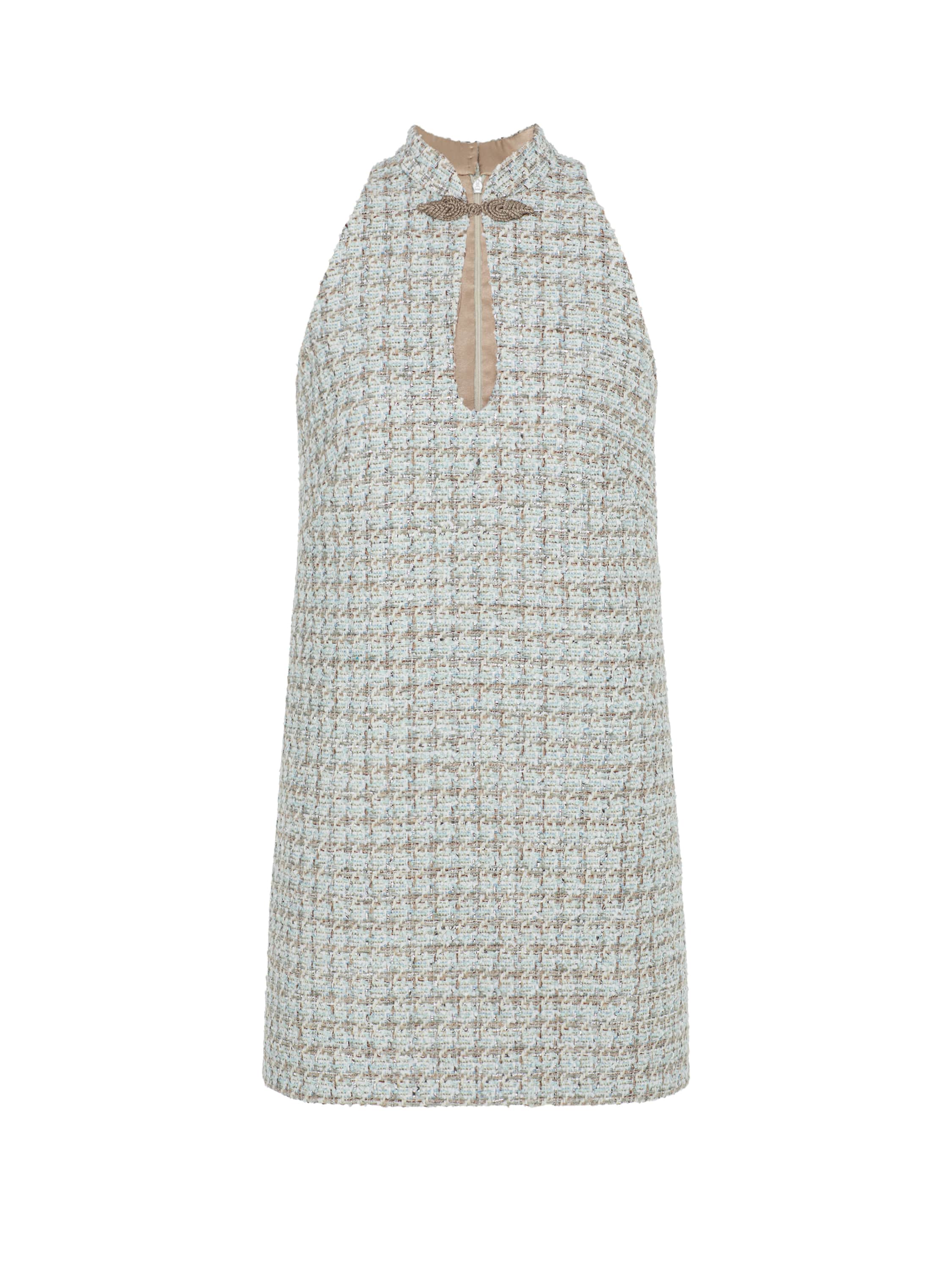 The beige-and-mint mini dress is made of tweed. The sleeveless piece is complemented by a stand-up collar; the keyhole neckline is accentuated by a hand-crafted clou fastening. Fastens with a concealed zipper at the back.