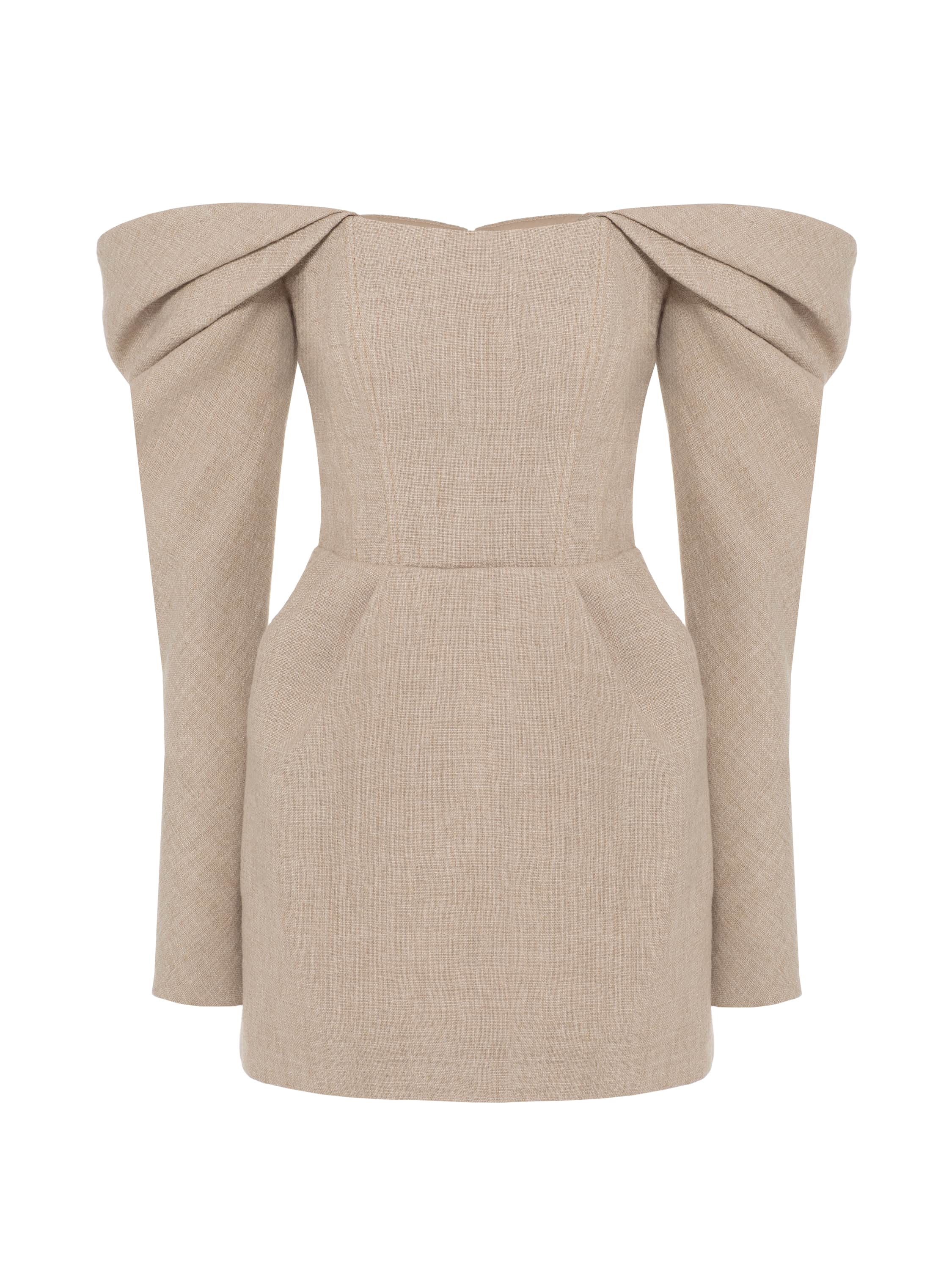 The beige off-the-shoulder mini dress with long dropped sleeves is made of linen fabric. The model with an accent on the décolleté area gracefully emphasizes the figure. Fastens with a zipper at the back.
