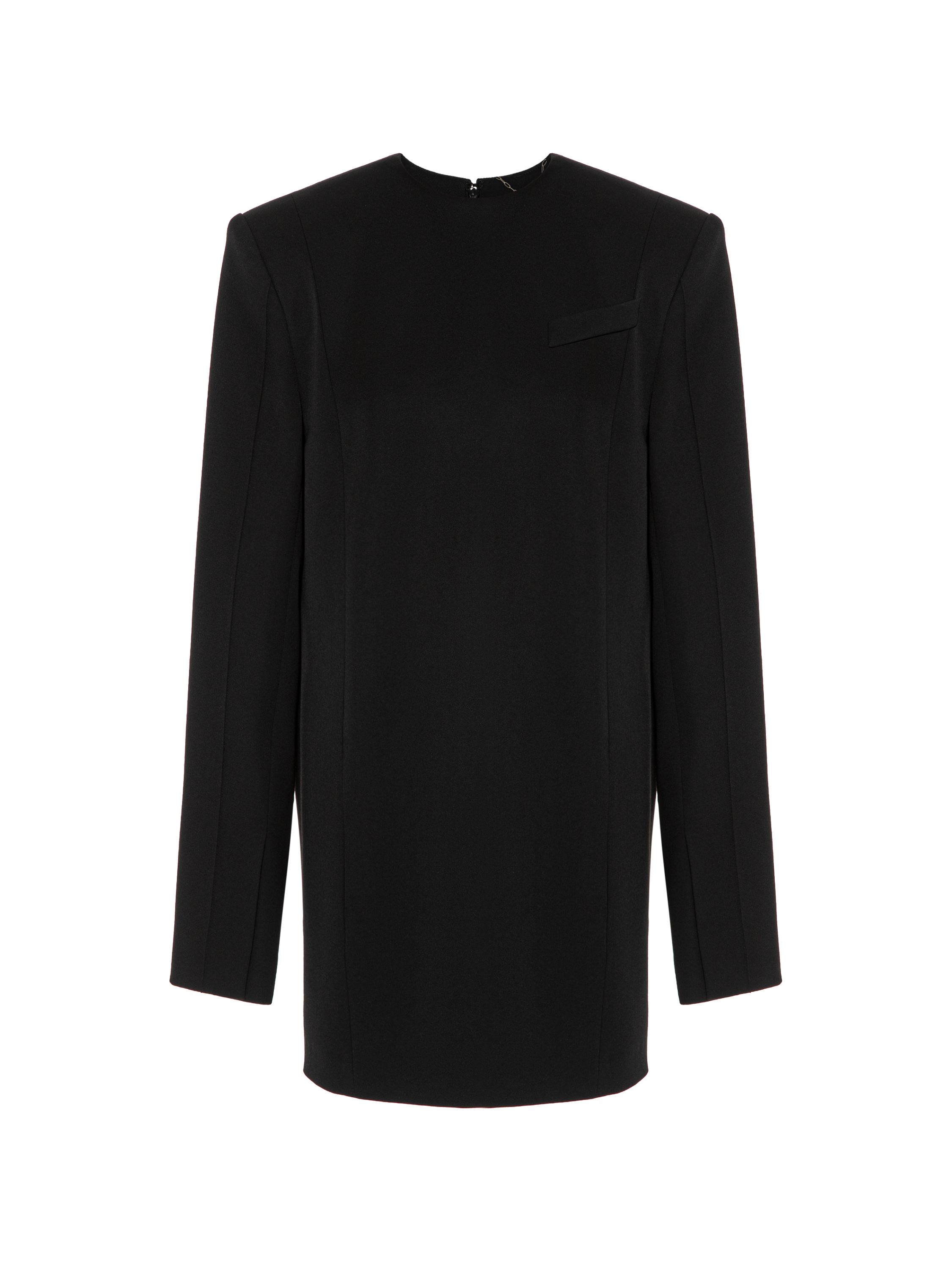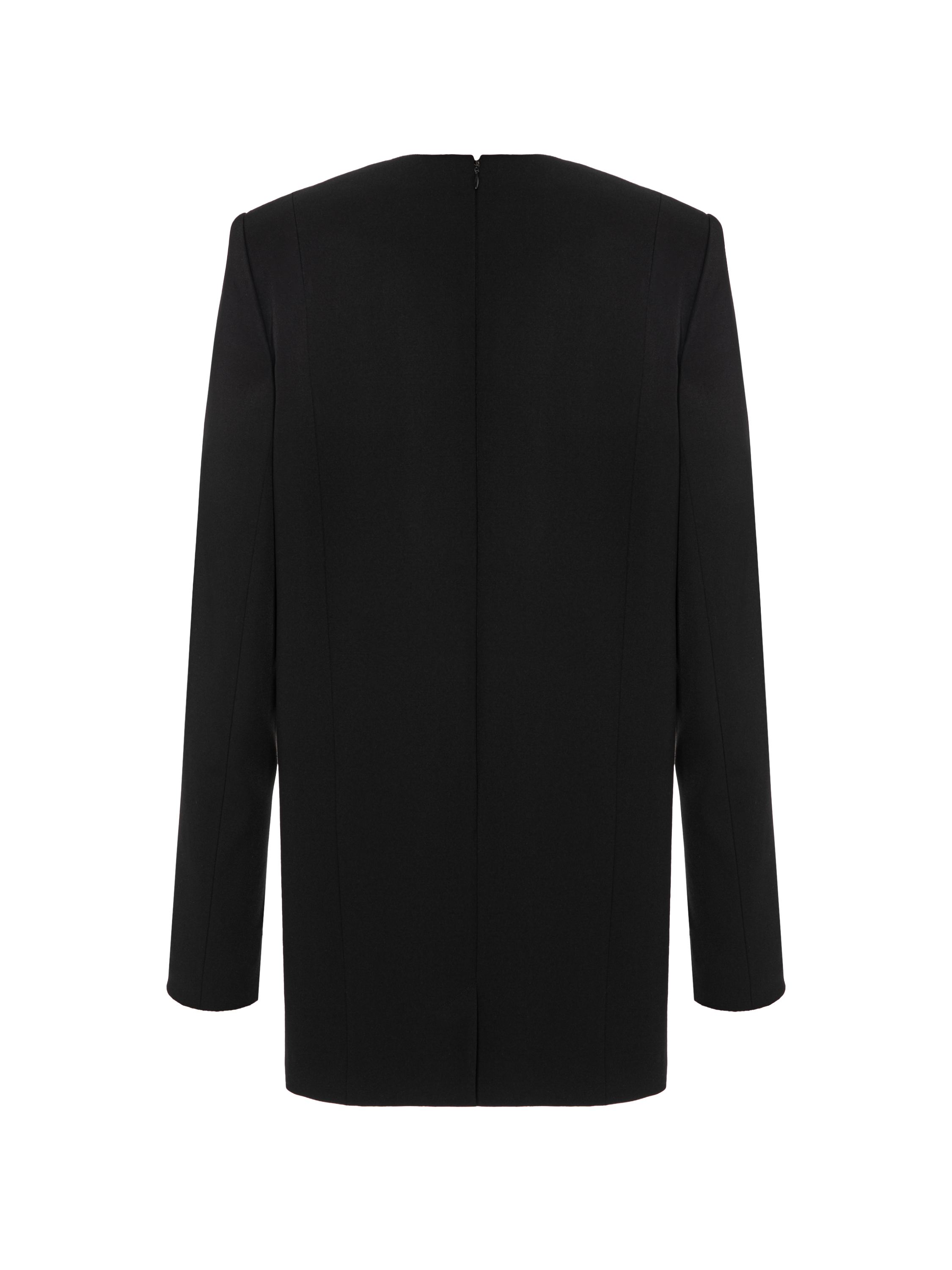 A minimalist mini-length dress is made in the style of a blazer from wool suiting fabric. Durable polyamide and elastane are added to the composition of the material, which guarantees longevity and a flawless fit. Tailoring details — shaped seams and pronounced voluminous shoulders — give the model a strict character. Fastens with a concealed zipper at the back.
