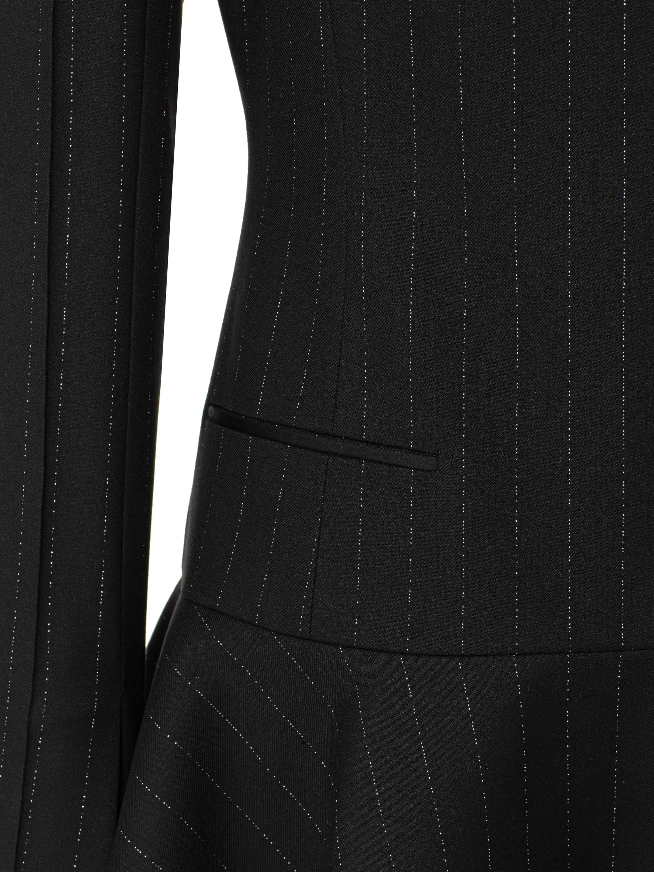 The strict black striped mini dress with accentuated shoulders refers to the uniforms of the 1960s. This cut creates a sense of discipline and strength, while in the new YANA collection it becomes an elegant symbol of refinement and status. The long-sleeved design is complemented by a high stand-up collar flowing into long ties that can be knotted at the back into a bow or an original knot.