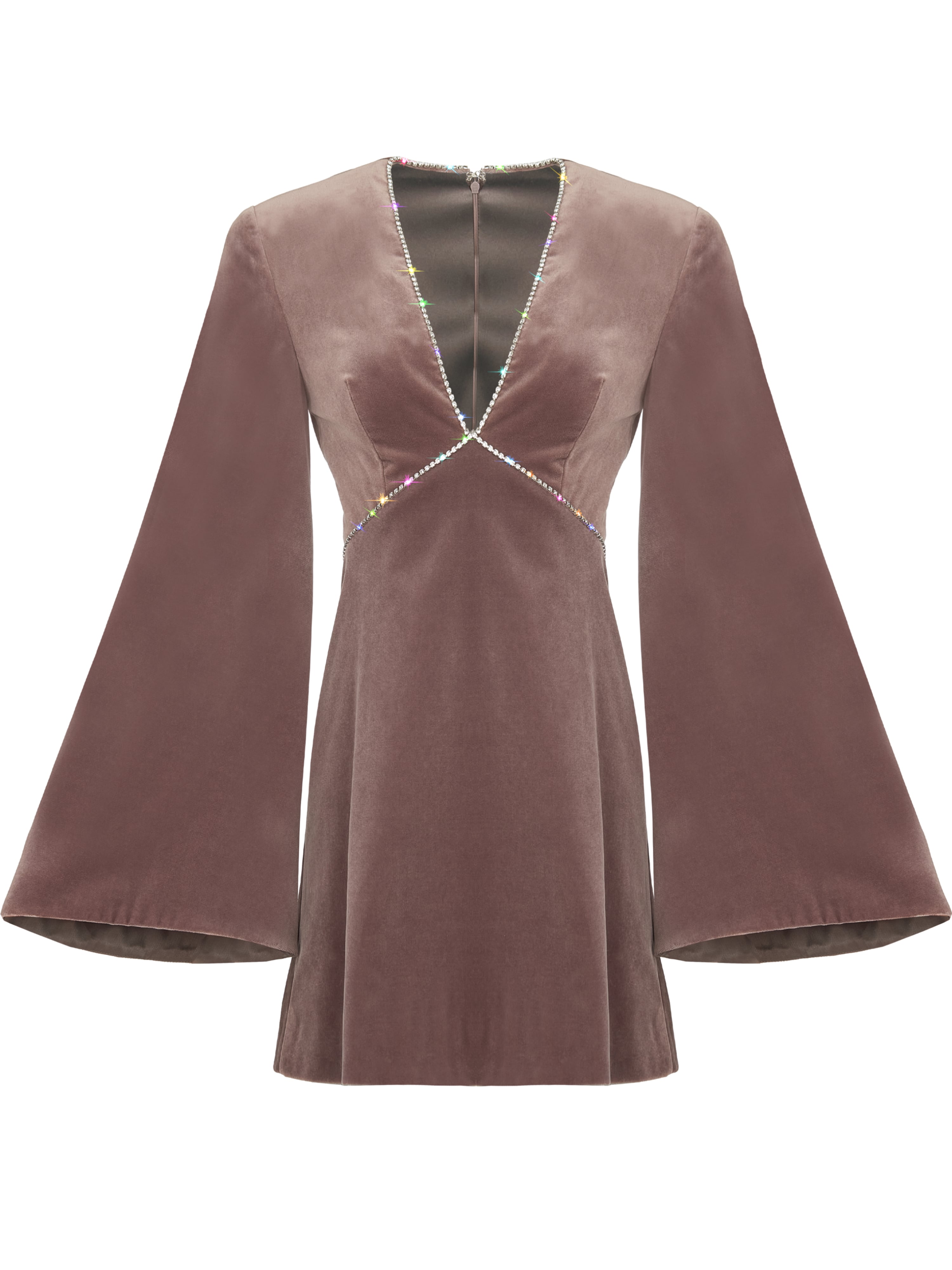 A lilac velvet mini dress with a V-neckline and long flared sleeves. Finished with crystals along the neckline and on the waist. Zip fastening at the back.