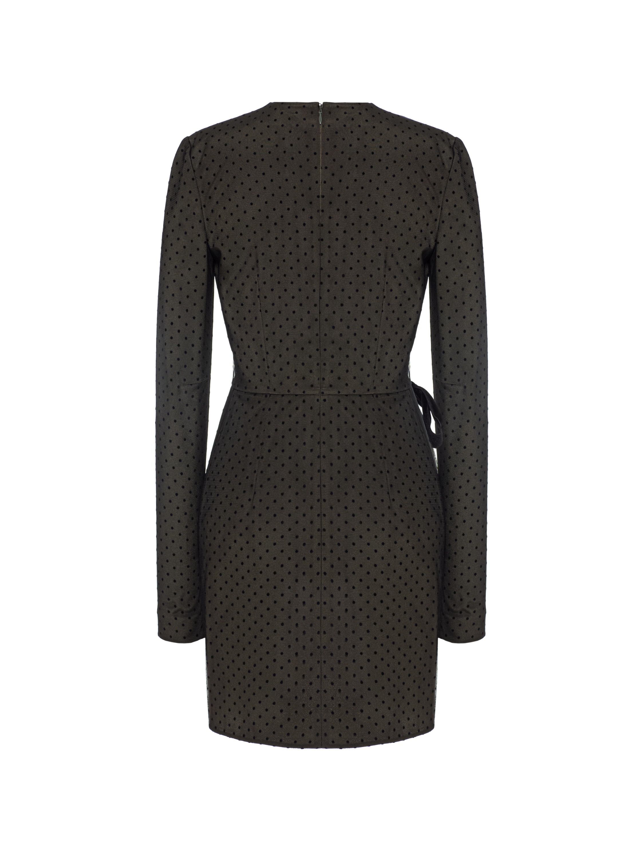 A laconic khaki polka-dot mini dress is an everyday option suitable for any occasion. The model with a wrap skirt and soft draping is complemented by an accent black side bow. Fastens with a concealed back zipper.